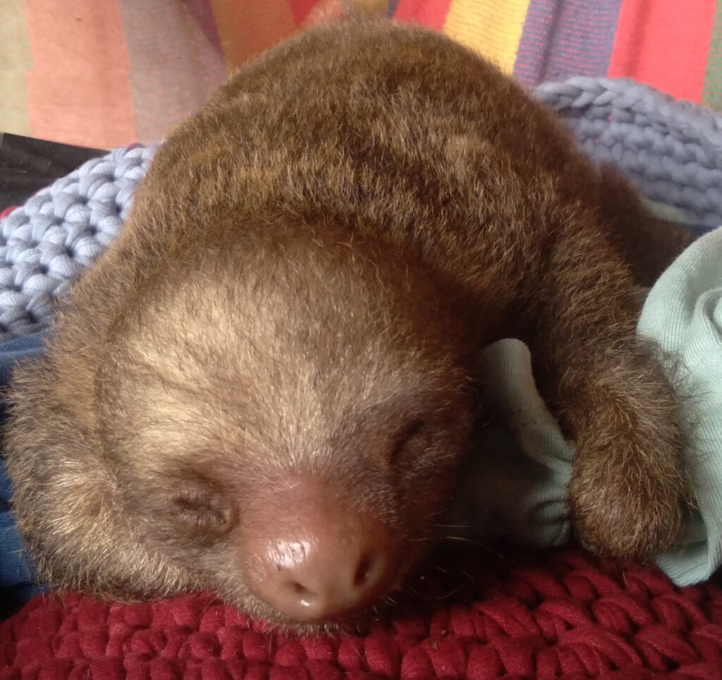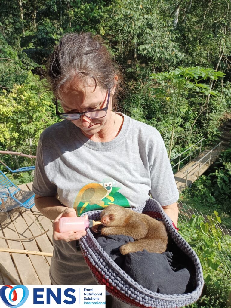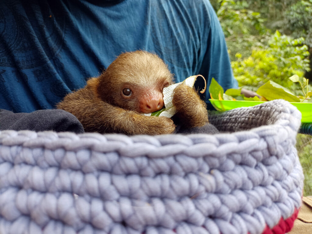 We don’t get a lot of time for mourning, as there’s always someone else in need of a helping hand. We present to you Kelso: Another cute baby came, a two-toed sloth. At only a couple of months, he’s in the experienced care of Douwe and Olivia. Munching away at fresh and steamed leaves and adjusting to the goat milk Douwe brought back home, generously donated by the Emmi Nutritional Solutions International from the Netherlands. Thank you, we already have been able to raise several animals with your milk!