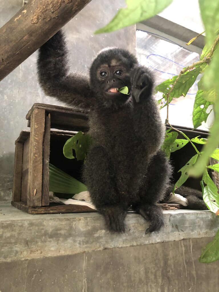 Kaluha (female woolly monkey) was brought into the clinic to remove two botflies from her arm. As she’s also struggling with the well-known parasite P. Elegans, we decided to keep her a bit longer for some extra care and treatment. She sure loved the attention at first, but she’s happier to be back with the rest of the bunch!