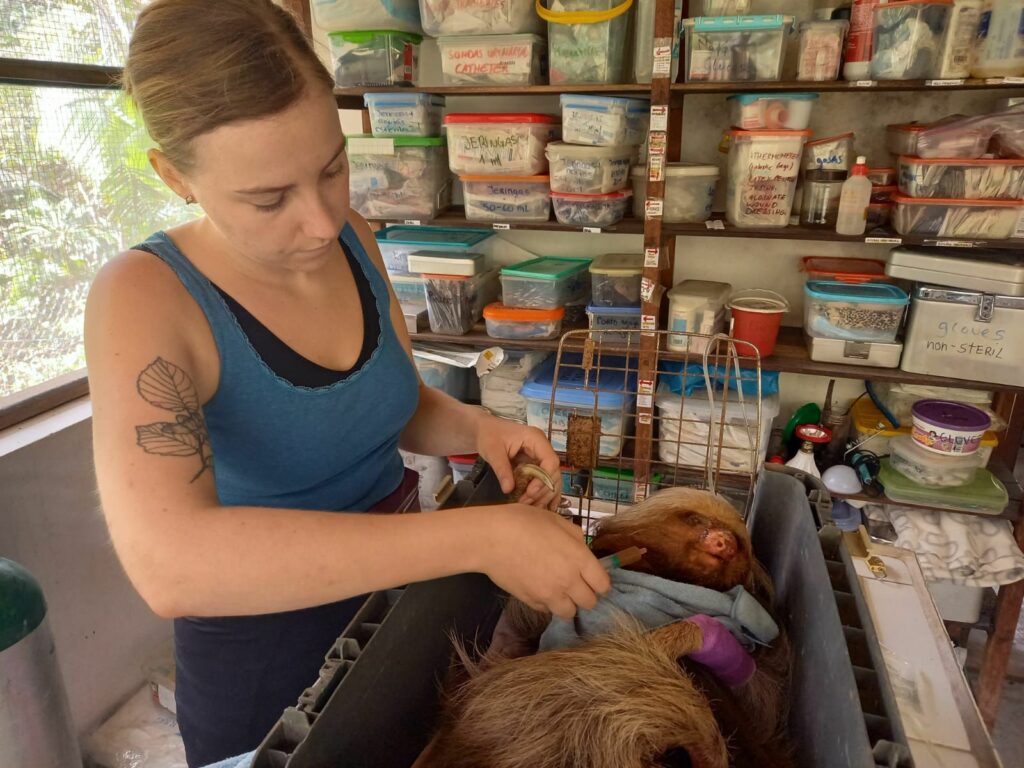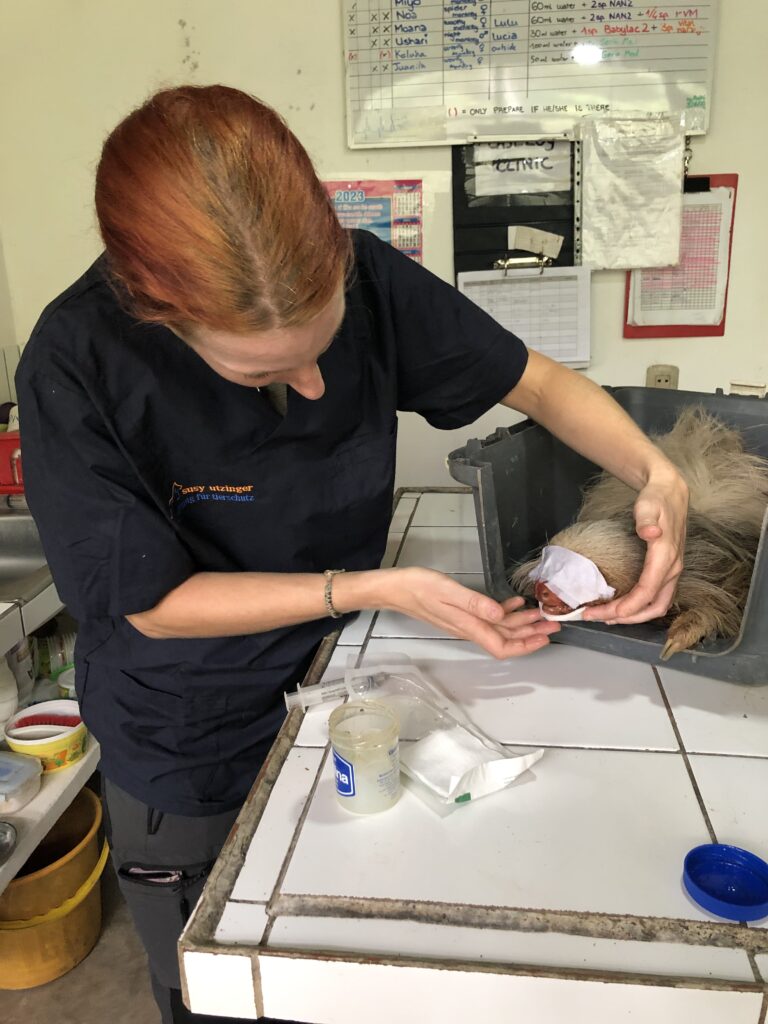 Representatives from the authorities took a 6-hour trip to EV to try and help a severely injured two-toed sloth. She was found on the ground, most likely fallen after touching electrical cables. She had severe burns on all extremities and the face. Our vet team, under the coordination of our new long-term veterinarian Sam, took her into intensive care immediately. Unfortunately, the burns were severe causing intense suffering. Her legs seemed to be paralyzed with no sensation, making a full recovery very hard. After several consultations with specialists, we decided it was time to let her go.