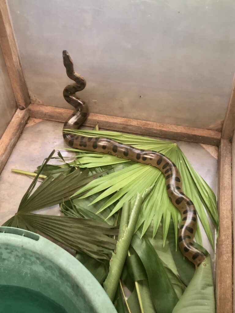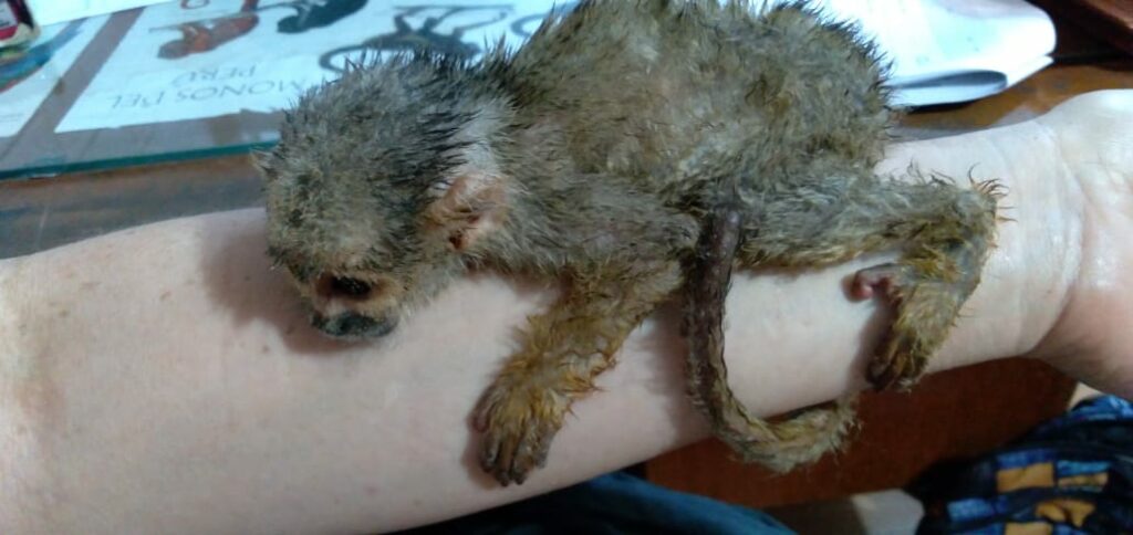 Other newcomers are an anaconda, a yellow-footed tortoise, and a young squirrel monkey. The anaconda was very recently taken from the wild. So, we aren’t surprised he refuses the food given to him – a quick release is already in the plans. The tortoise does not look too good and we hope she will respond well to our care. The young female squirrel monkey, Mina, was kept for some time in a small cage, resulting in very sticky, dirty fur, and the top of her tail missing. Cold and dirty she was happy to climb directly to the safety of Olivia’s arms. After a gentle wash, she is already looking better, and with some good nutrition and care, she will look like a normal squirrel monkey soon enough again. For now, she is under Olivia’s supervision at the family house.