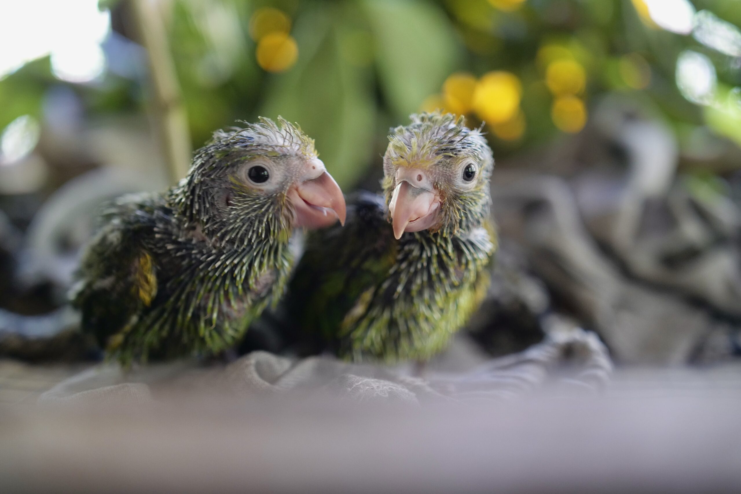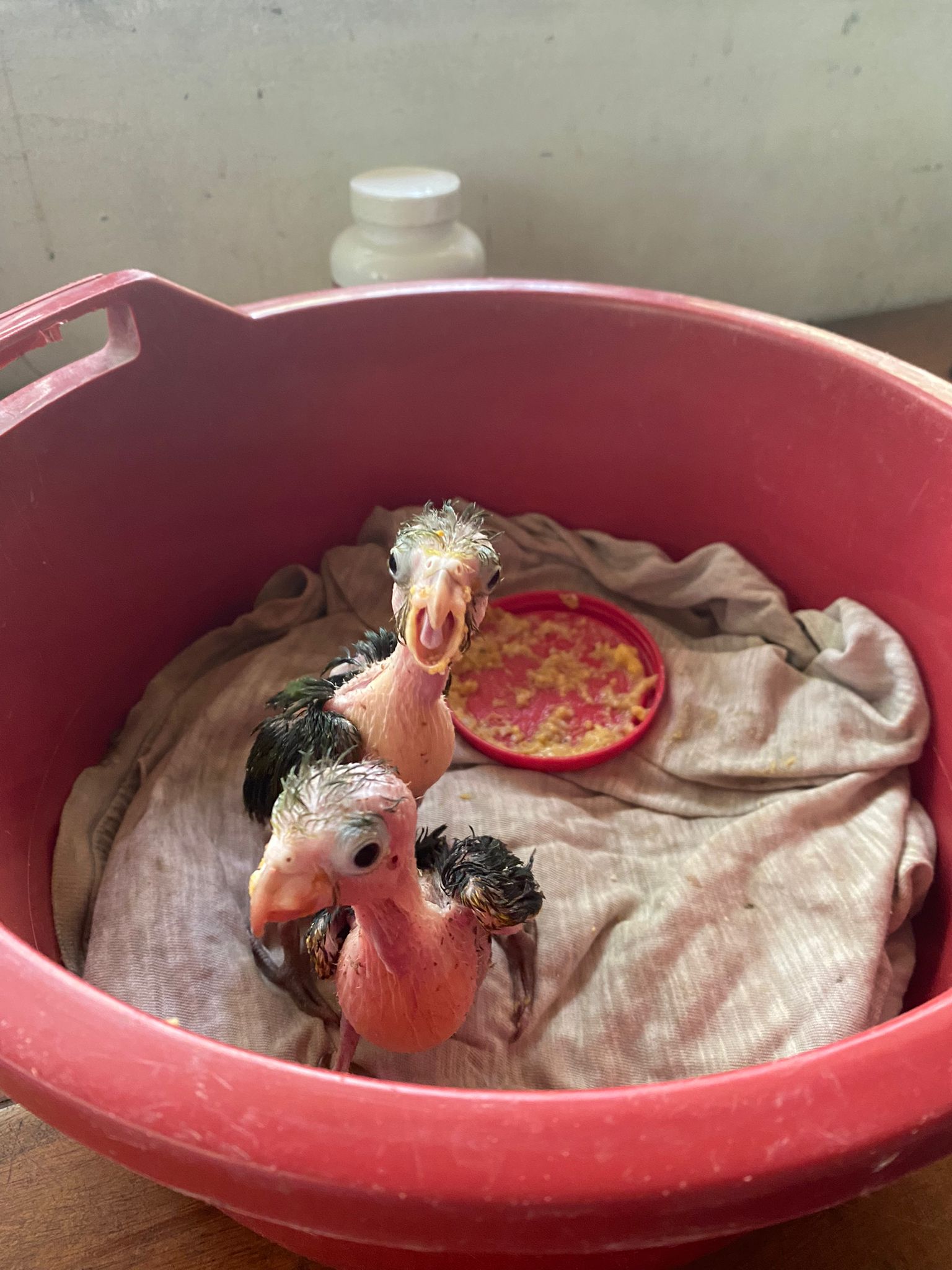 Two baby cobalt-winged parakeets, Hano and Gado, have joined us in the clinic. They were still partly featherless and blueless, but we are doing everything we can to get them flying soonish…