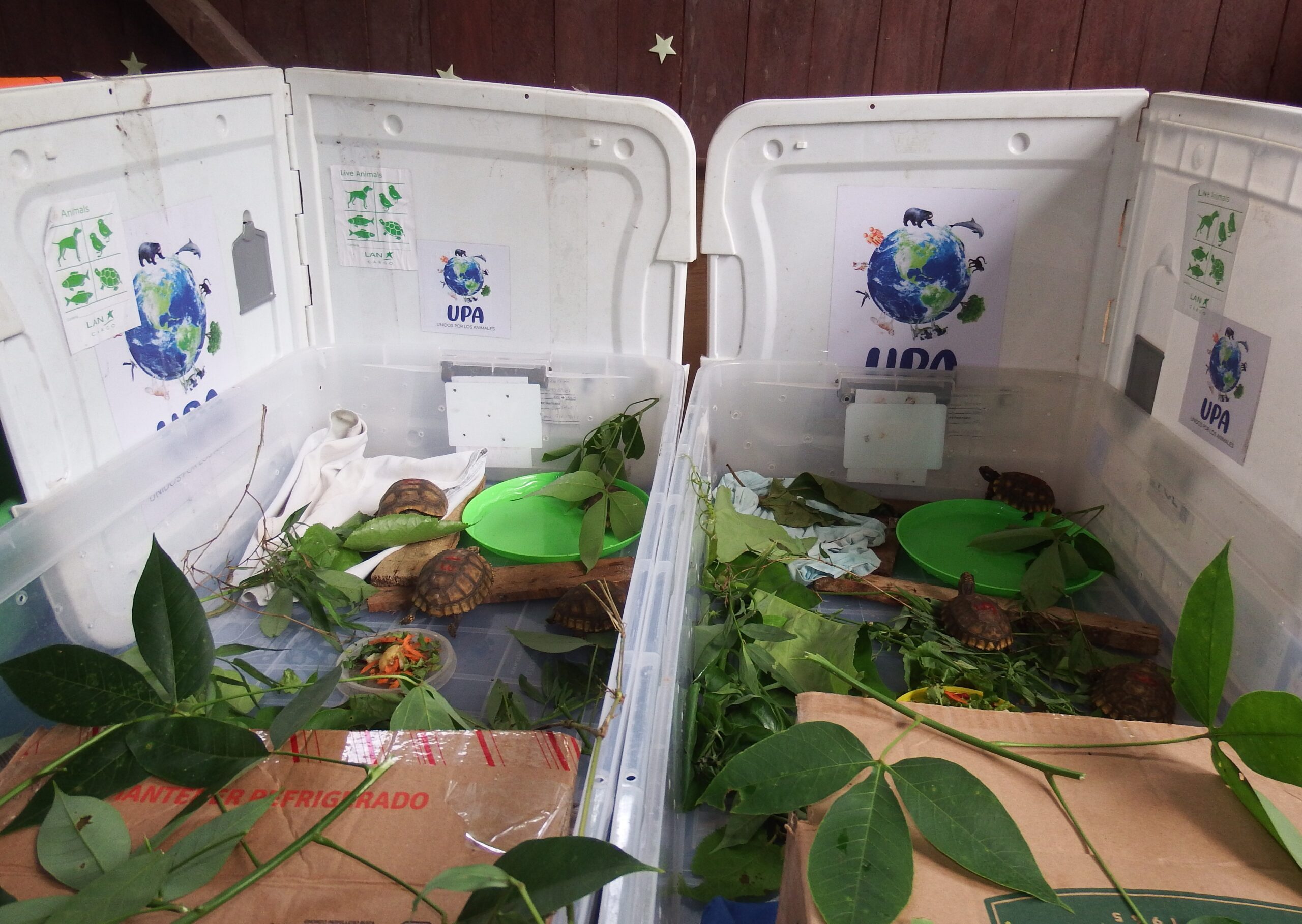 UPA (a Peruvian Animal Charity) reached out to us with the news that a large group of reptiles had been confiscated at Lima airport, and they wanted to know if we could take them in. Alongside a representative from the Peruvian ministry of Flora and Fauna – Douwe, Dylan (veterinarian and reptile specialist) and Anna (volunteer and professional videographer who made this : https://m.youtube.com/watch?v=8m1sVTes2Bc) went to Pucallpa Airport to retrieve the scaly, cold-blooded, egg-laying but oh-so-cute creatures.