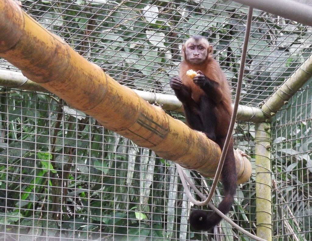 Yanamayu, one of our enclosed adult large headed capuchin males, was not doing well in the Rimaq enclosure under the dominance of female Kres (female adult capuchin), who hardly allowed him to get to the food. With Kamayo (Humboldts woolly monkey) having La Sapa enclosure to himself, the decision was made to put them together (as they have been together in that cage in the past). Kamayo is dominating in the cage La Sapa, however, as his nature is very relaxed, we hope that the change of location will benefit Yanamayu’s health and give him an opportunity to put on some weight.