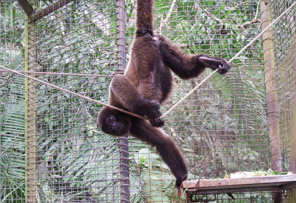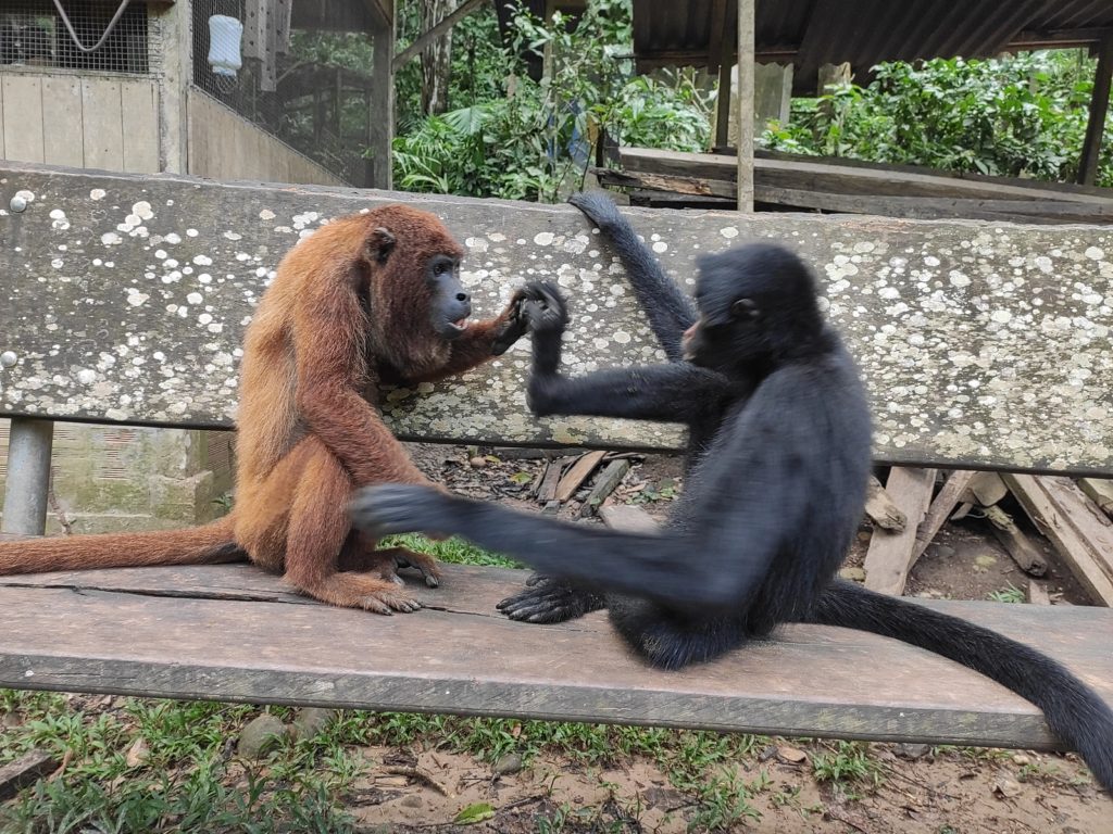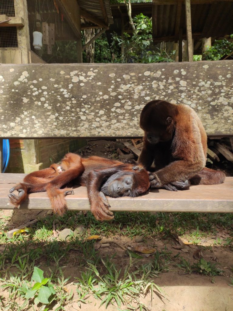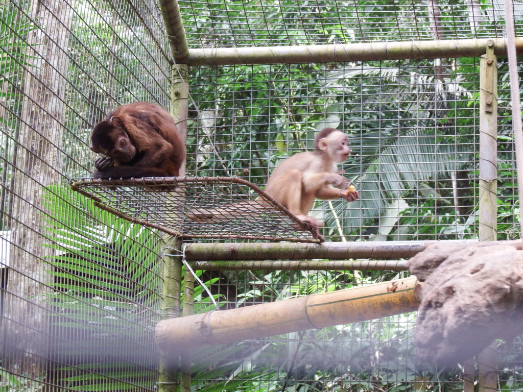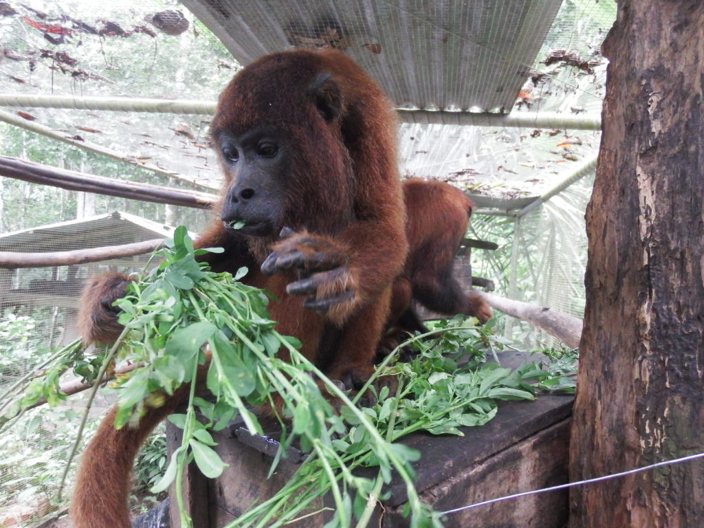 Often a favorite with volunteers Armando and Darwin are our resident Jurua red howler monkeys. Howler monkeys often require a lot more personal attention when they arrive at Esperanza Verde as they have special dietary requirements in addition to being very sensitive to stressful situations. Both Darwin and Armando still spend their night in the security of Lulu enclosure, before being let free every morning to roam throughout the day. This allows us to control their diet, feeding them leaves from the forest and vegetables in their cage, as outside they are more likely to eat foods which are great for the other monkeys but are not great for their dietary requirements. Darwin is doing great, and is a happy monkey, seen playing with several of the other monkeys, woollies, spiders and some of capuchins. Armando has a total different character; you could call it laid back or less social. We just hope it is the first, although sometimes we think the only thing he wants to do is lie around in the sun or be a baby again and lay in the arms of a surrogate mother, which used to be us! He does hang around with some of the woollies, who love grooming him and laying next to him. His weight gain is not very regular and gives us a lot of concern, we just hope that we really can teach him that you don’t need humans to make your life better and get him stronger!