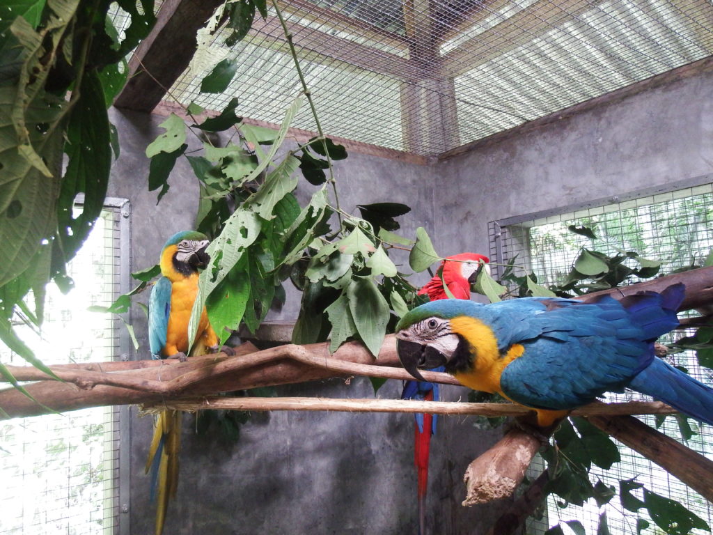 The two blue and yellow macaws and the scarlet macaw will stay a bit longer in the clinic, while we prepare the outside aviaries for their introductions. We regularly have to renew some of their branches as otherwise they try to use our heads as one! Not an easy cage to clean, while trying to avoid their sharp beaks.