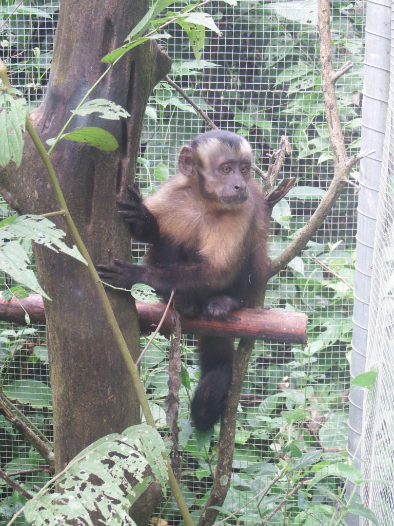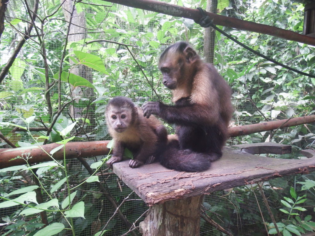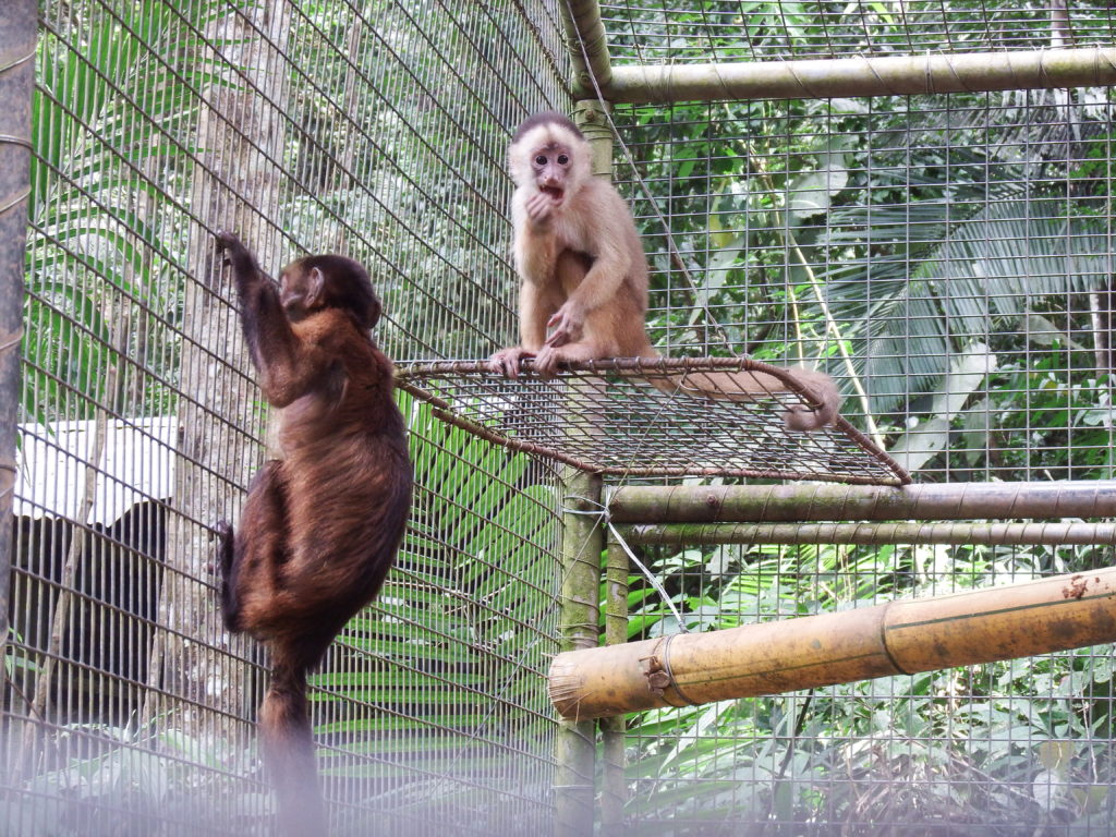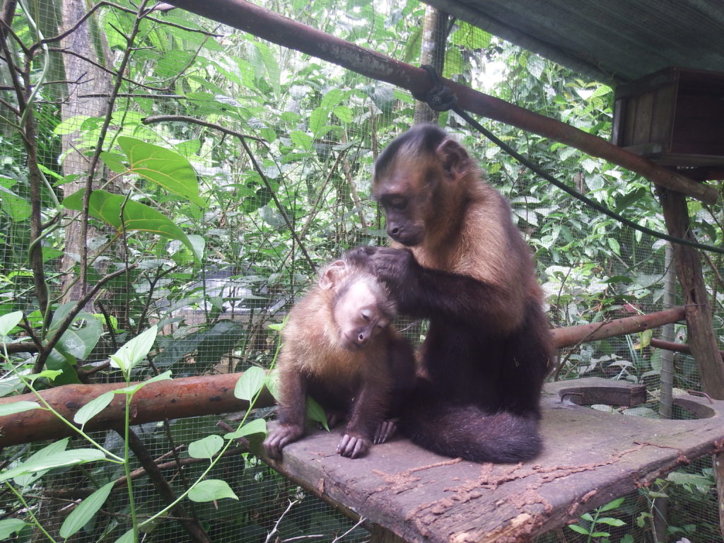 One of our biggest concerns was the very young (large headed capuchin) male Kiro. To ensure his future well-being, we decided to take one of the outside female capuchins to join him in one of our outside cages; one which would protect and care for him, and hopefully will keep doing this after his release. There is no better monkey for this job than all-round experienced and first monkey (large headed capuchin) at Esperanza Verde: Mica, a female of now almost 11 years old. Mica was not all too happy of being encaged but with such a playful and needy youngster, we hope she will adjust and take care of him so he can slowly adjust to the surroundings and the outside monkey group before his final release. The first night might have been tough on both, but the second night they spent together Kiro was warmly on Micas back, a great sign that they are comfortable together.