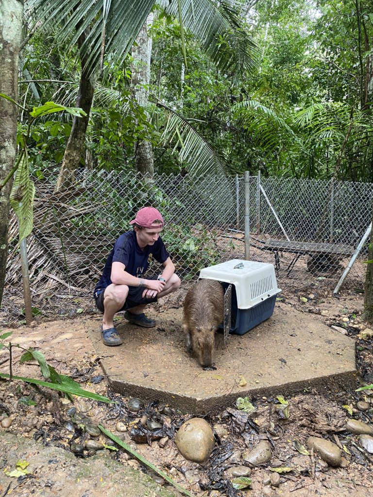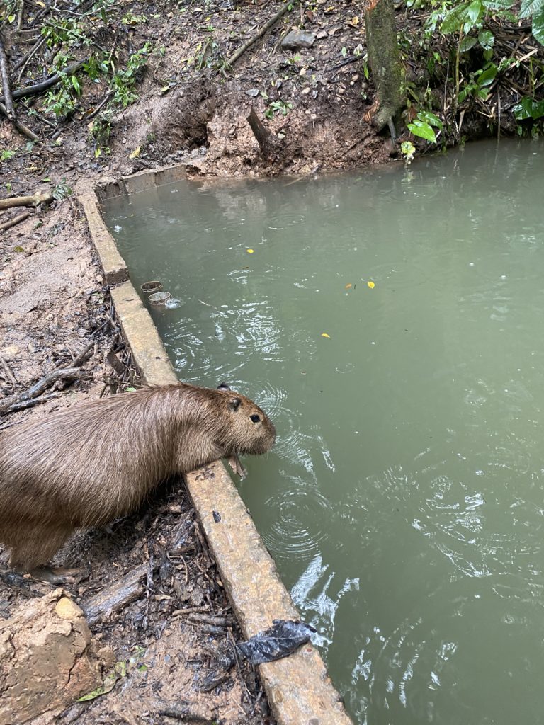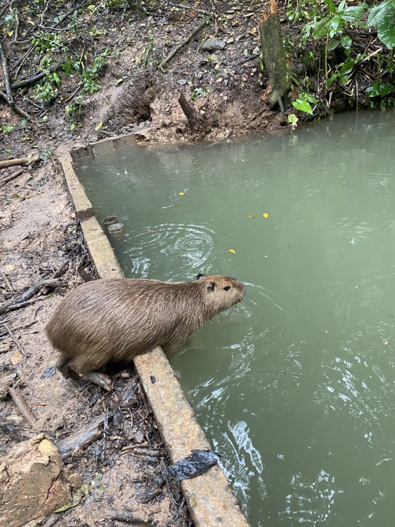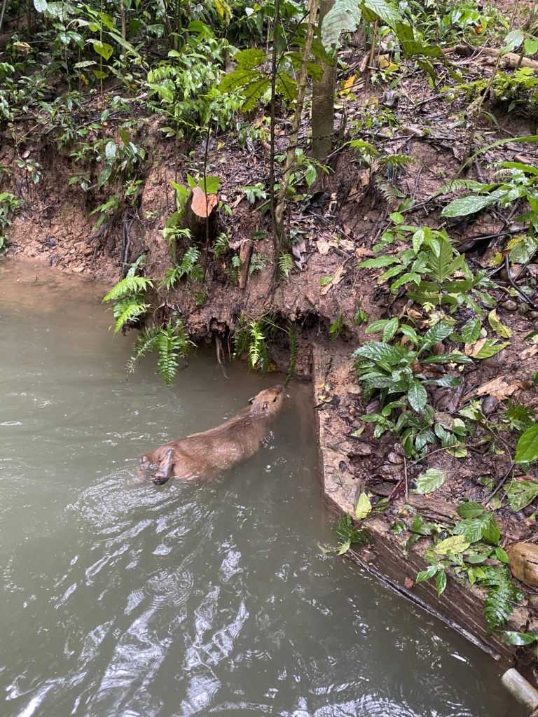 The improvements to Rincay enclosure were completed this month, the huge task involved replacing all posts and installing a more reinforced fence that will withstand the mud slides rainy season can bring. Rincay was previously being used to house non-climbing animals such as tapir and deer, giving them a large area to roam around in, with lots of leaves to forage for. This meant it was perfect for Bronco’s (juvenile male capybara) next step! He is loving the freedom the bigger enclosure brings and while he is no Michael Phelps, Bronco is often seen practising his swimming technique and loves to cool down in the big pond.