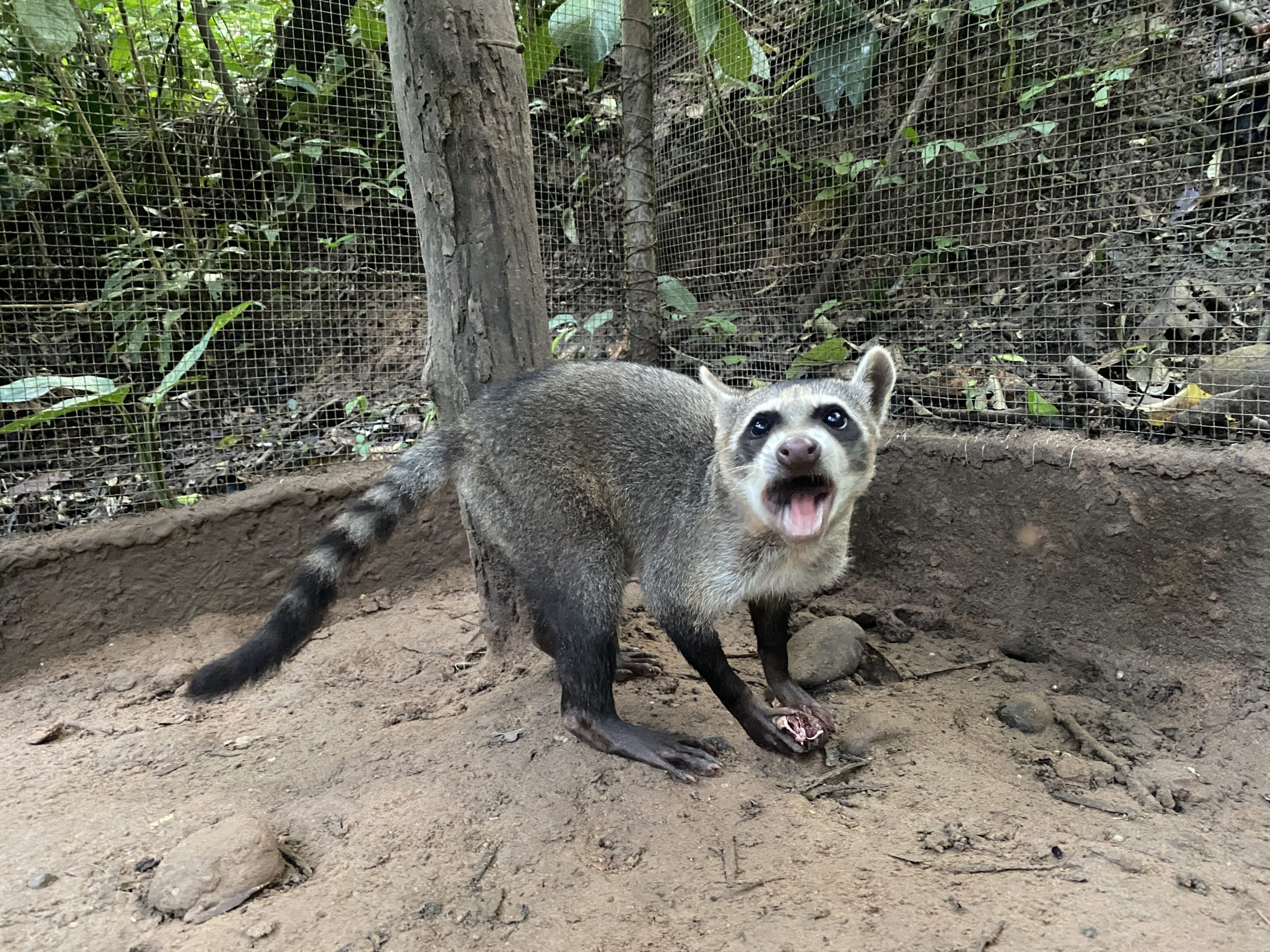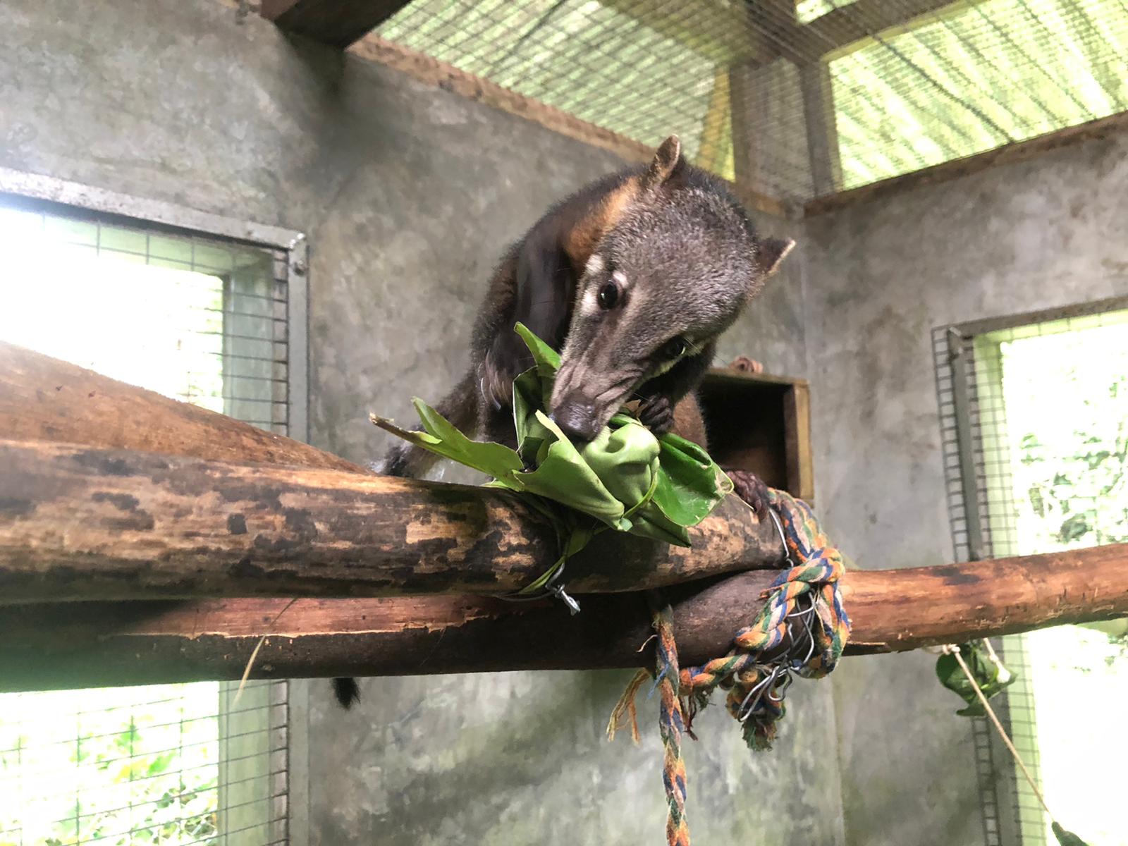 We welcomed another new arrival this month, Sencha the juvenile female coati. She had been kept as a pet for the most of her young life and is estimated to be around 3 or 4 months old, meaning she is extremely tame and completely unafraid of humans. Her playful and lively personality, which is typical of tame coatis, is keeping the volunteers on their toes and our plan is that she will soon join Sumo (adult male coati) outside.