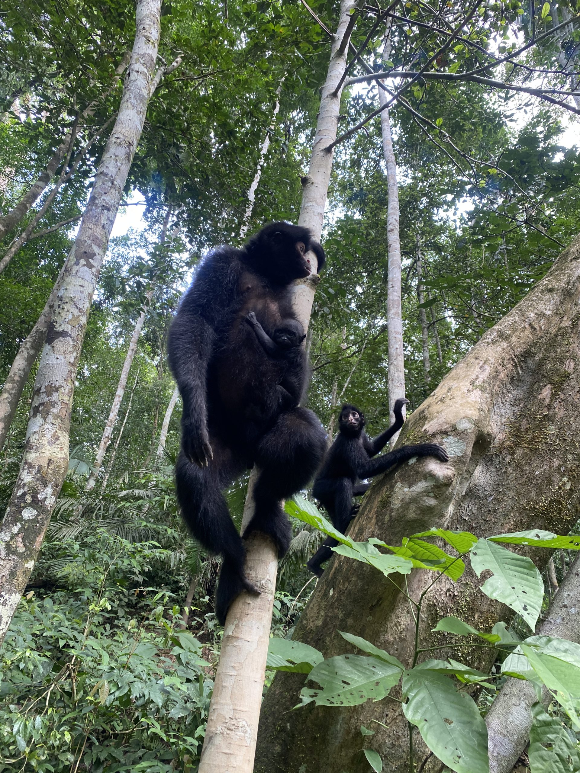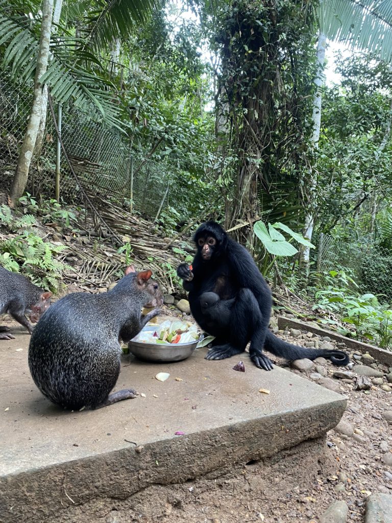 We would also like to introduce all of the readers to the latest arrival here at EV, whose appearance surprised us all. Yanay (adult female spider monkey), to everyone’s astonishment, emerged from under the volunteer house with a newborn baby earlier this month! She kept her distance from us for a few days and was very protective but has since become more comfortable in her new role as a mother and both her and the baby girl, named Yayana, are doing well. Mashi (juvenile male woolly monkey) and Dilana (juvenile female white fronted capuchin) have taken a particular interest and are frequently seen cuddling with Yanay and the new baby.