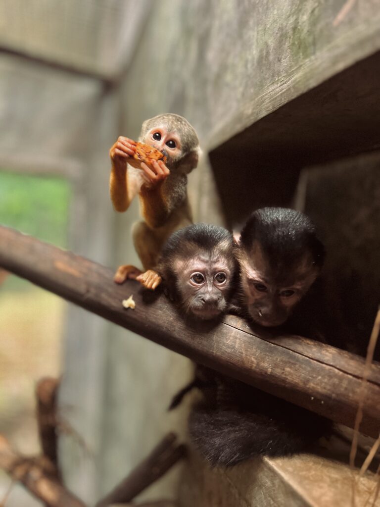 Inside the clinic, Anora (female squirrel monkey), along with Shana and Kalu (a young female and male large-headed capuchin), have been thriving. They’re growing stronger each day and will soon take their next big step – moving to an outdoor enclosure for their first close encounters with the EV monkey family.