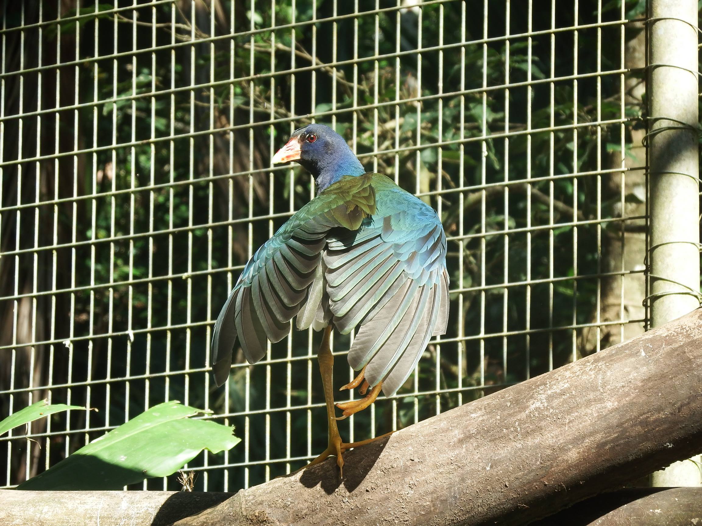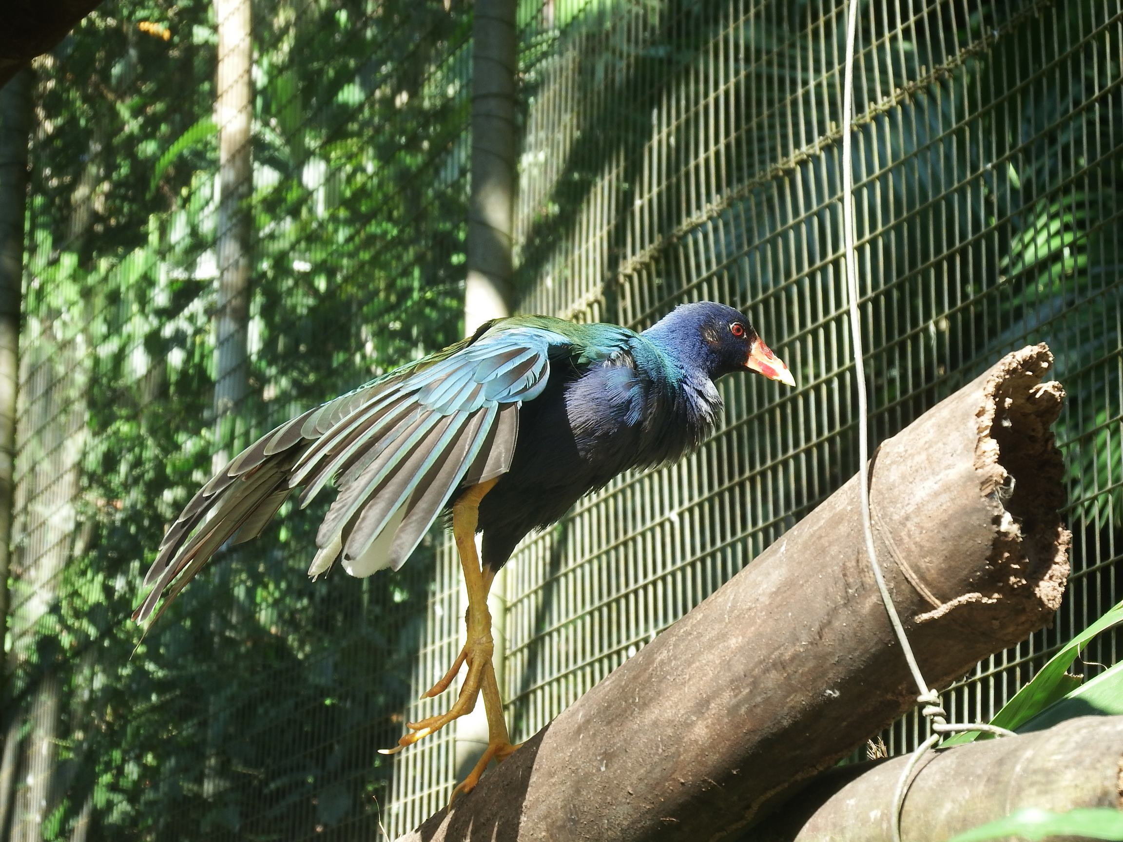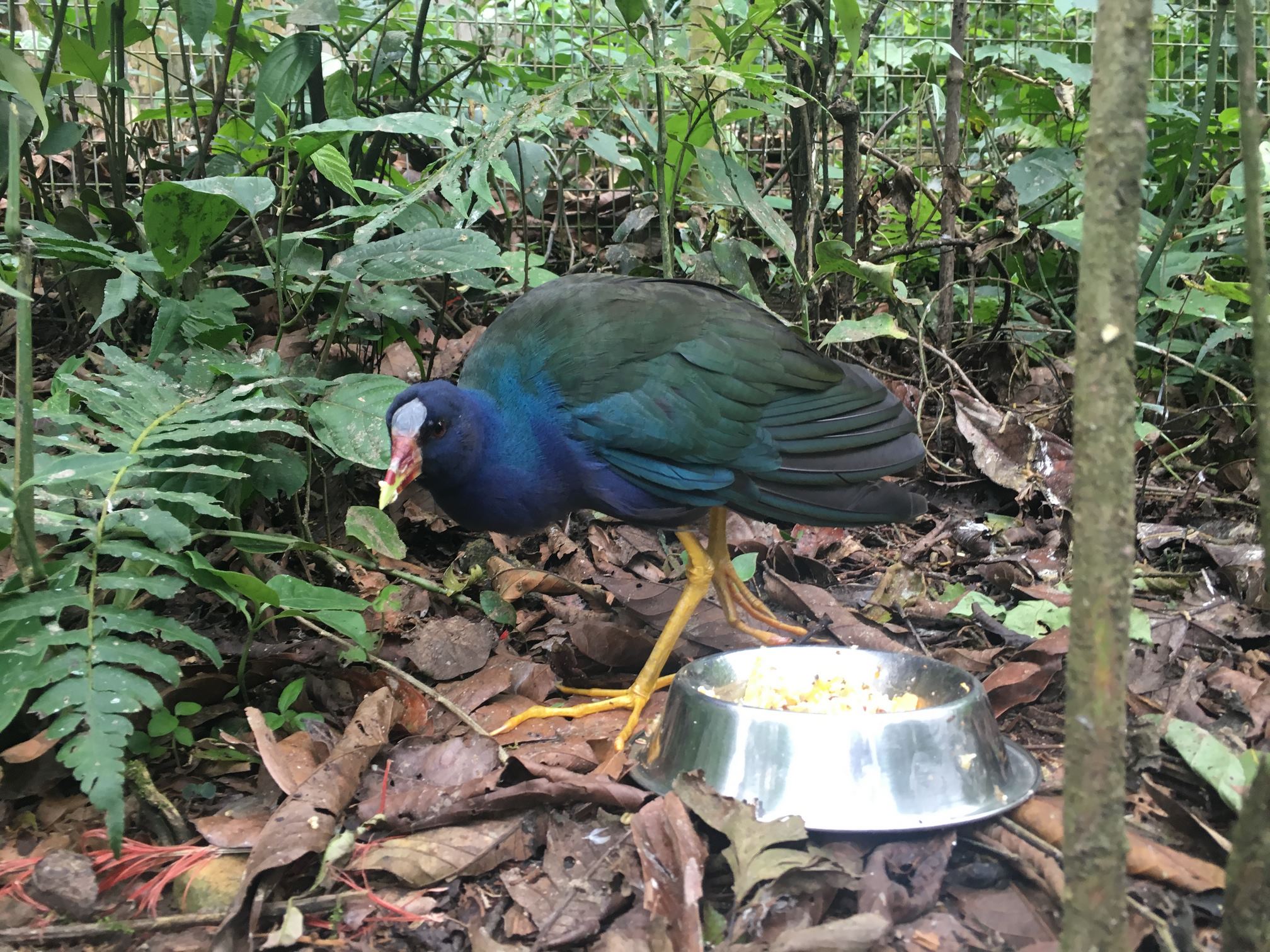 Koru (Purple Gallinule) moved back to Pichu enclosure from the SUSTOAH this month after time recuperating in the clinic. Koru has gained weight while being back outside and although not using his damaged leg at all, is adapting well and looks just as comfortable on the feeding tables as standing on a log within the Pichu pond.