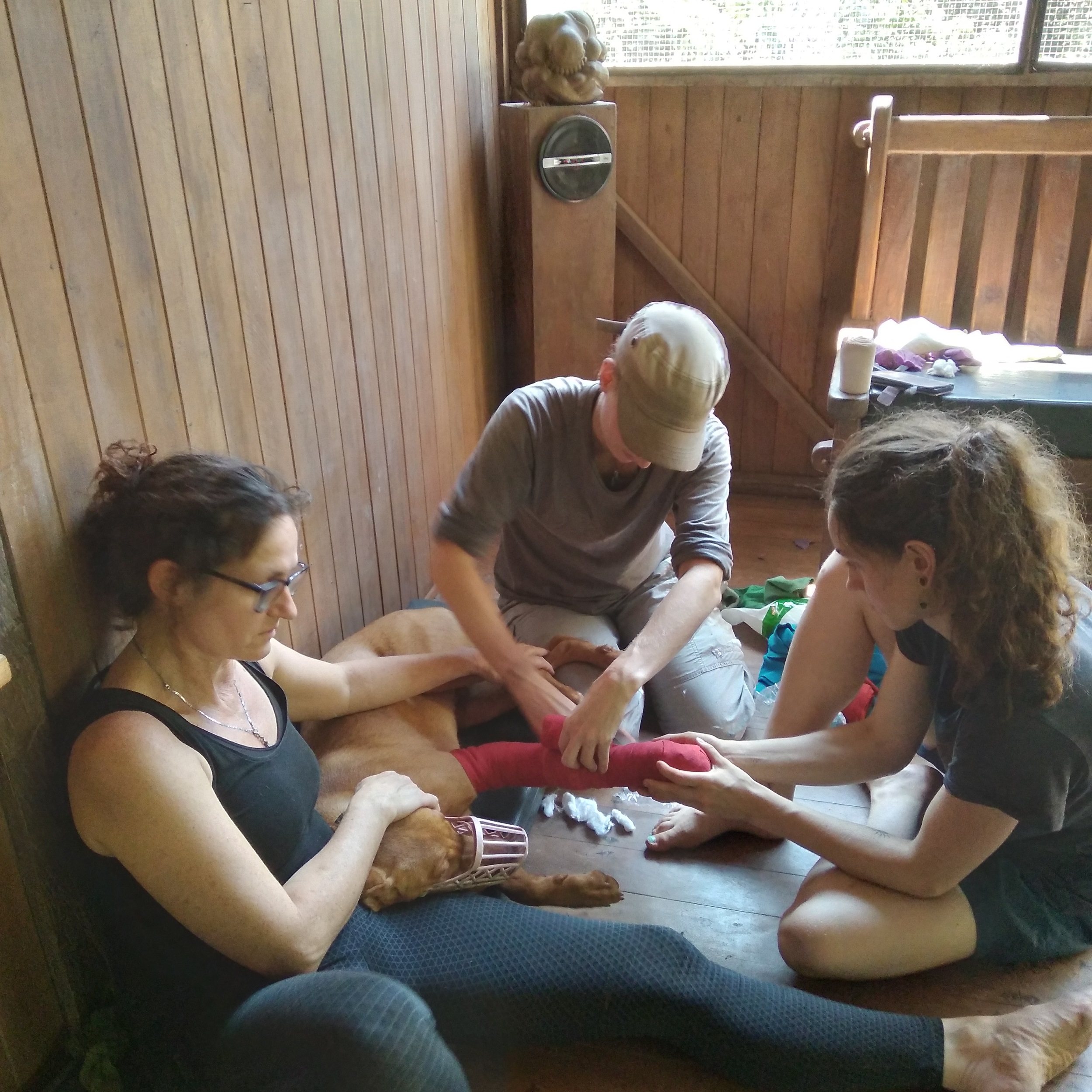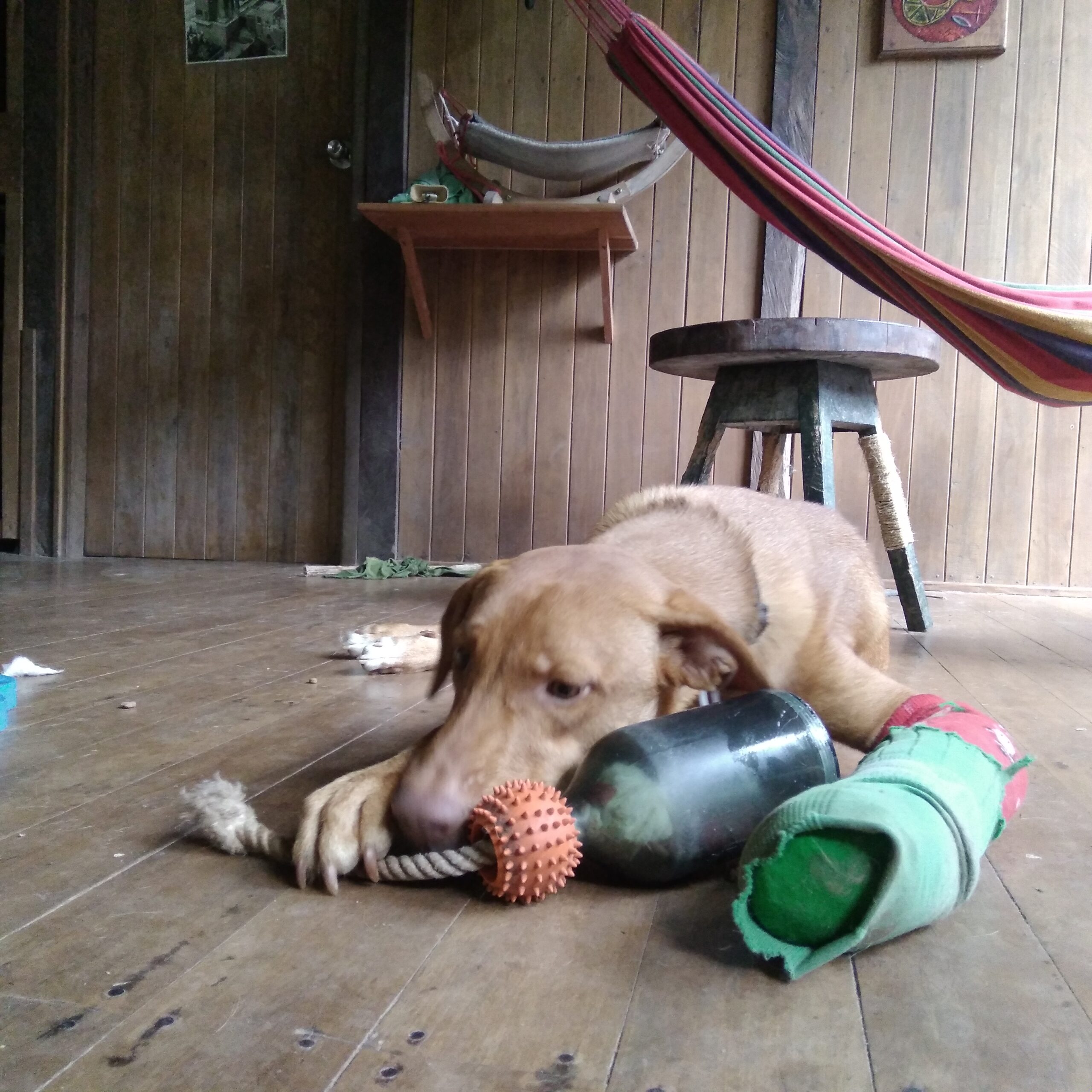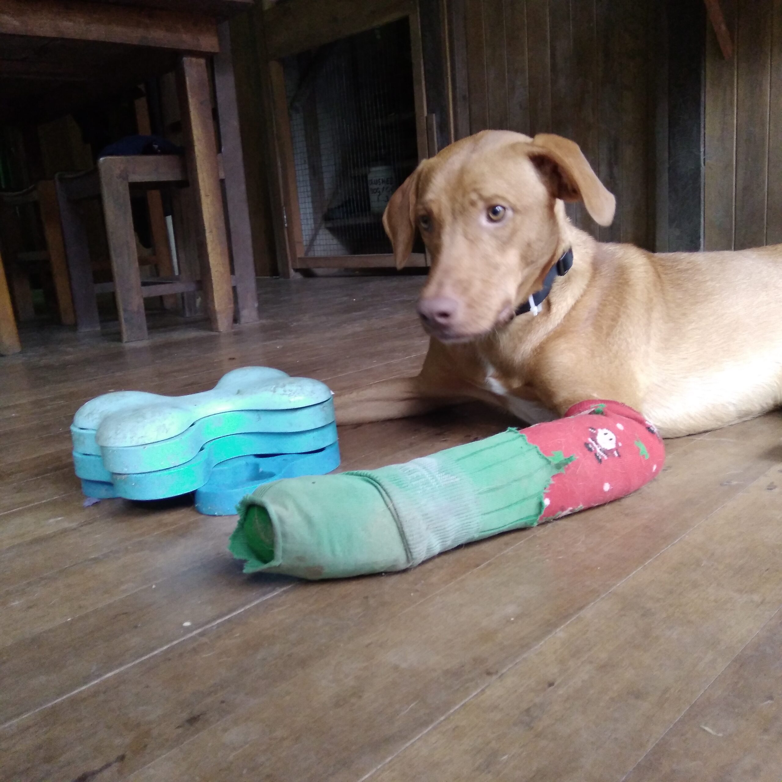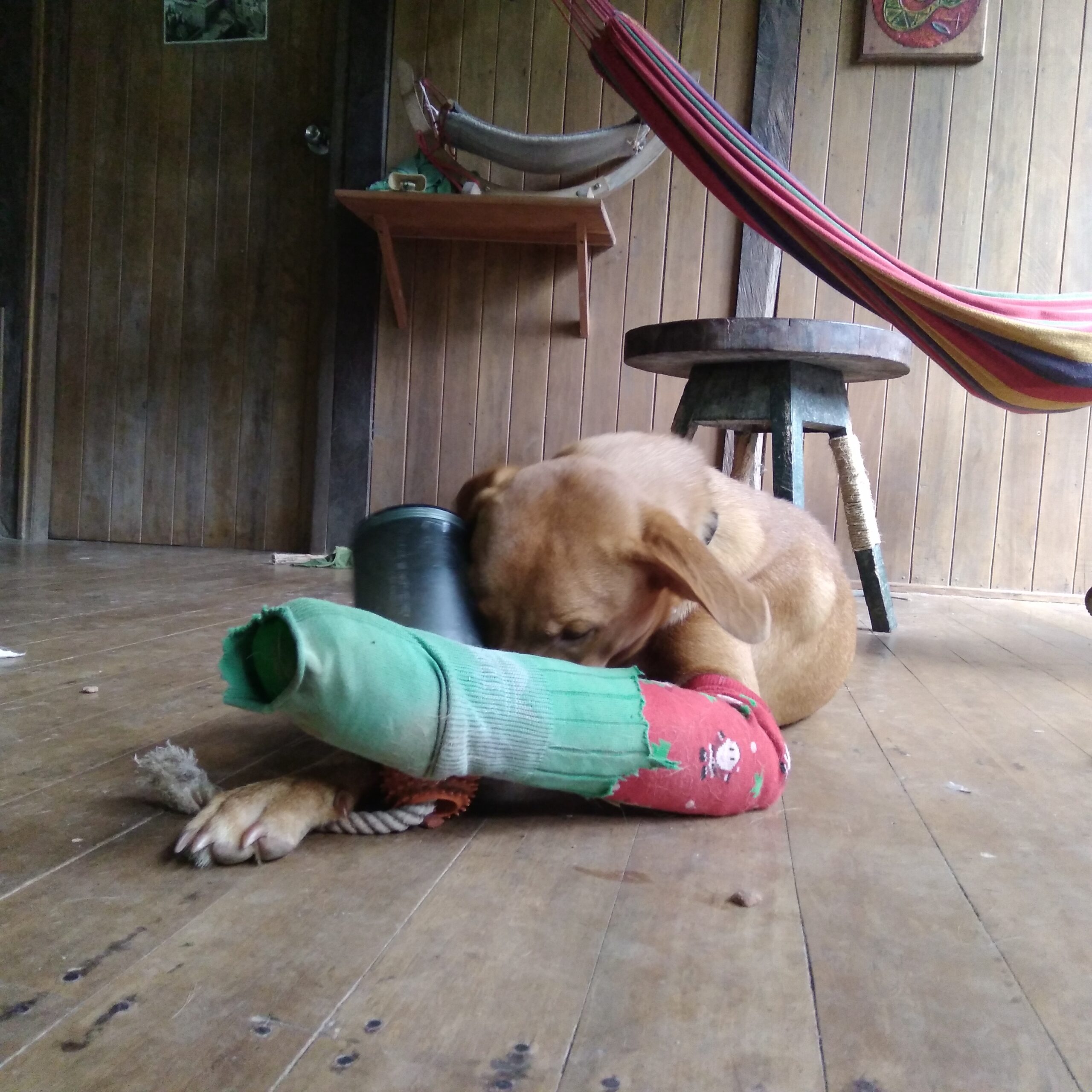 We were all gathered in the kitchen for our weekly meeting when we heard a heart-wrenching squeal. Rex (also known as Kayla’s dog) was left in our care as Kayla’s out exploring the world. Young as he is, he thought he could jump onto the Volunteer House roof, just like the monkeys. Turns out, he can’t. Oh, to be young and curious. He didn’t really ‘fly’ like a monkey and hit the ground with such force that he broke his front leg. He’s now under strict lockdown in the Family House. But his spirits haven’t taken a hit and his cast isn’t keeping him from trying to jump and playing around. You can imagine how thrilled Olivia is at the idea of staying home to babysit a very bored and excitable young dog… So, if you’re wondering why she’s hardly online, you have a wild little limping Rex to answer for that.