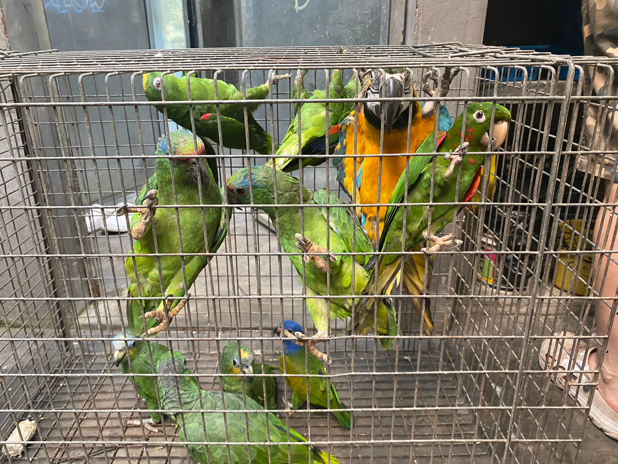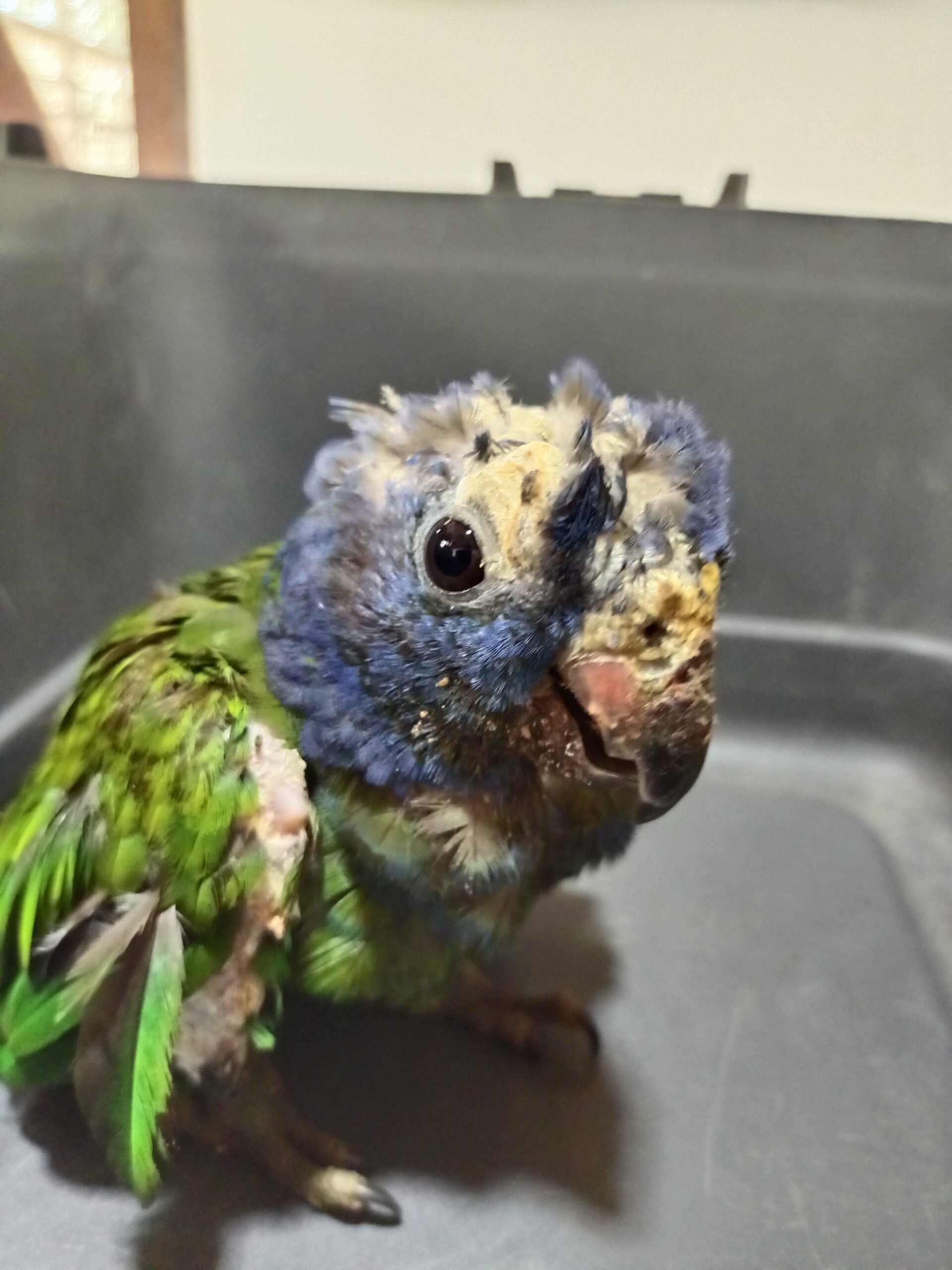 At the same time a crusty and very poor looking bird arrived, almost too hard to see the blue-headed parrot under it all. The bird was rescued by a concerned citizen who noticed it being kept in the most awful conditions. Sam and Douwe got straight to work. After consulting our vet net (veterinarian network) they started treatment. The scabs were coming off, food was going down and things were looking up. But its health took a sudden turn and the bird passed away. The exact cause couldn’t be determined, but we’re sure the root cause can be pinned on the distressing conditions it was kept in for far too long.