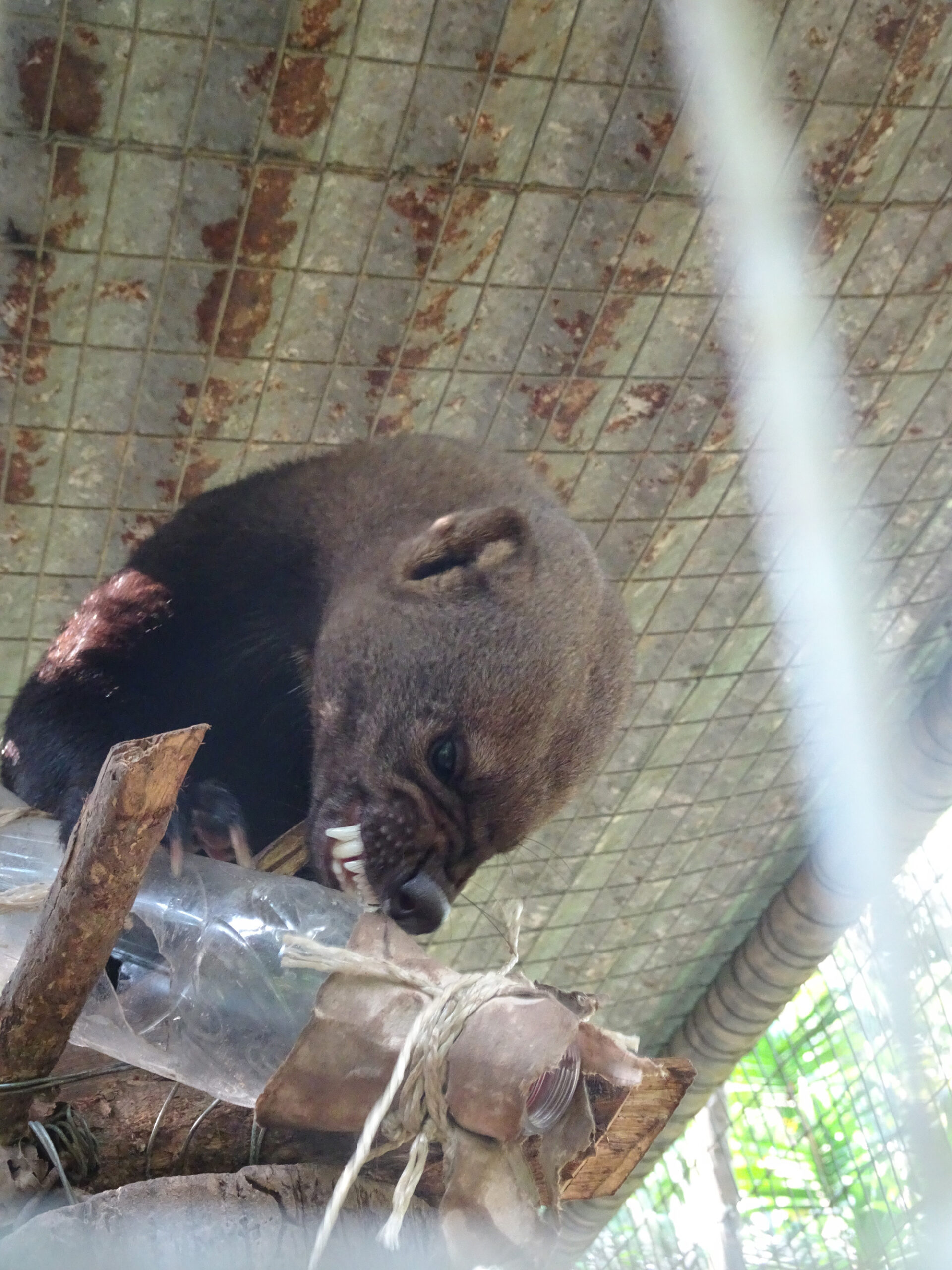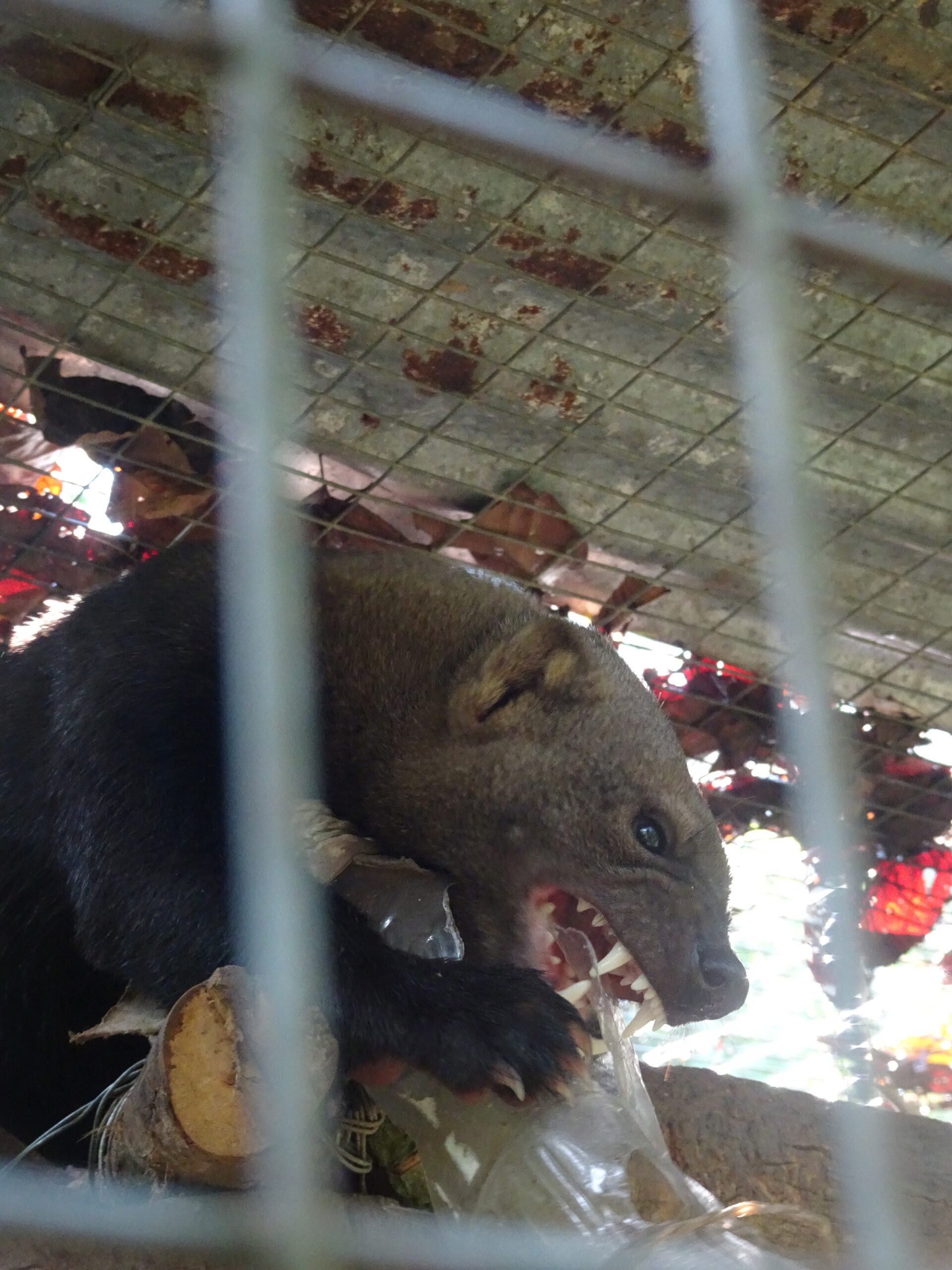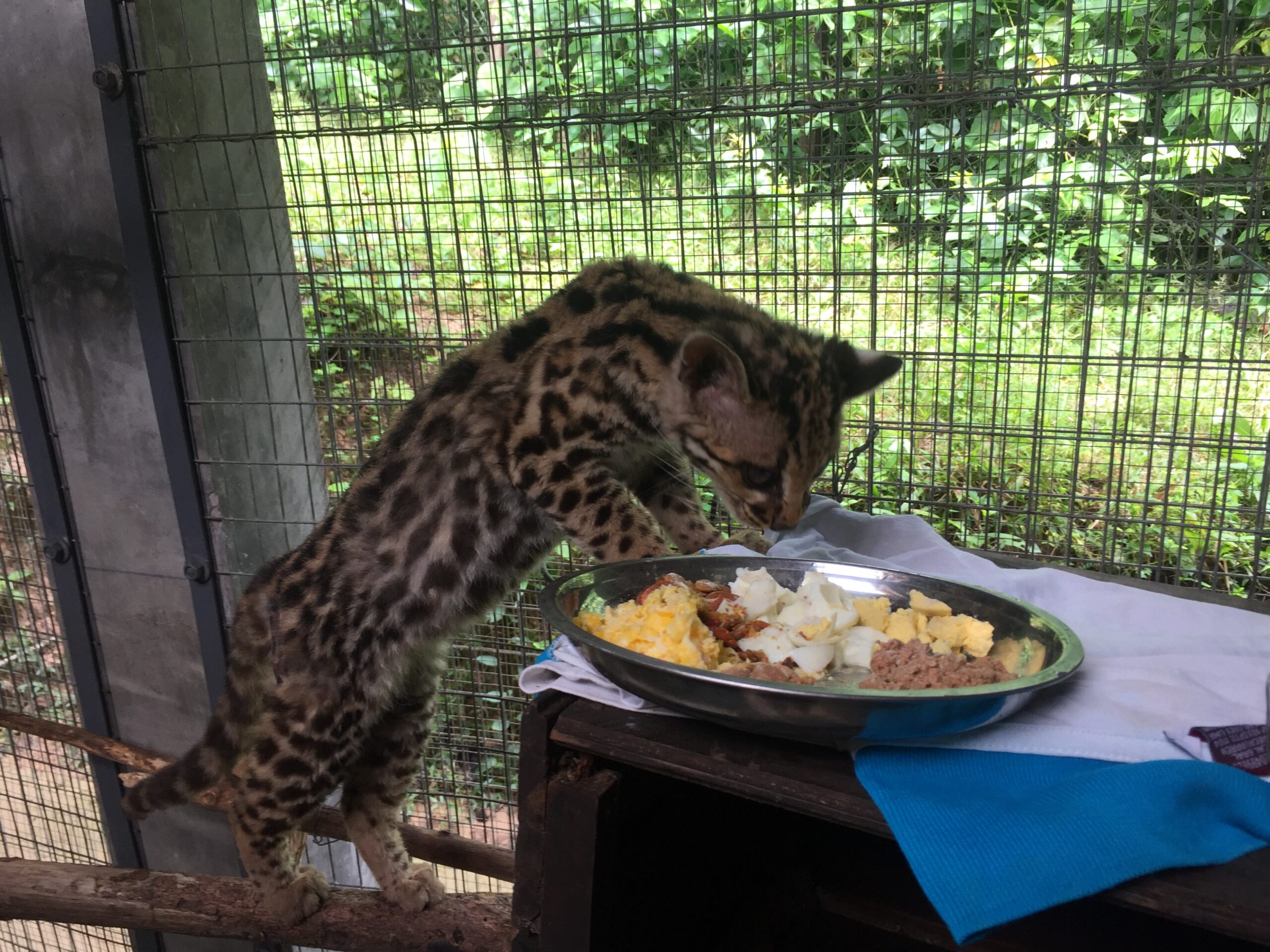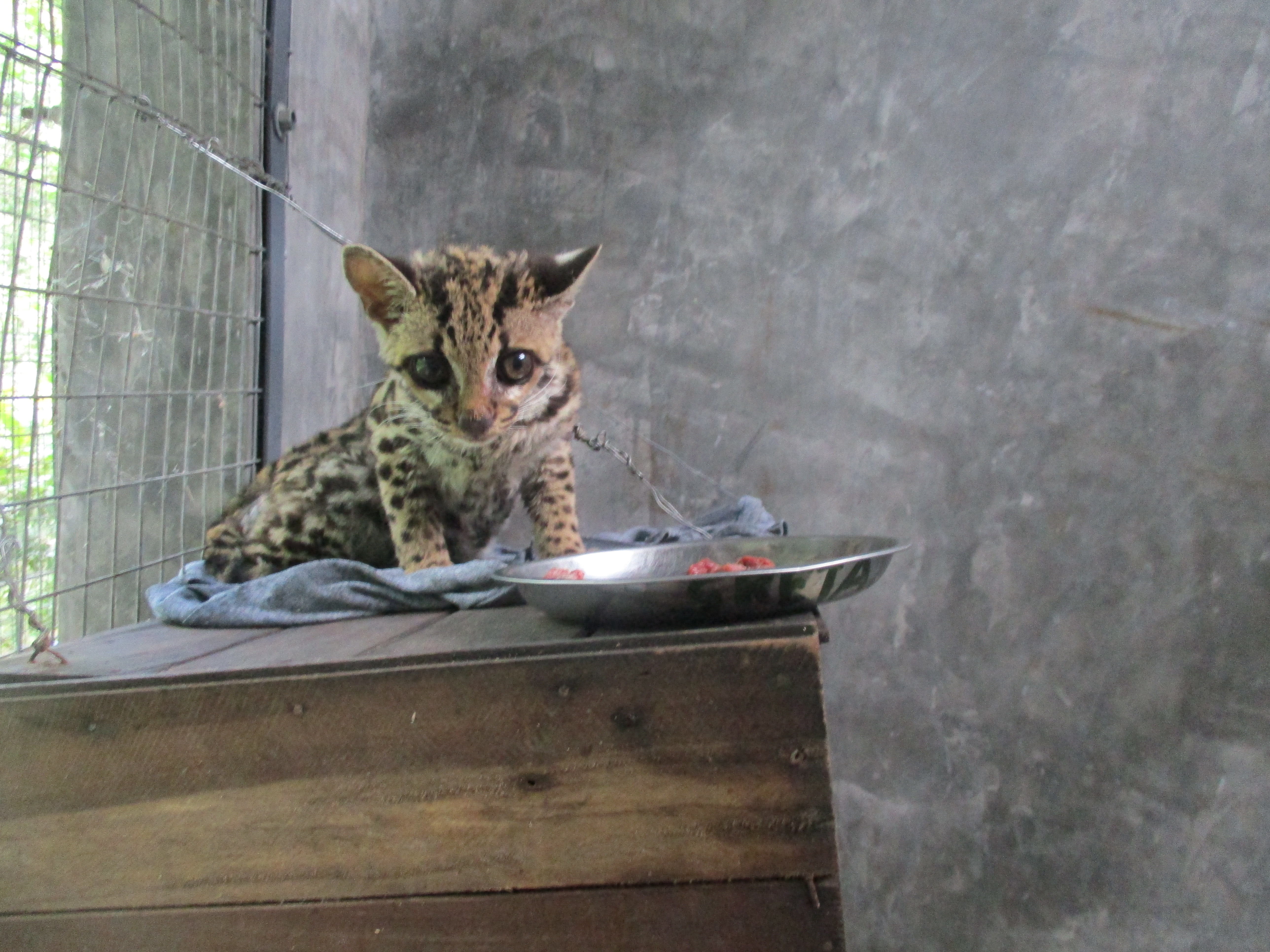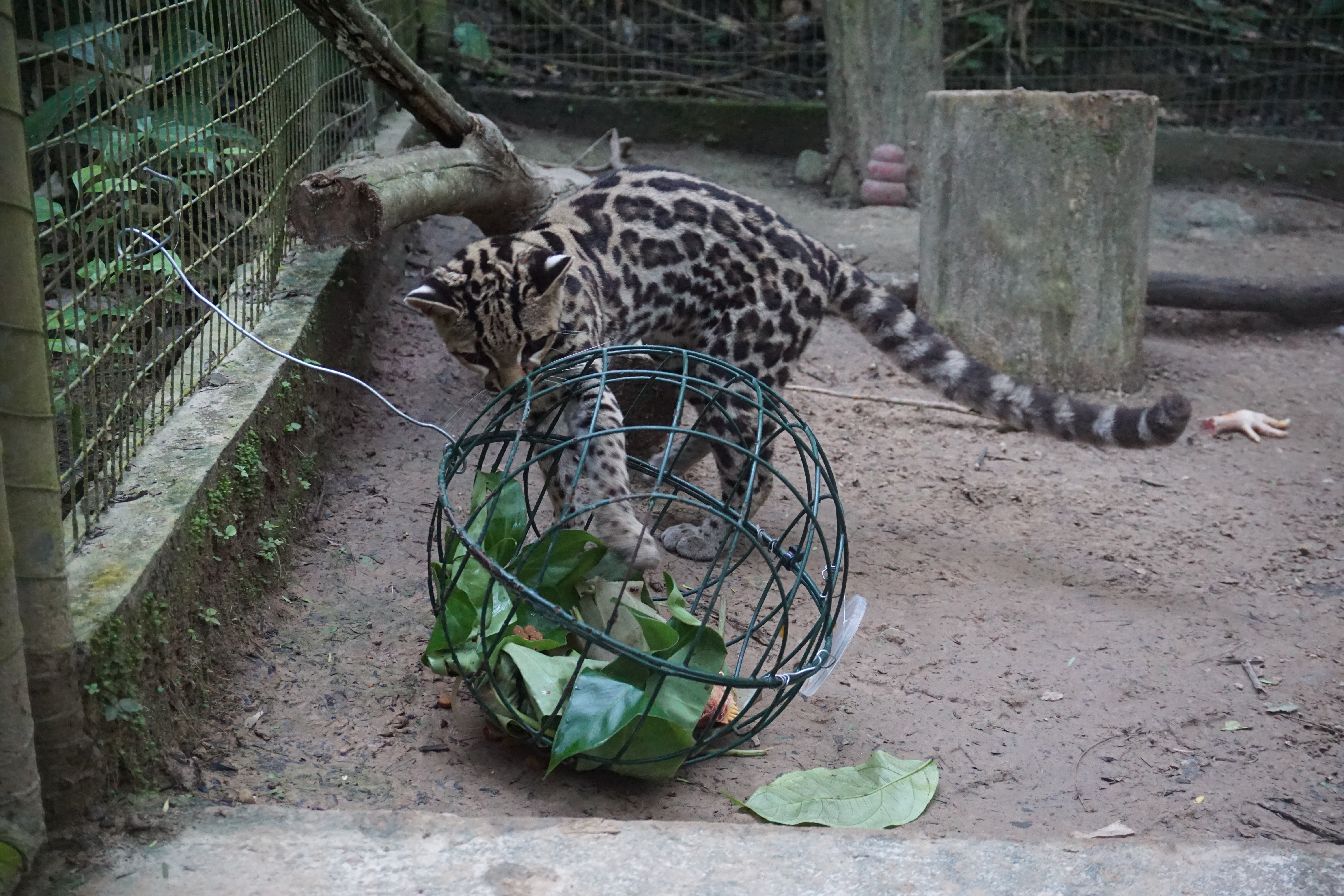 Grety (female margay) has been benefitting from the sudden influx of rats, getting a rat some mornings as well as her normal afternoon meal of chicken and organs. It is hard to say whether Grety gets more enjoyment from hunting for a dead rat, or from eating it. Needless to say, watching Grety play can be quite enjoyable, if you have the stomach for it! All rats are killed humanely prior to feeding to Grety unless they are ones foolish enough to have entered her enclosure and she has caught them herself.