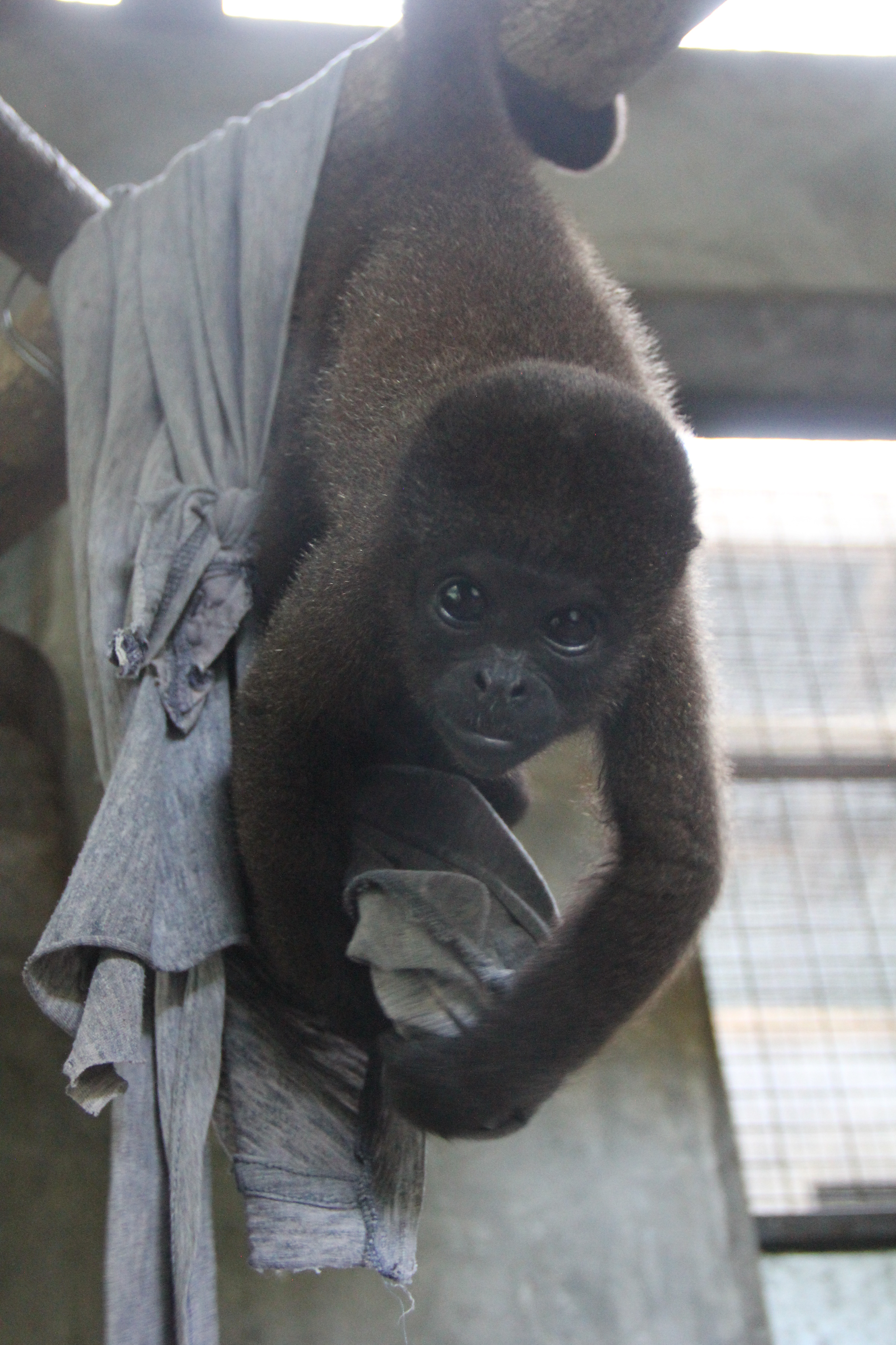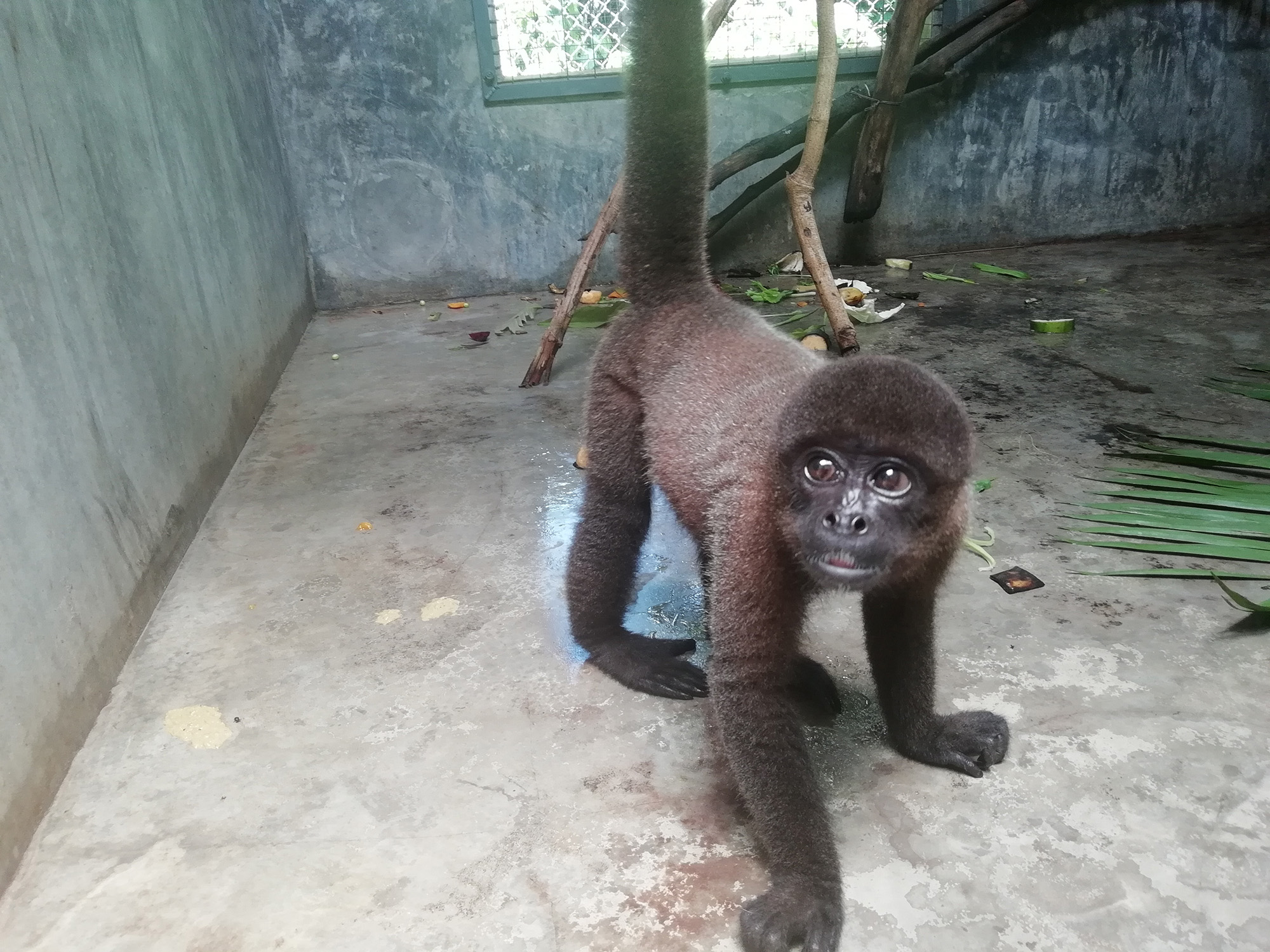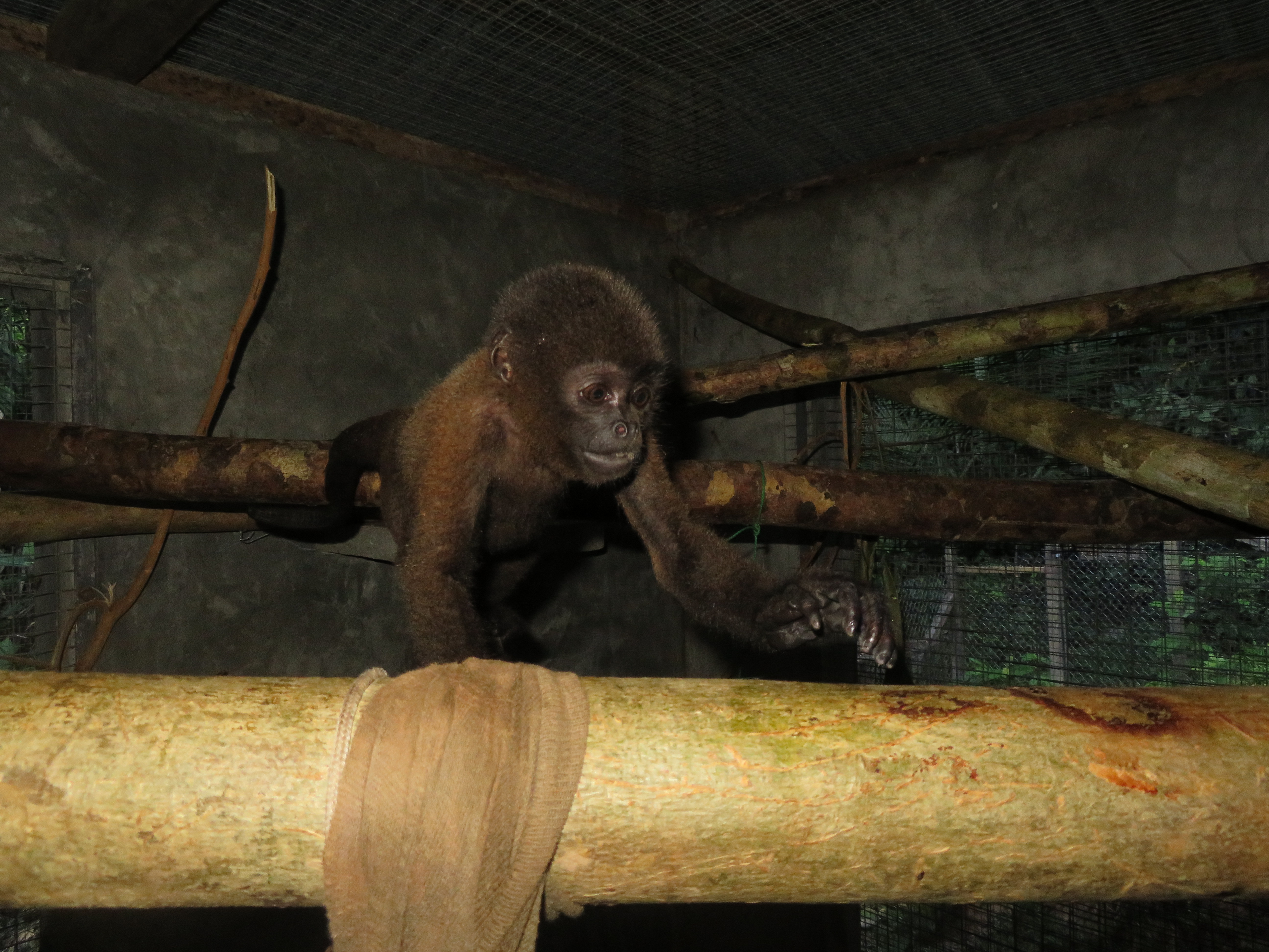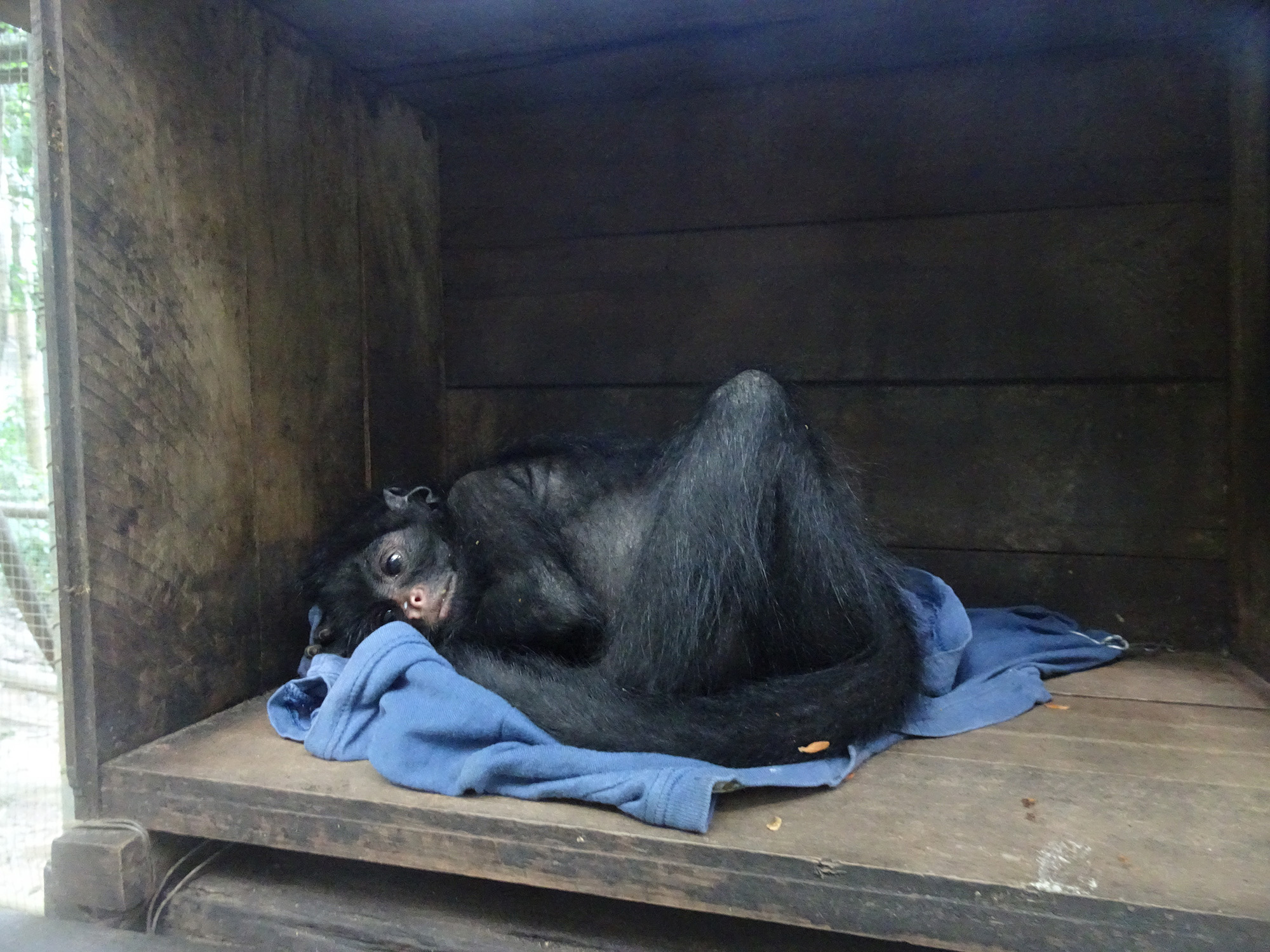Mashi (male woolly monkey) is out of the small cage and now in one of the main clinic cages with Almira (female woolly monkey). They were initially separated as Mashi would cling to Almira for comfort using her as his mother, but Almira is not much larger than Mashi and not able to sustain the extra weight of another monkey. Although appreciating the company, Mashi is now more independent which gives Almira more time to play.