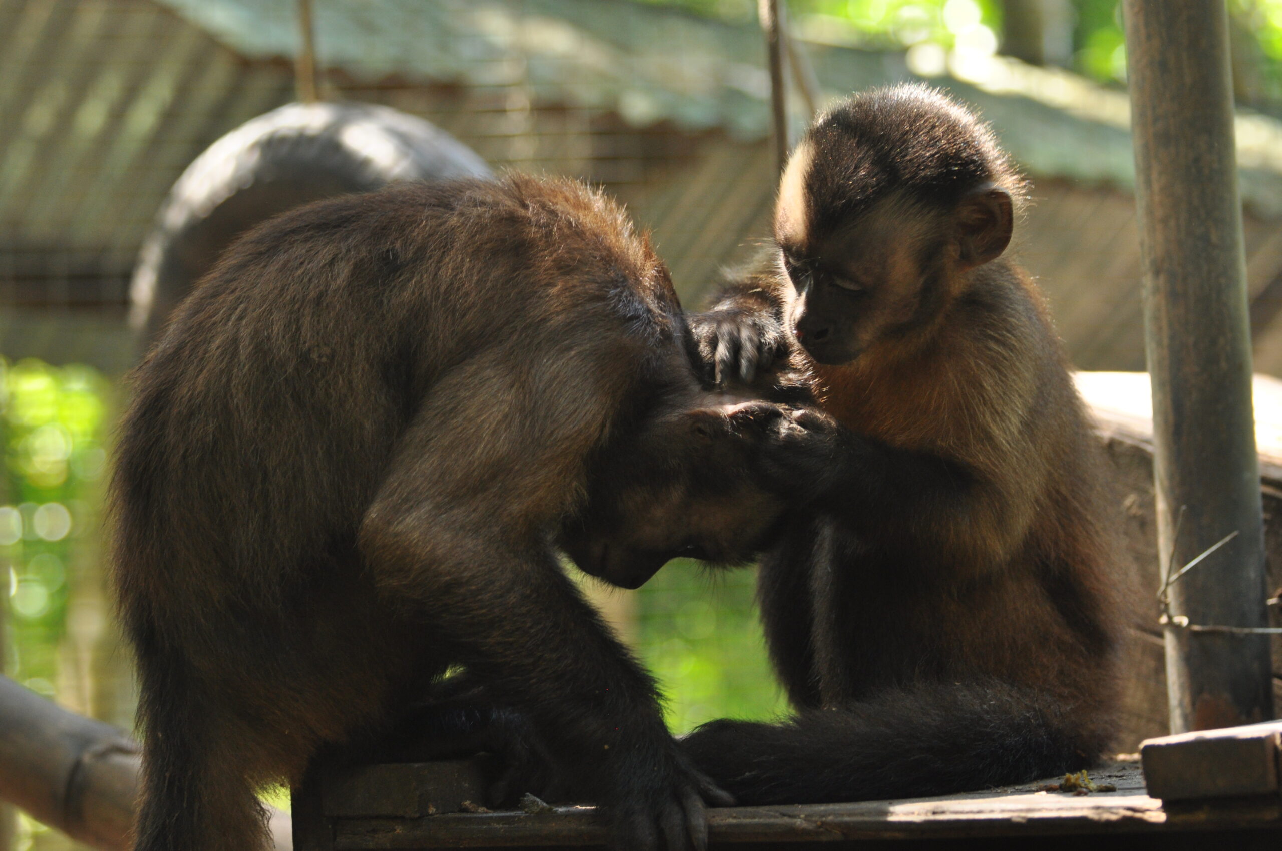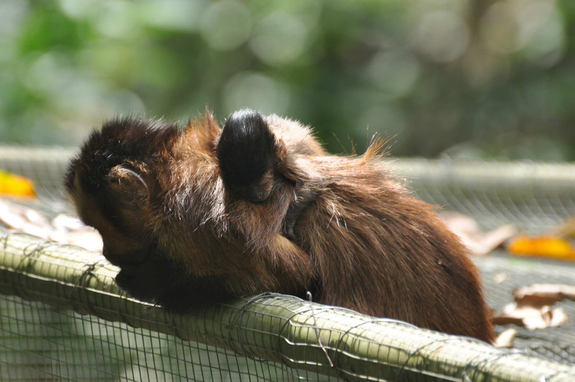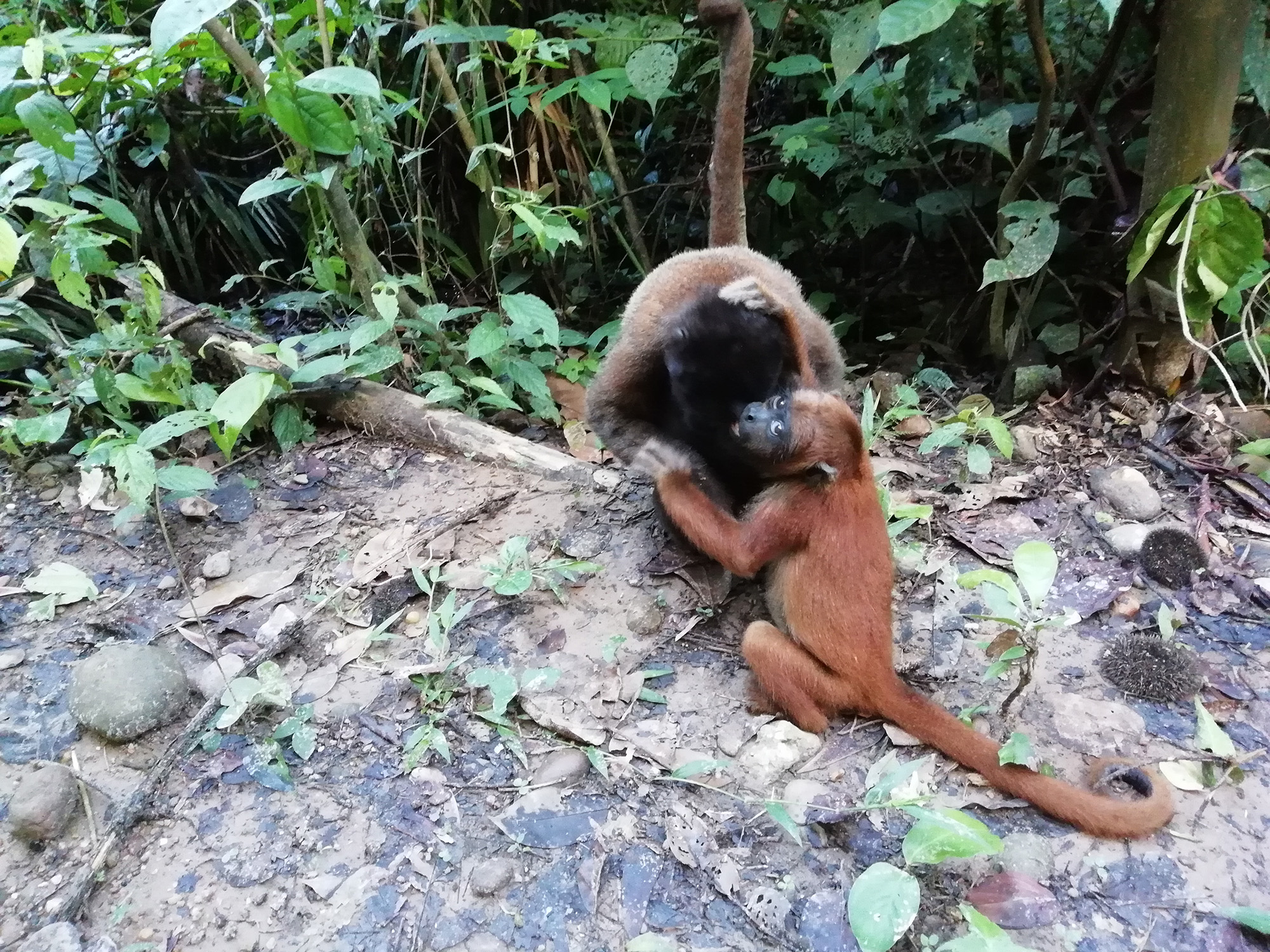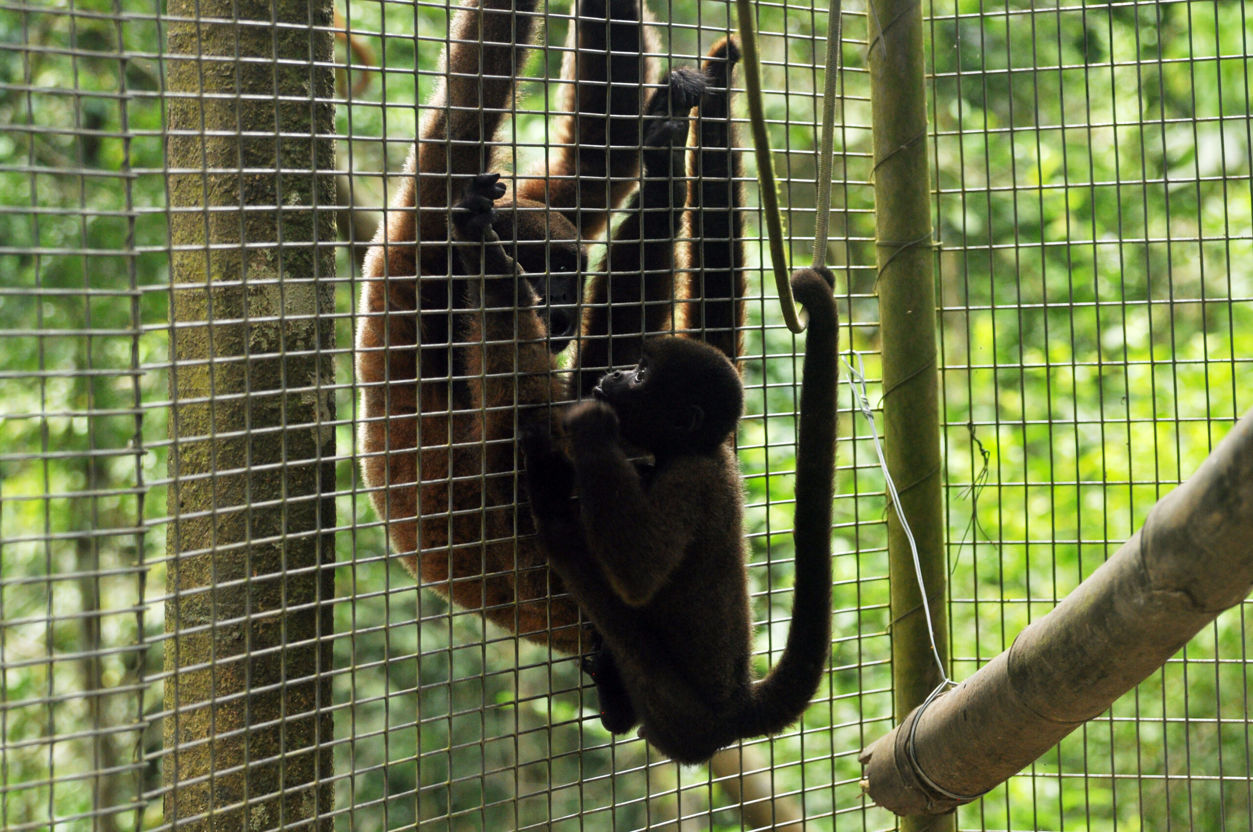 Panki (male woolly monkey) was released from the La Sapa enclosure this month and it has been interesting to see the growth in his personality and how comfortable he has become in such a short time. Loki had been showing a great deal of interest since Panki arrived, so when Panki was released, it was great to see the initial comfort Loki provided. Male Woolly monkeys often spend a great deal of time with the young and it is great to see Loki practicing his paternal skills.