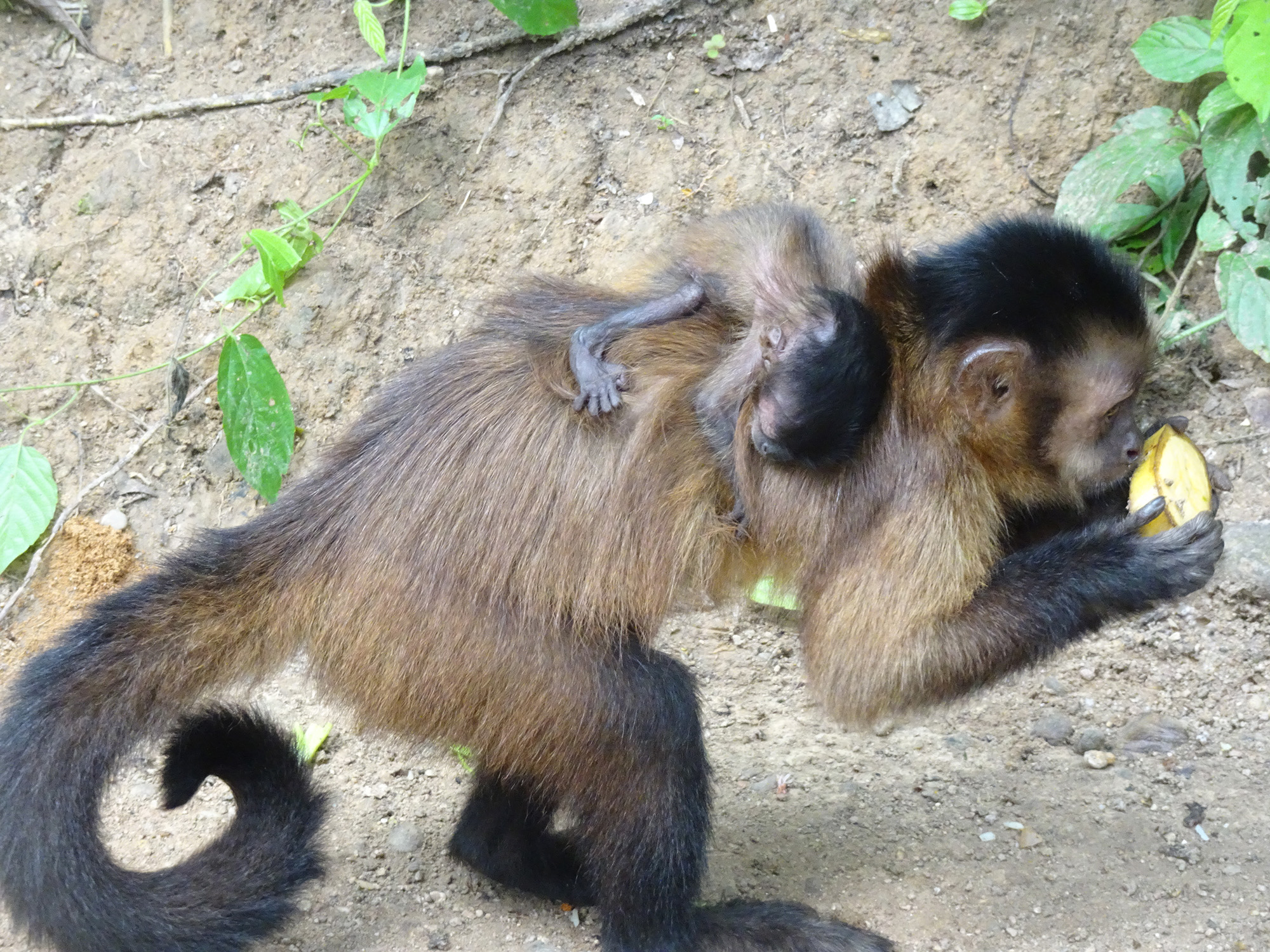 Mashi and Almira, male and female woolly monkeys, very young. Almira is playful and estimated about 8-9 months old and is already happily playing with the capuchins. Mashi is about 6 months and very skinny. He sleeps separately at night in a small cage, while spending some time during the day with the capuchins and Almira, as well as spending some time with a volunteer to stimulate him to eat and teach him what he should eat.