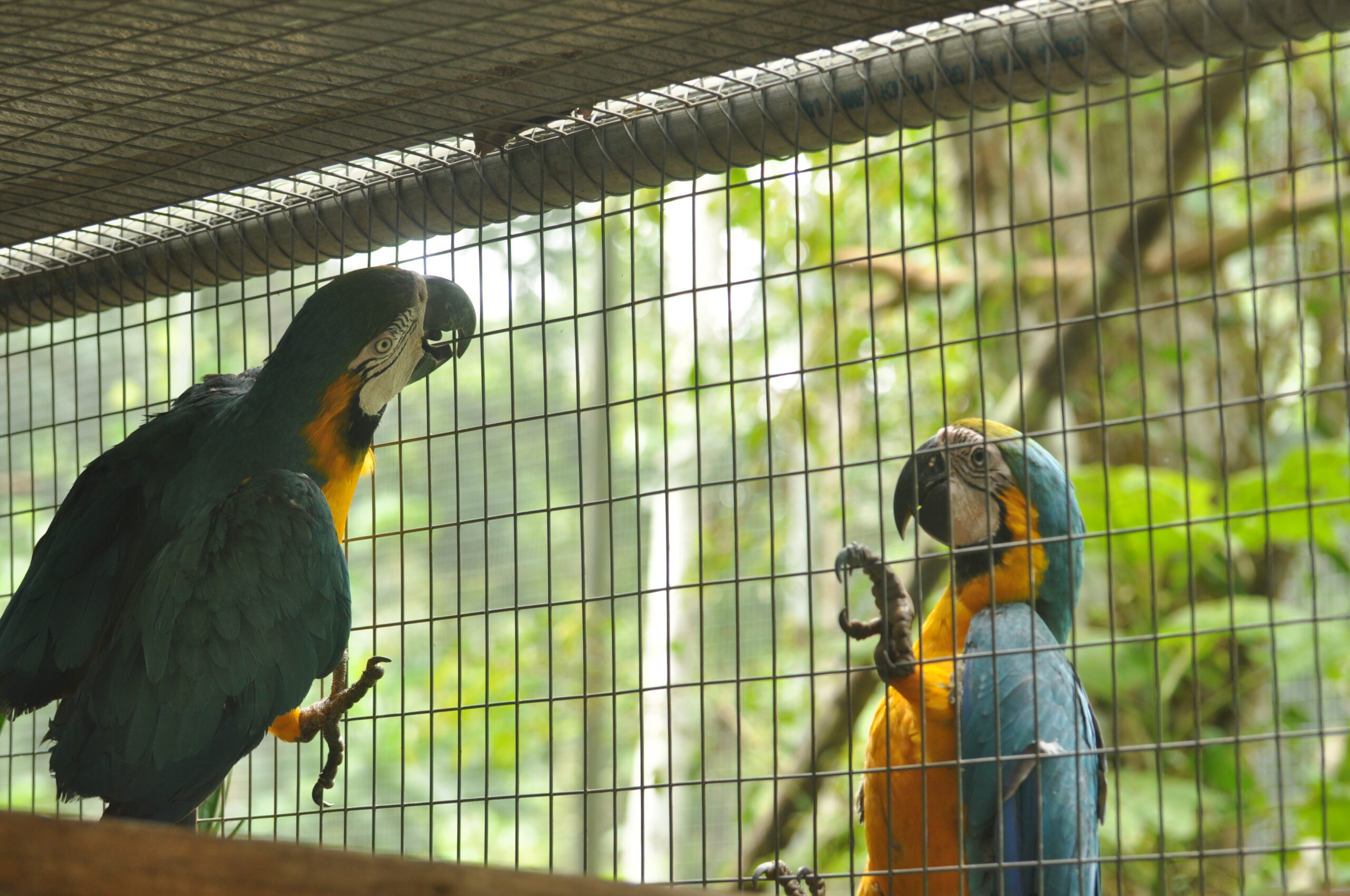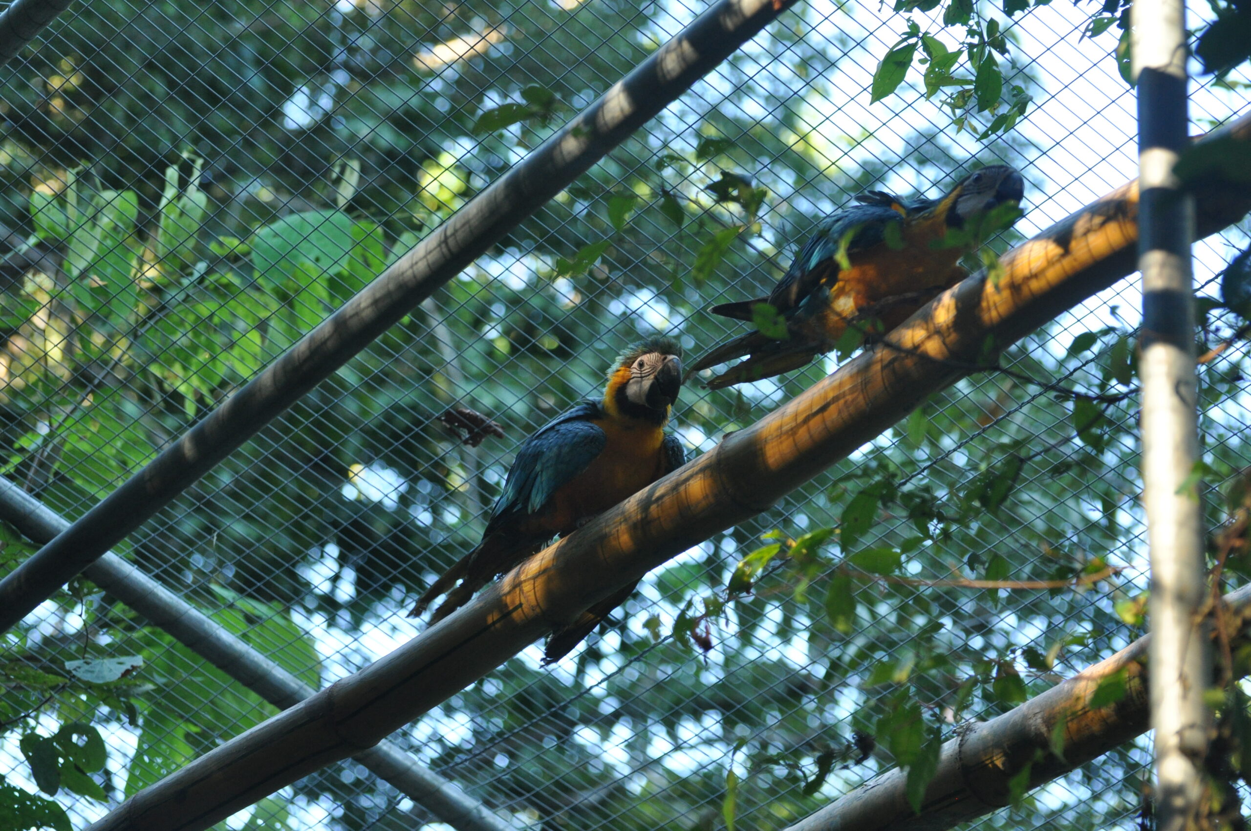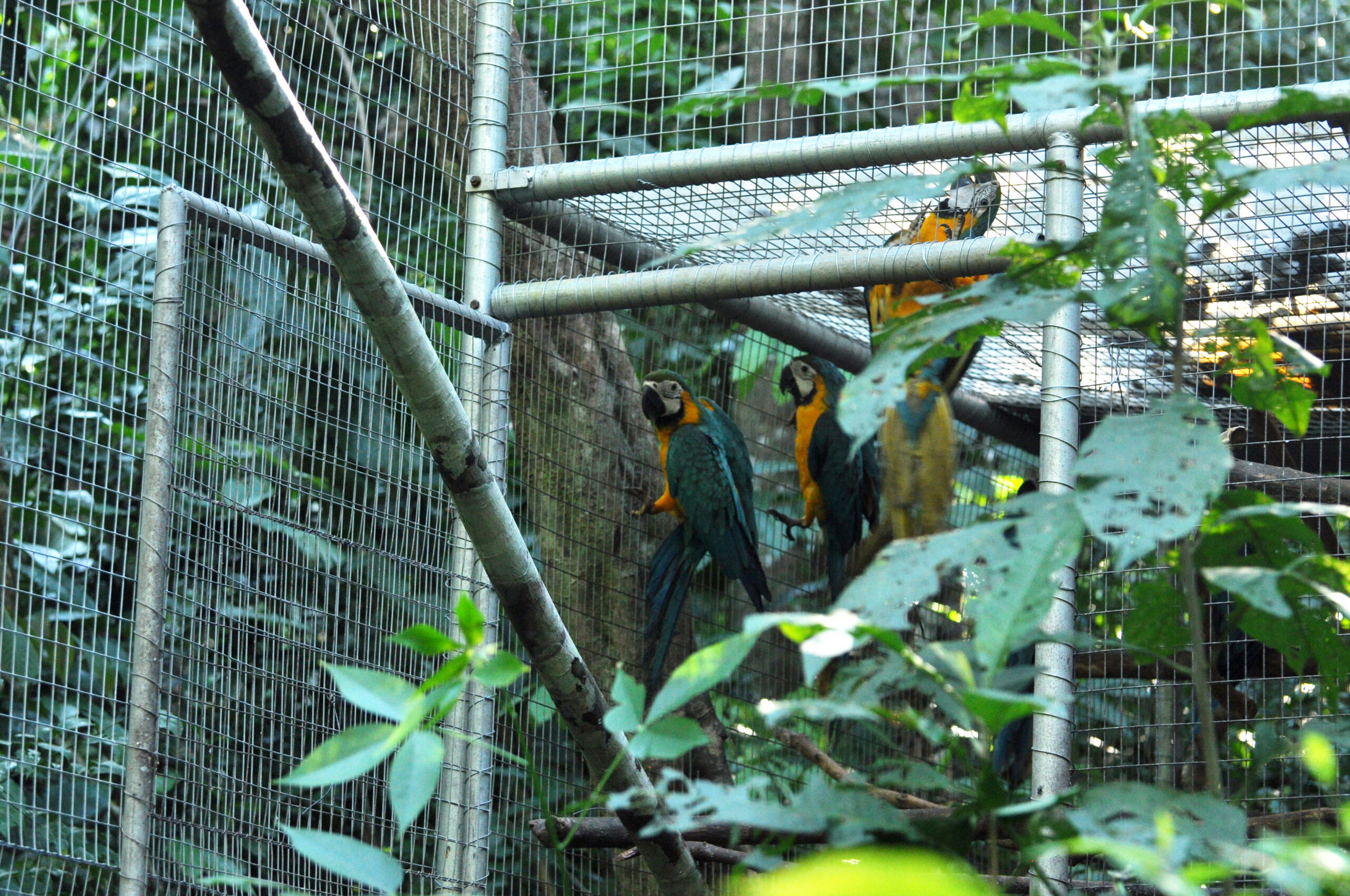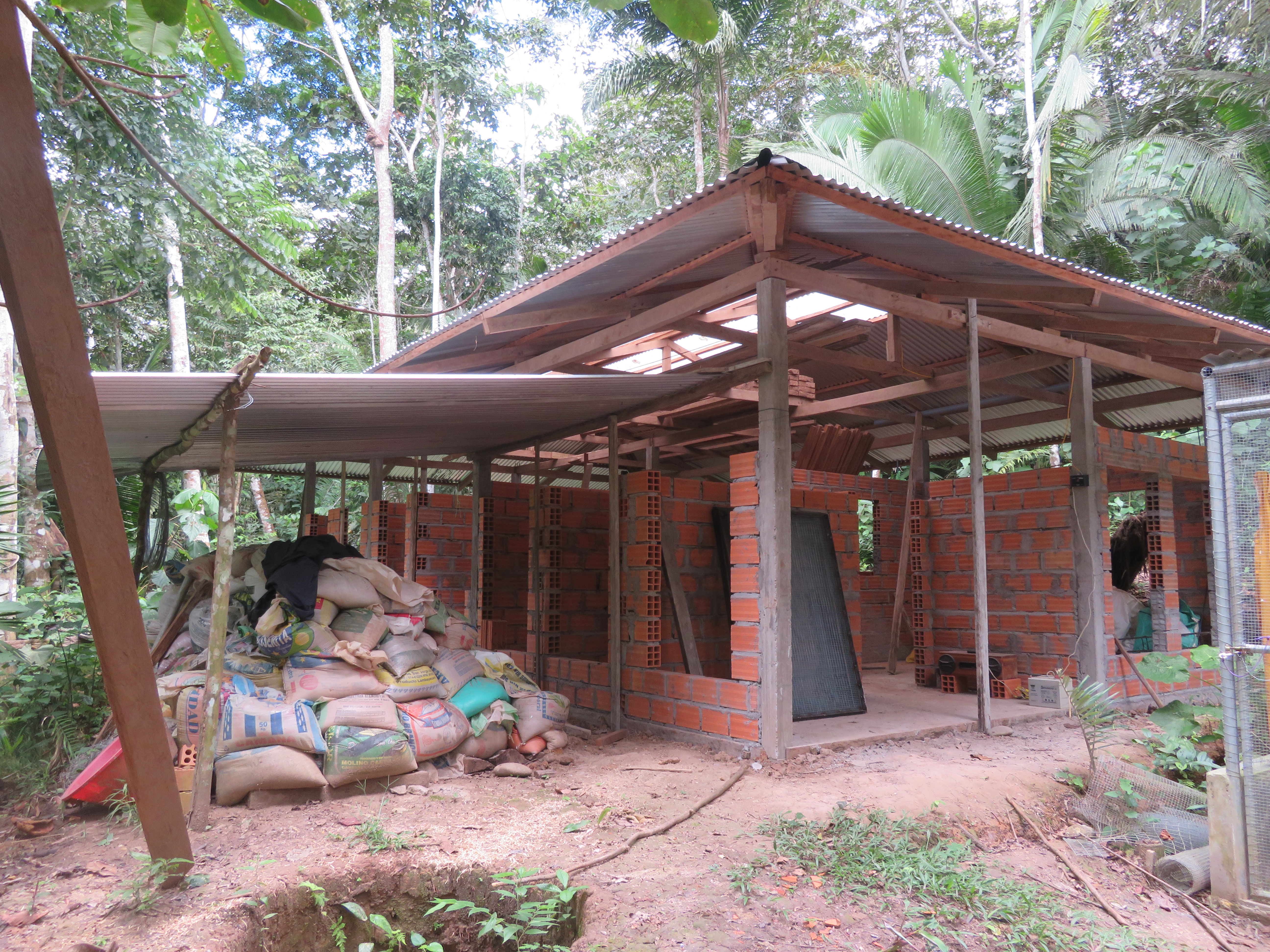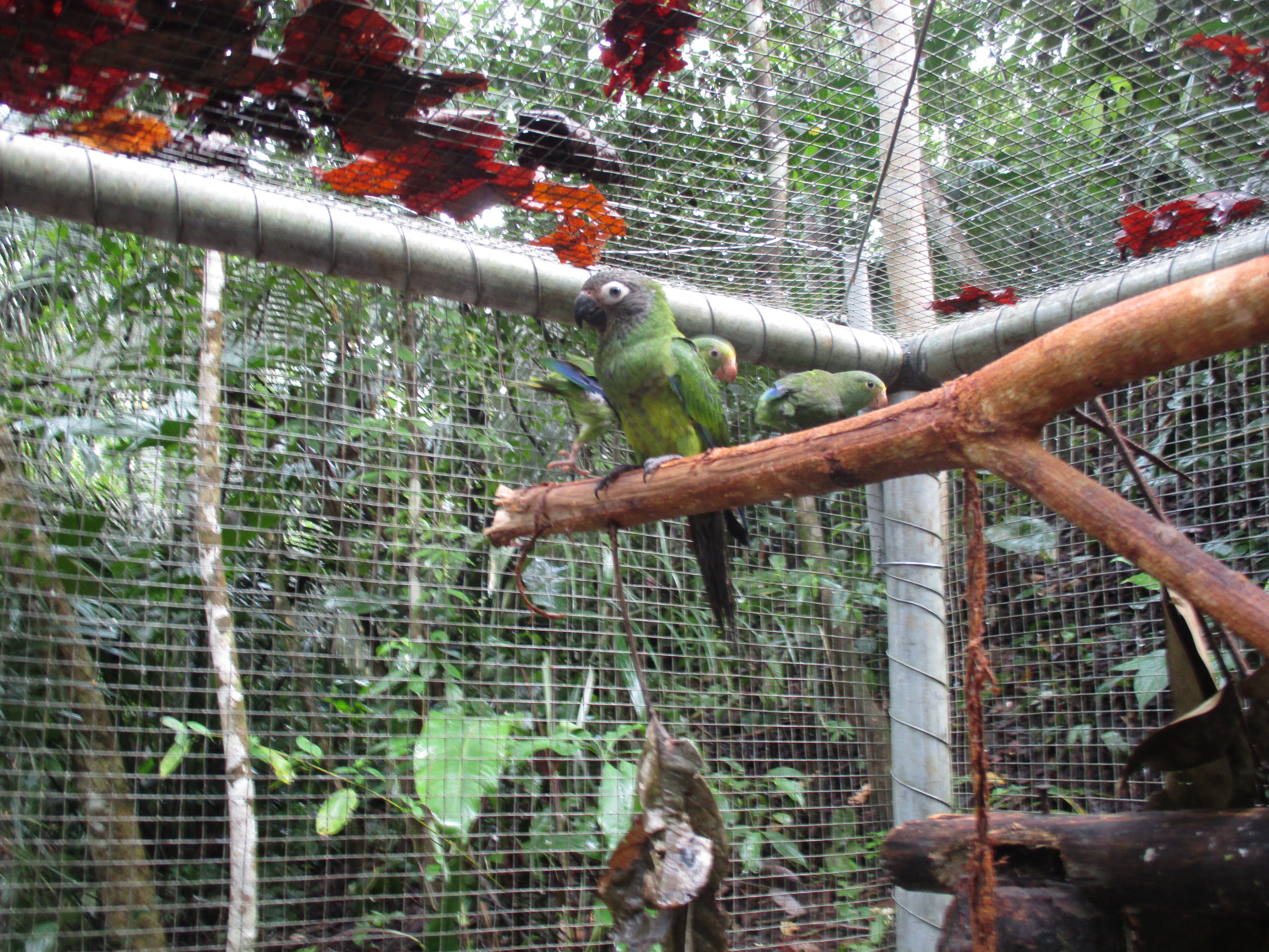 Rafiki (blue and yellow macaw) now has company. He was joined by an old friend from the Pichu (aviary) enclosure. At the start of the month Ermina (scarlett macaw) was found having suffered a fall, she is incapable of flight already, now had minor damage to a leg as well. After a brief stay in the SUST Orphan Animal Hospital, Ermina has now joined Rafiki as a permanent roommate. Both birds are benefiting from the private space where they can stretch their wings and recover, without the fear of falling from a great height or being grabbed by the other maccaws.