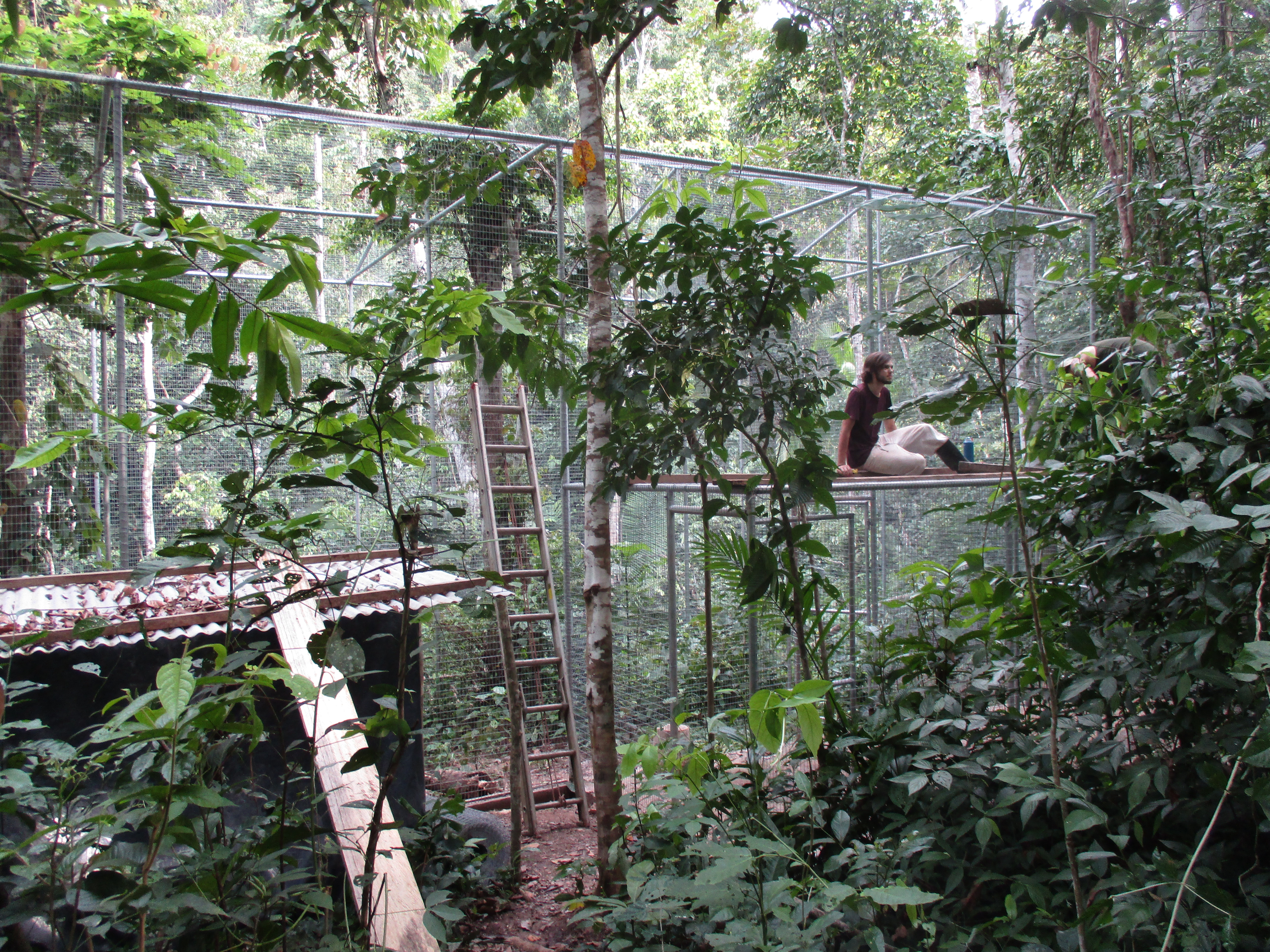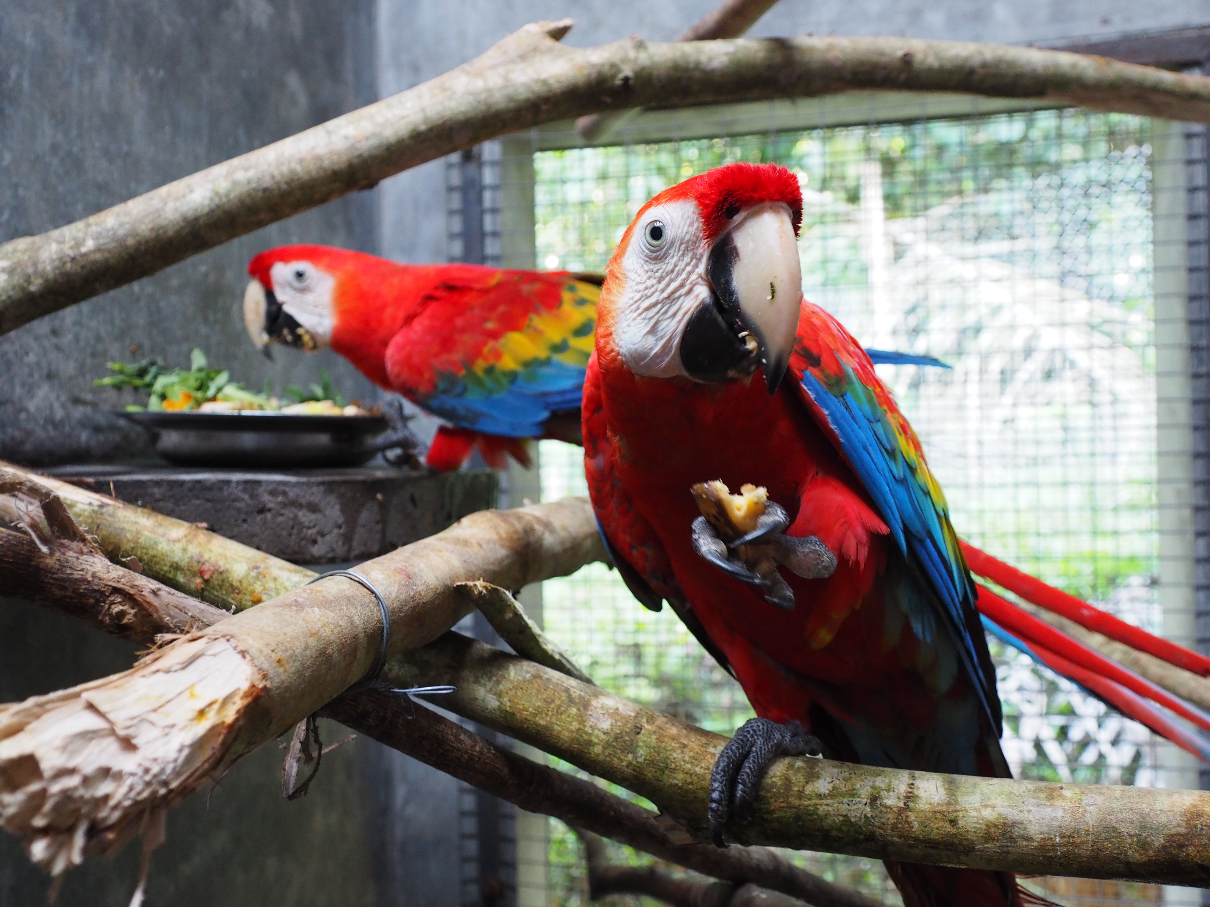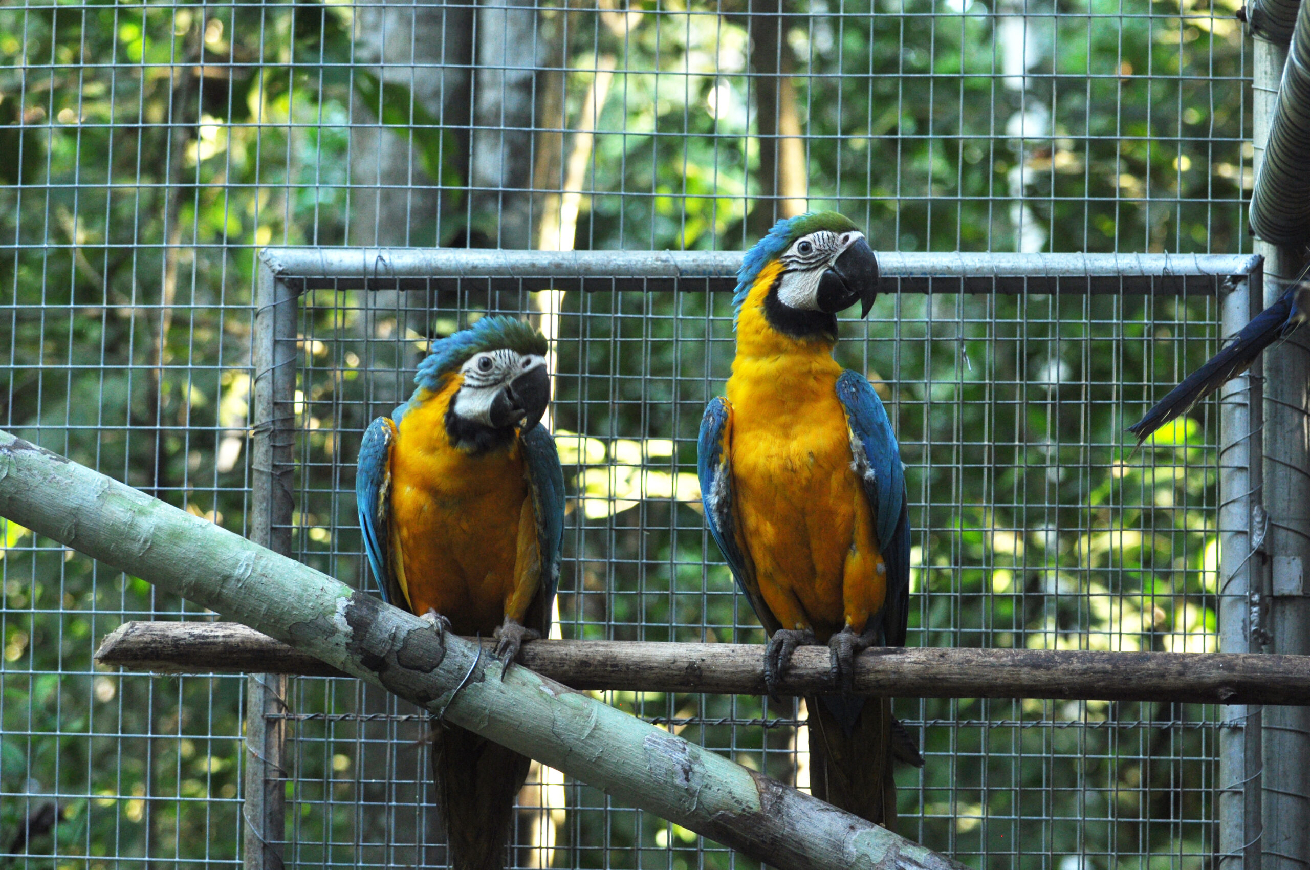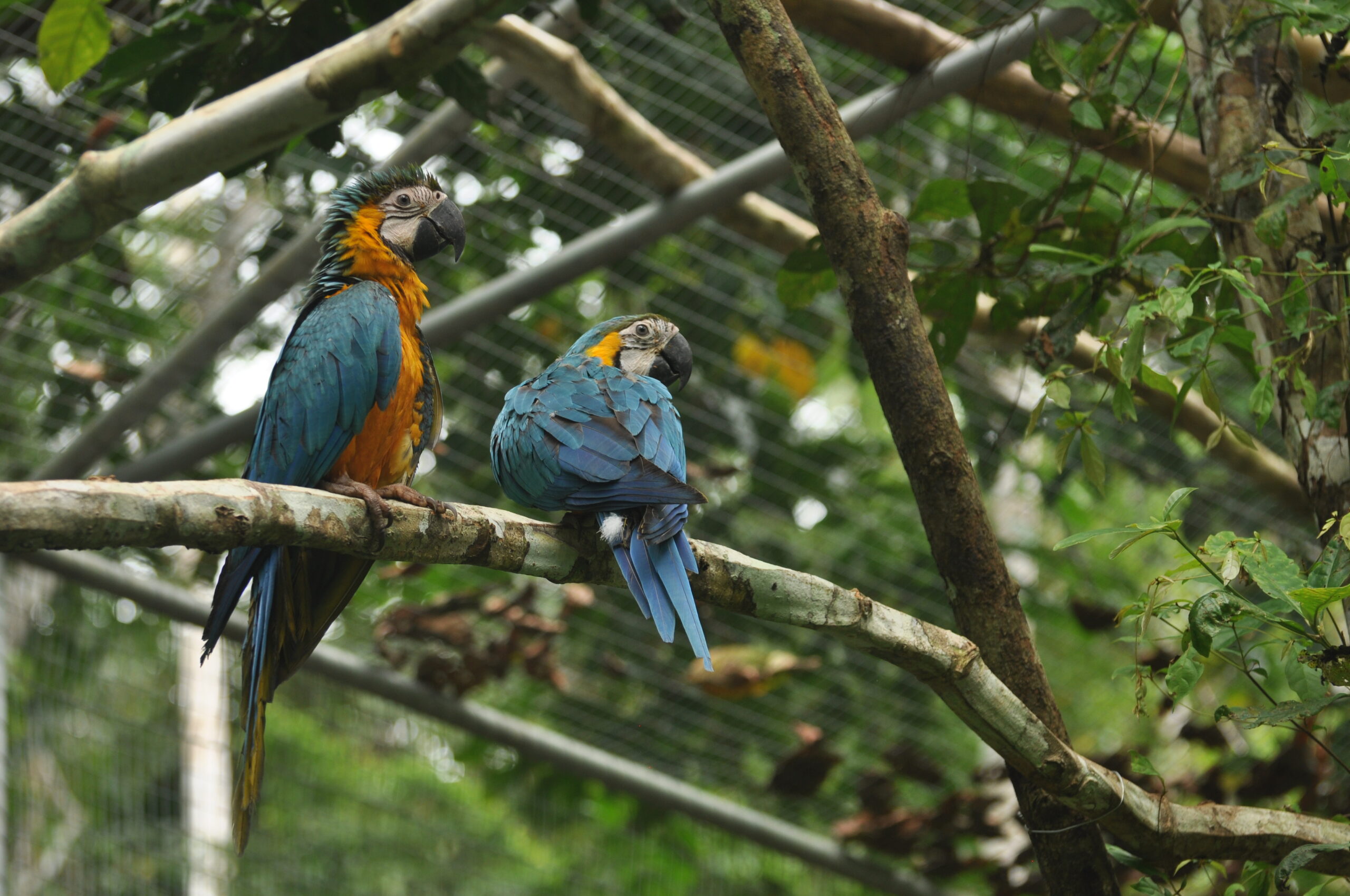 Rafiki (blue and yellow macaw) now has company. He was joined by an old friend from the Pichu (aviary) enclosure. At the start of the month Ermina (scarlett macaw) was found having suffered a fall, she is incapable of flight already, now had minor damage to a leg as well. After a brief stay in the SUST Orphan Animal Hospital, Ermina has now joined Rafiki as a permanent roommate. Both birds are benefiting from the private space where they can stretch their wings and recover, without the fear of falling from a great height or being grabbed by the other maccaws.