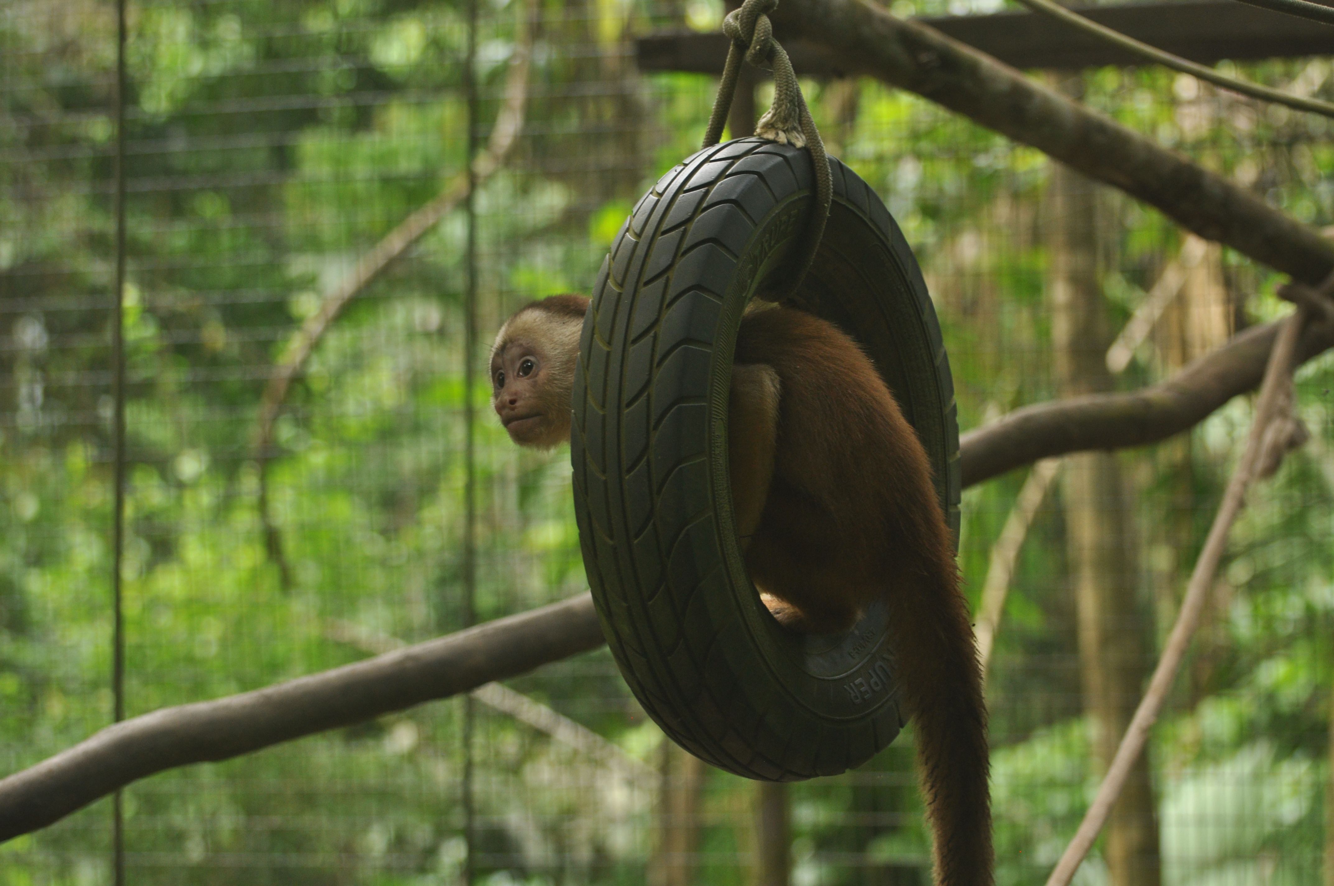 Cesar (male spider monkey) and Nando (male white capuchin) were raised from a baby by a woman living in Pucallpa and then were later confiscated by the Ministry. Apollo (male large headed capuchin) was found on the streets. At first Apollo was separated but soon we noticed the interest he and the others had in one another, and as space was sparse we decided to introduce him to Nando and Cesar. Panki also joined the group as he would benefit from the company. He would get more stimulation to eat, as eating is a very social thing with most monkey groups.