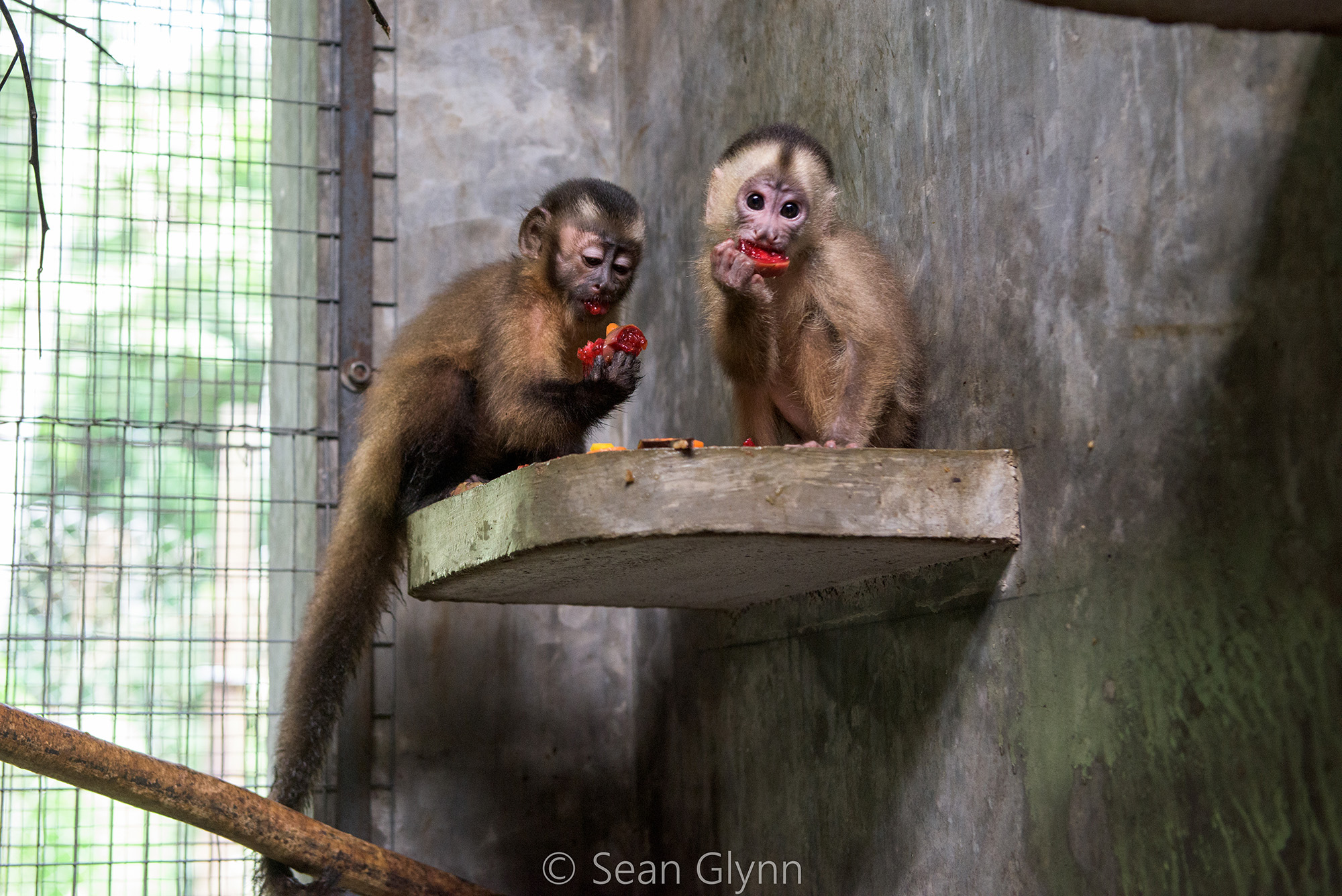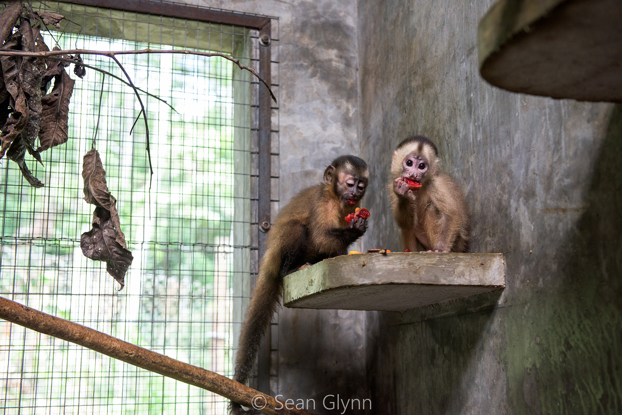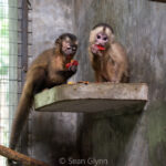 Ezra (female white fronted capuchin) has finished her quarantine period at the clinic, however has remained there to settle in. Daytona was brought up from Pepe cage where she stays to keep Ezra company and hopefully Daytona can convince Ezra to move and explore a bit more, as most of the time she is laying in her hammock. Their introduction went without problems and we are confident that Ezra will be joining the group of wild monkeys soon.