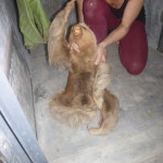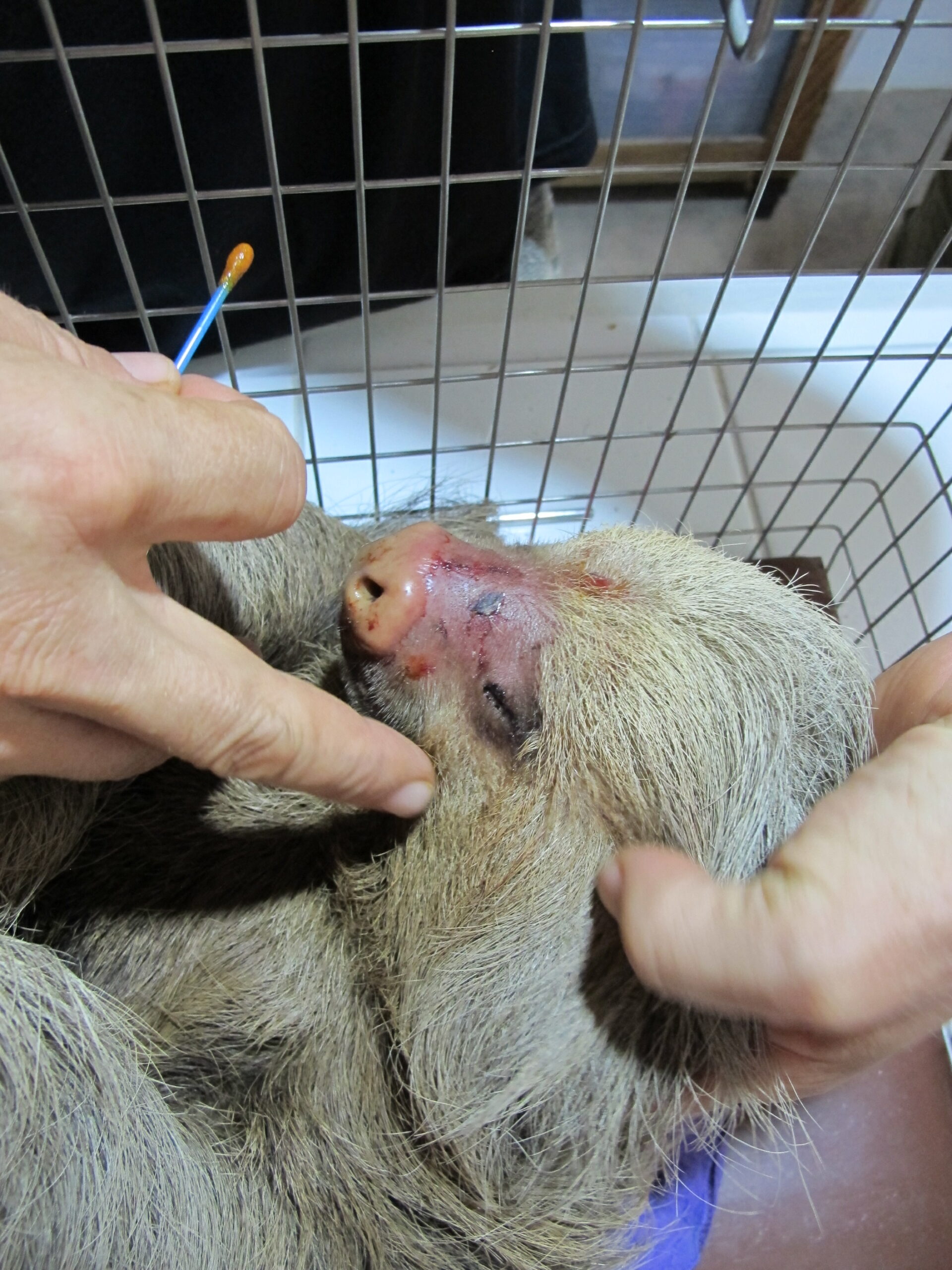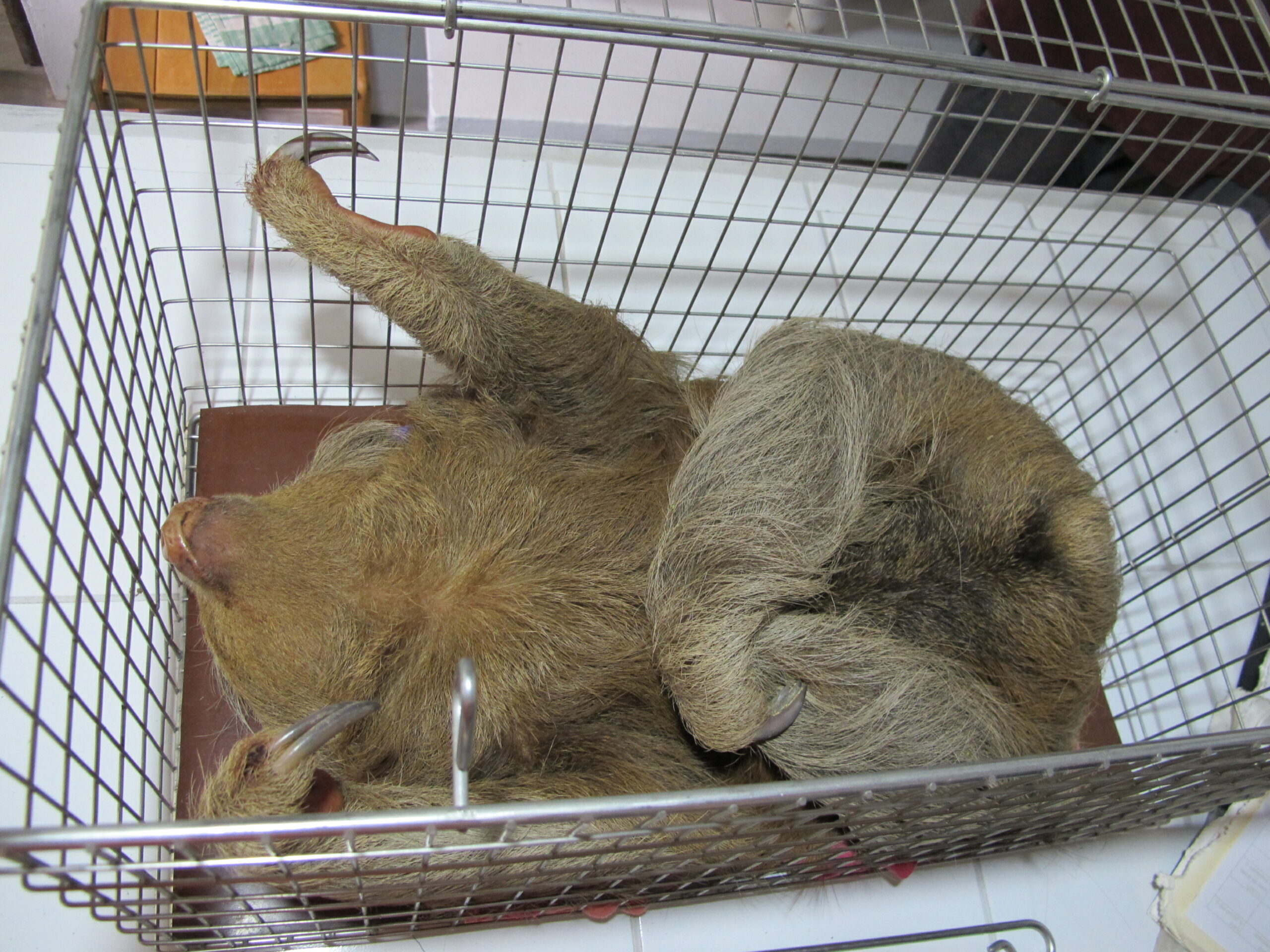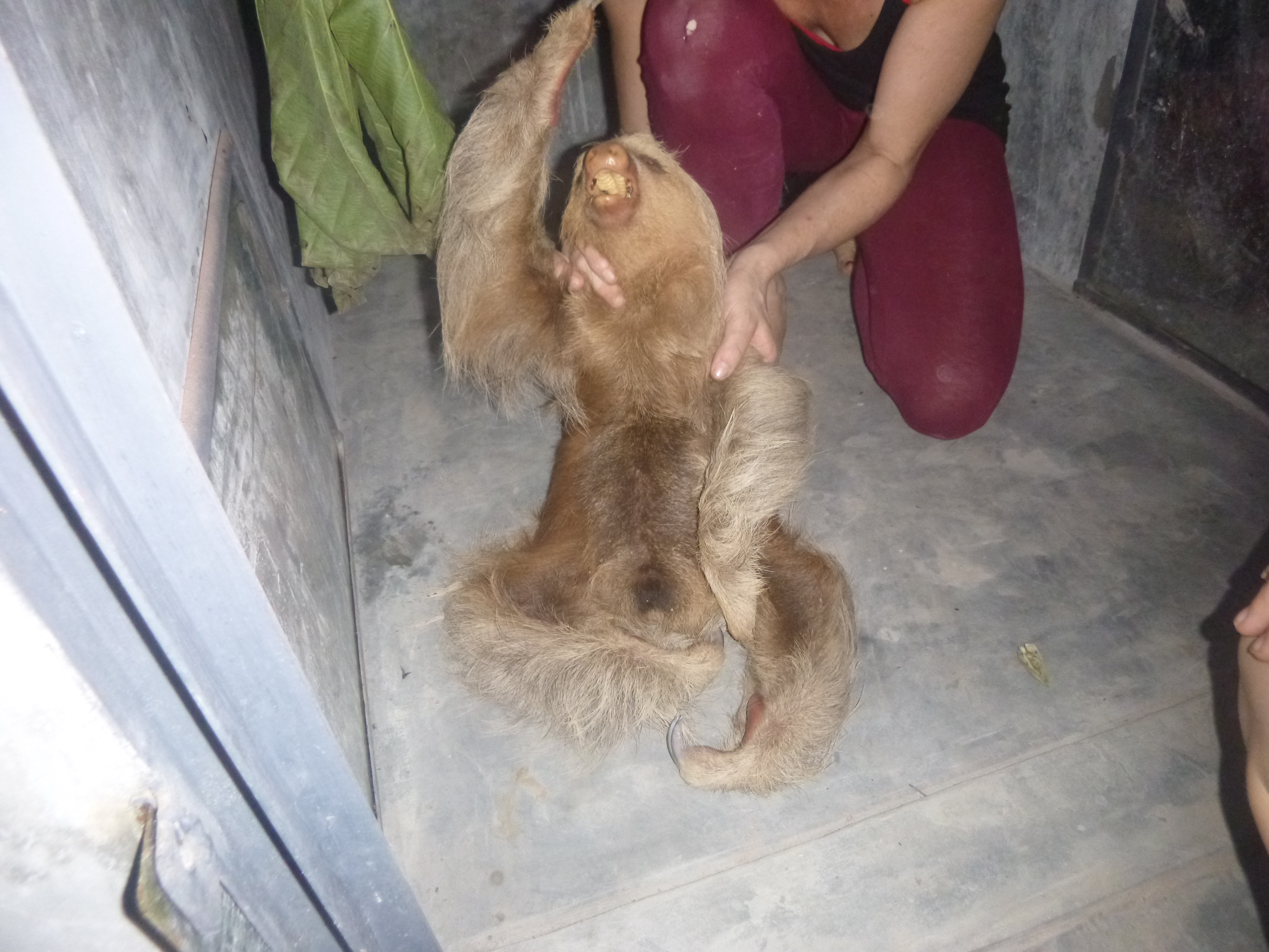 At Esperanza Verde, a new arrival seems lately an incredibly frequent occurrence. One of the more notable rescues though, was a sloth, who had unfortunately been hit out of a tree in Bello Horizonte by some children. Whether intending to cause injury or not, the children did not leave the animal in a good way: it was suspected the sloth had fallen on her head, and one eye was bloody. Other children though saved it and we were warned to pick it up.