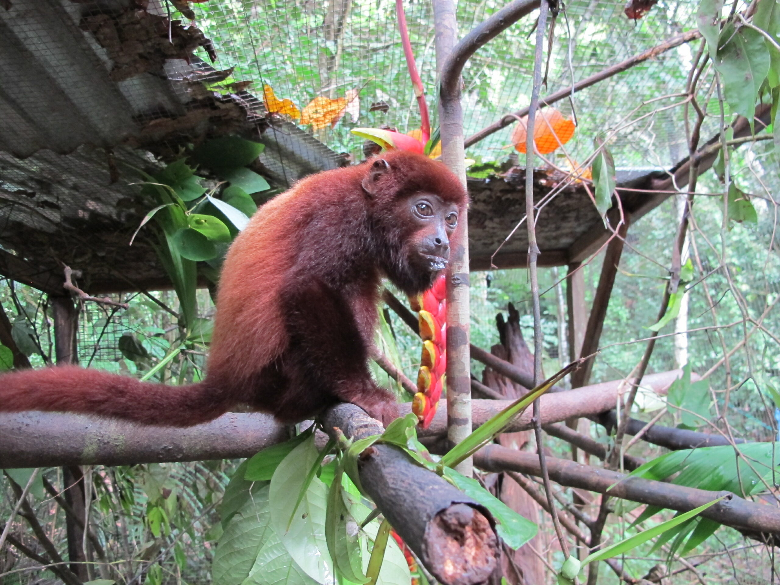 At the beginning of the 3 week period, Sango was one of the animals needing the most attention at Esperanza Verde. Howlers, very sociable creatures in the wild, are extremely difficult to care for in captivity, due to their specialized diet and being prone to depressive states. The howler did indeed seem depressed frequently, and would rarely emerge from his box at all. Often the most you could hope for was a half-hearted grab at any food you offered, accompanied by a grumpy wail. Every day volunteers were foraging for leaves from the forest for him to eat.