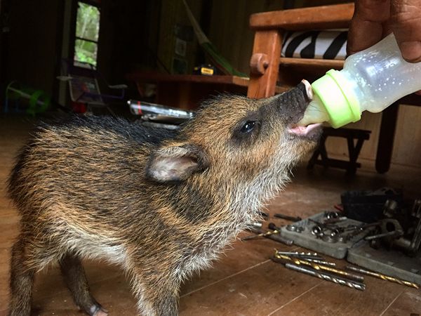 Some people from a nearby village came over one day with a week old peccary. He got the name Timo and now lives with Olivia, Douwe and the kids. Timo needs looking after all day around as he needs to be fed milk regularly since he drinks every three hours, even at night!