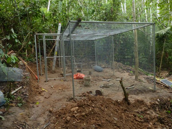 The construction of the new Zambo cage is going well. The iron structure of the cage is now done. Next up is the cement flooring. The cement and sand needed to build this new floor was carried up from the port by a few brave volunteers, after a lot of sweat the materials needed to complete the flooring were finally ready to be mixed, poured and set.