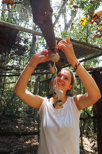 One of the things they got going was the making of enrichment again for our resident animals. There was a friendly competition of who could come up with the best enrichment and team ‘Playviary’ won. And as the name gives away it is a playground for the Aviary. It is yet to be made but we look forward seeing the birds enjoying it. Iain and Lauren have now left but the enrichment making is still continuing, the spider monkeys, the kinkajous, the birds and Churi are all enjoying their new toys.