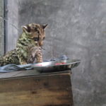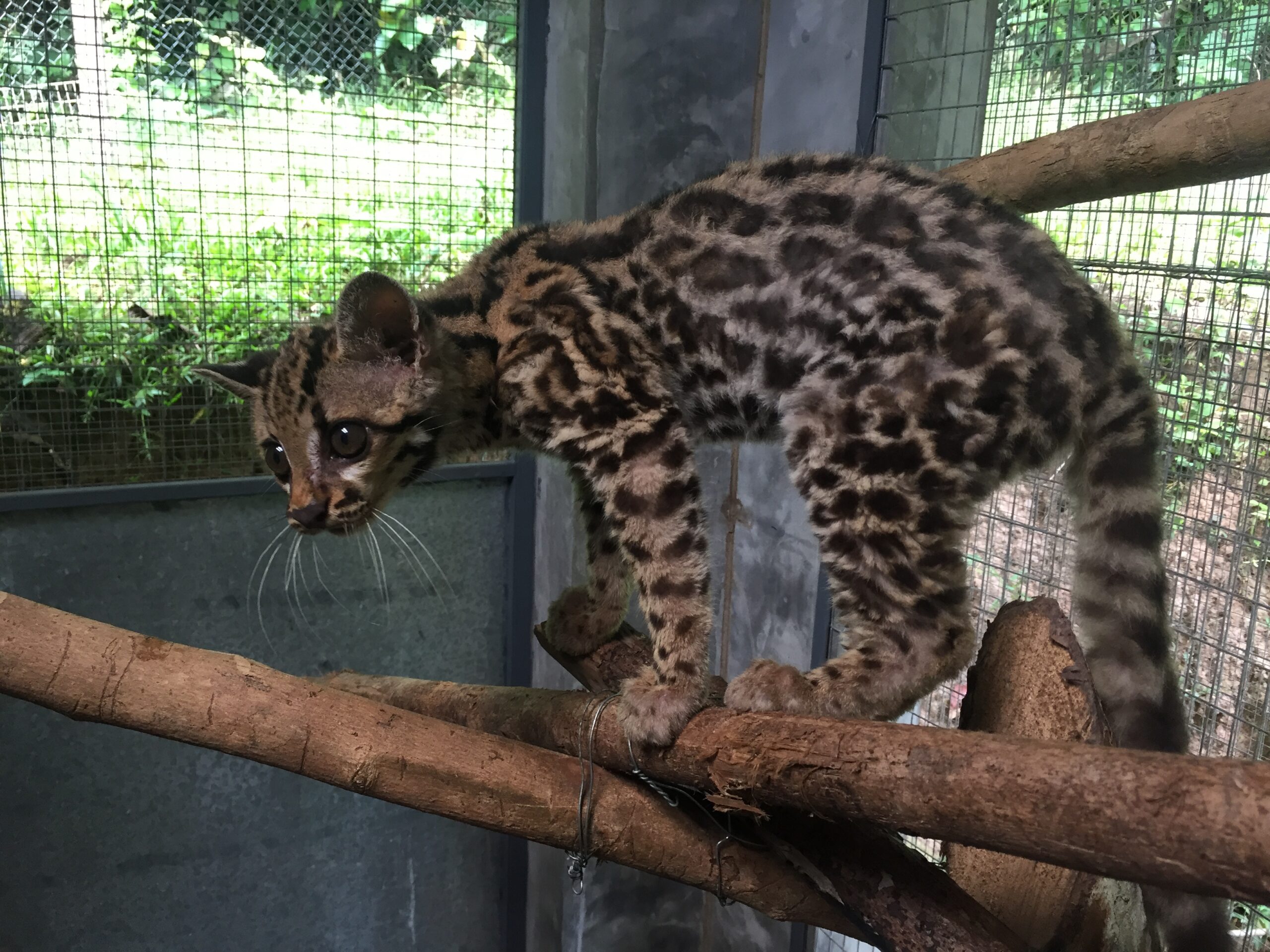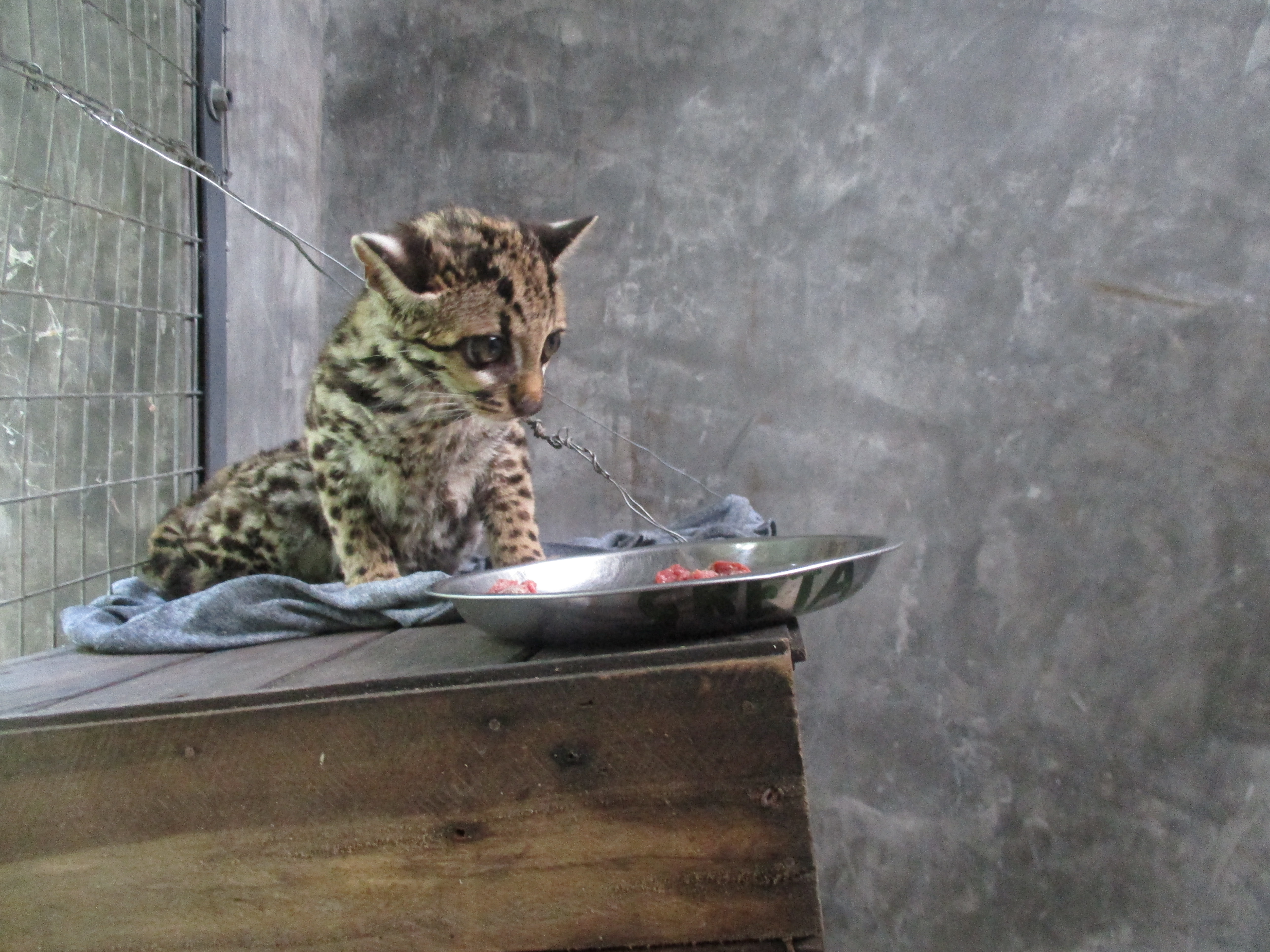Last week two people from a nearby village came by to ask us if we could take care of Grety (margay, around 6 months old). They found her near their plantation and kept her as a pet for five months. She became too expensive (always needing chicken) so they decided to bring her to us. We showed them around Esperanza Verde and explained the importance of our work. Now Grety is in the SUST Animal Orphan Hospital where she is being taken good care of. She looks healthy, a bit skinny and she needs some brushing. She cannot be released in the future so she will be one of the residential animals at Esperanza Verde. That is why, next to feeding and caring, we also put a lot of effort in giving her a lot of enrichment.