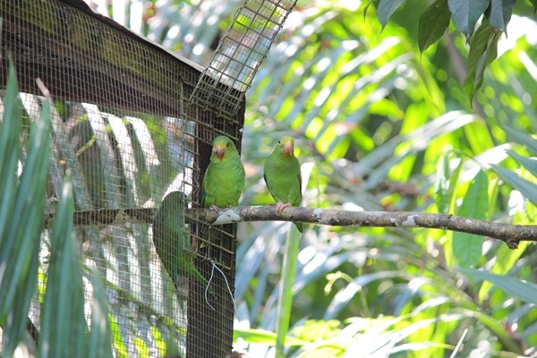 Luke, Jack, Everell, William & Joe are finally released! They started their journey back in September last year when they arrived here as small chicks. Hand fed by syringe they were raised by us. And in hope of not getting them to tame (we never petted them or let them get on us) they were put together with the non-flying parakeets and have been with them since. It seemed they were learning more and more to stay away from us. In the beginning they would still fly toward us at feeding time, but in time you could not even catch them when we tried. So the time came to do another separation between flyers and non flyers. We thought The Daltons should get their chance and together with the other flyers they quickly made their way out to freedom! Unfortunately it did not entirely turn out this way. On the second day, one of The Daltons was unfortunately caught by Axira (female white fronted capuchin) and killed. Because of this we’ve reviewed our release policy and birds considered too tame will be recaught. So by now we have two Daltons back, and two are still out with several white-winged parakeets. Let’s hope they learned and will be able to make it on their own with the help of the other outside parakeets.