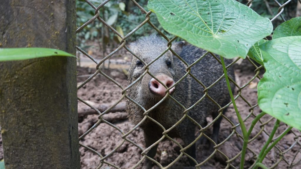 This month the turn came to the peccaries to be chipped! The only one that got successfully chipped so far is Timo (no strange thing since he is the youngest and tamest one & he has the smallest tusks!). Douwe, together with the help of Kayla, got him closed in against the fence with a piece of wire mesh and was able to chip him! Now only awaits the two bigger ones!