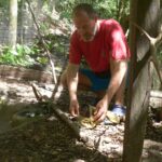 He was seen just before dark with half of his lip hanging down. As it was getting dark and he was up in the trees it took us till the afternoon the next day to get him in the La Sapa cage. The spidermonkeys got moved in the morning to be able to lure Kamari in. Douwe anaesthetized him with the blowpipe, and could stitch his lip up (a cut from top till chin). We hope it will heal well or at least nicely enough so he will be able to eat normally. He might not be the most handsome anymore, but time will tell. For now we keep him in for his treatment and observation.