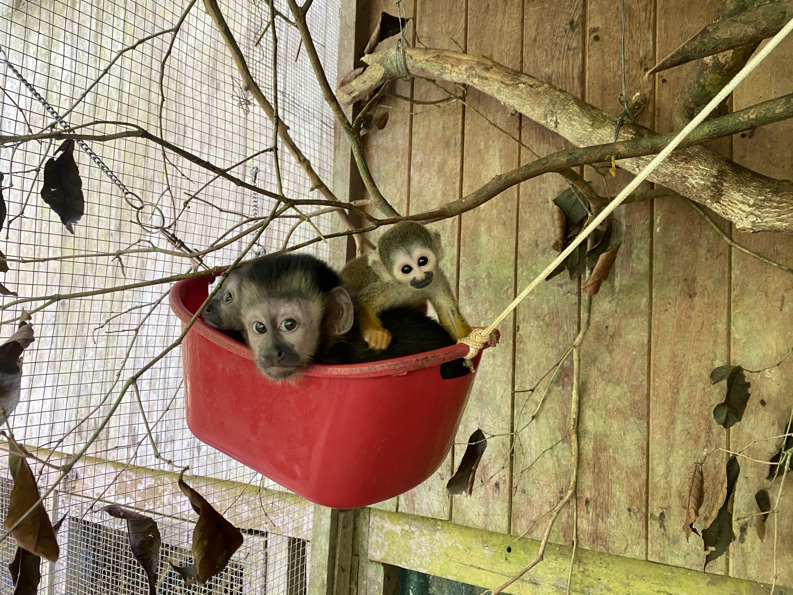 Anora, our new female squirrel monkey, quickly bonded with Shana and Kalu, a young female and male large-headed capuchin who arrived earlier this year. Shana and Kalu have been growing fast and doing well. All three are now in a larger space at the clinic, where they can climb more as they prepare for the next stage—moving to an outside enclosure before their eventual release.