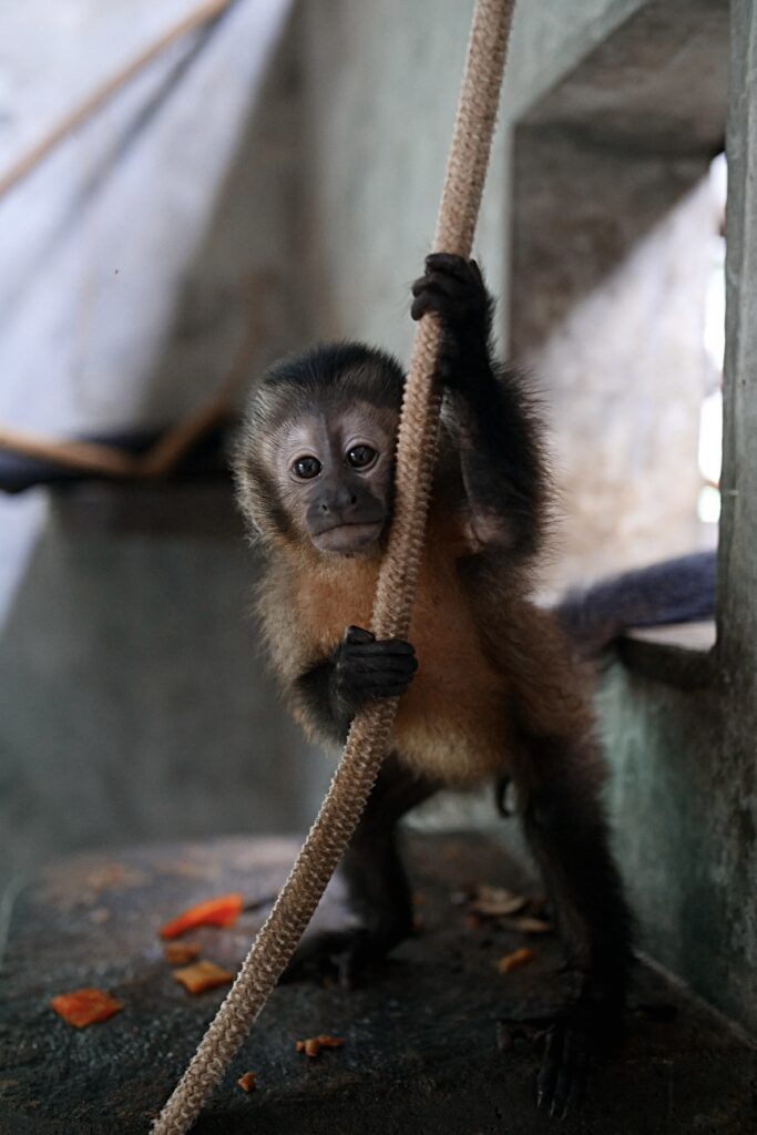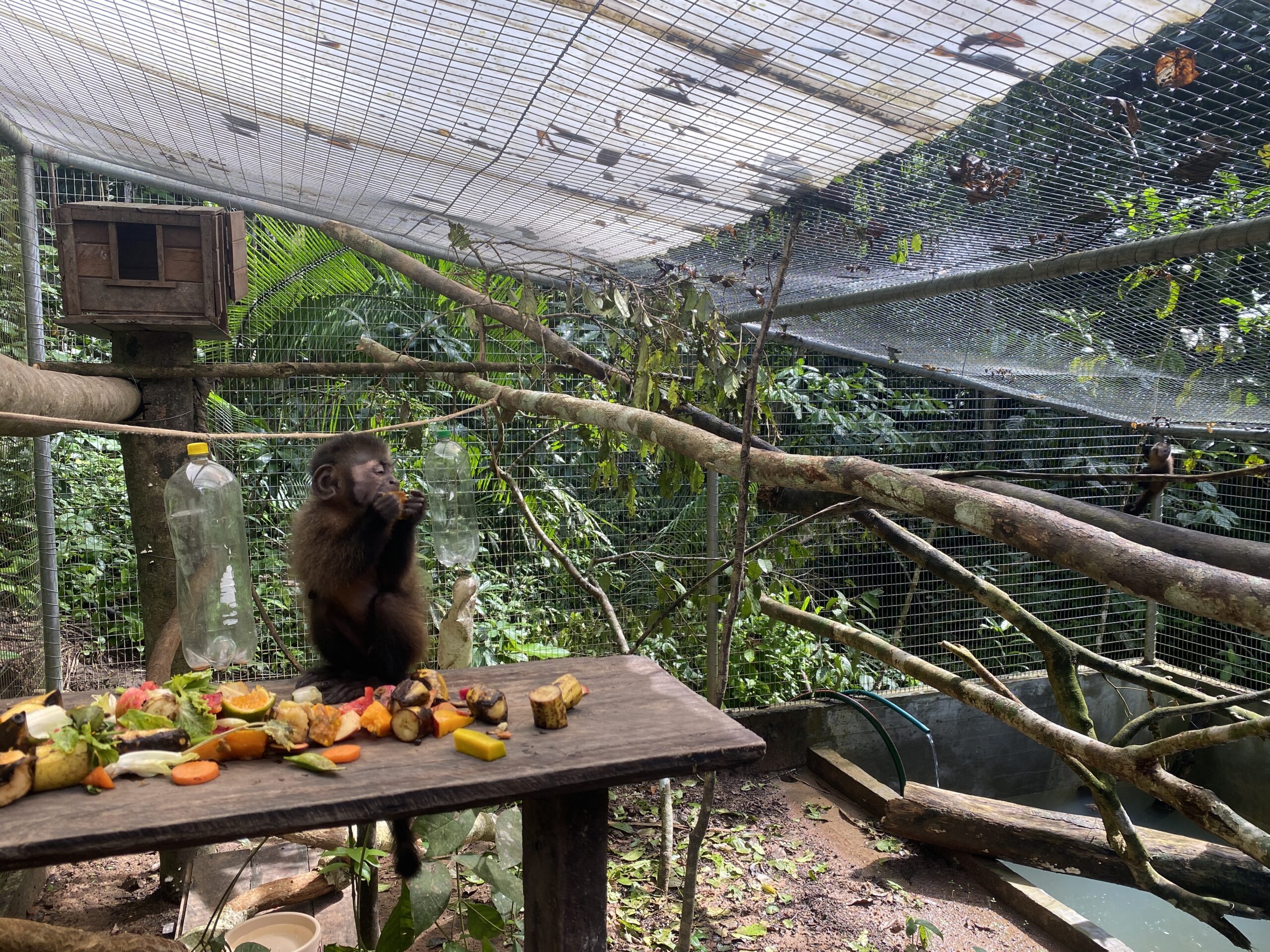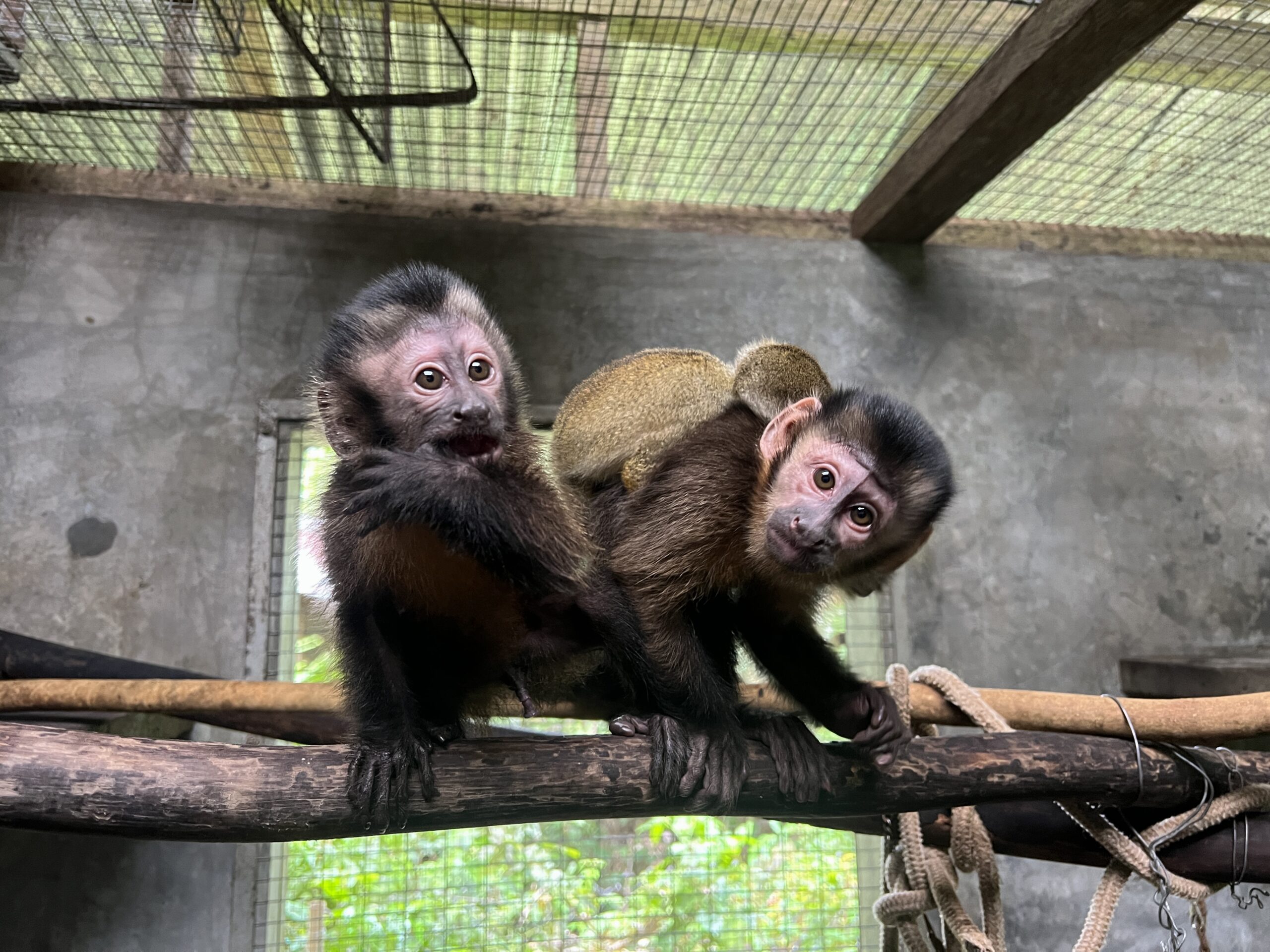 Kenzo and Pacco, young male large-headed capuchins, have moved to the Anishka enclosure as the next step in their rehabilitation. They have yet to socialize with the other capuchins outside but have received many curious visits from the woolly monkeys!