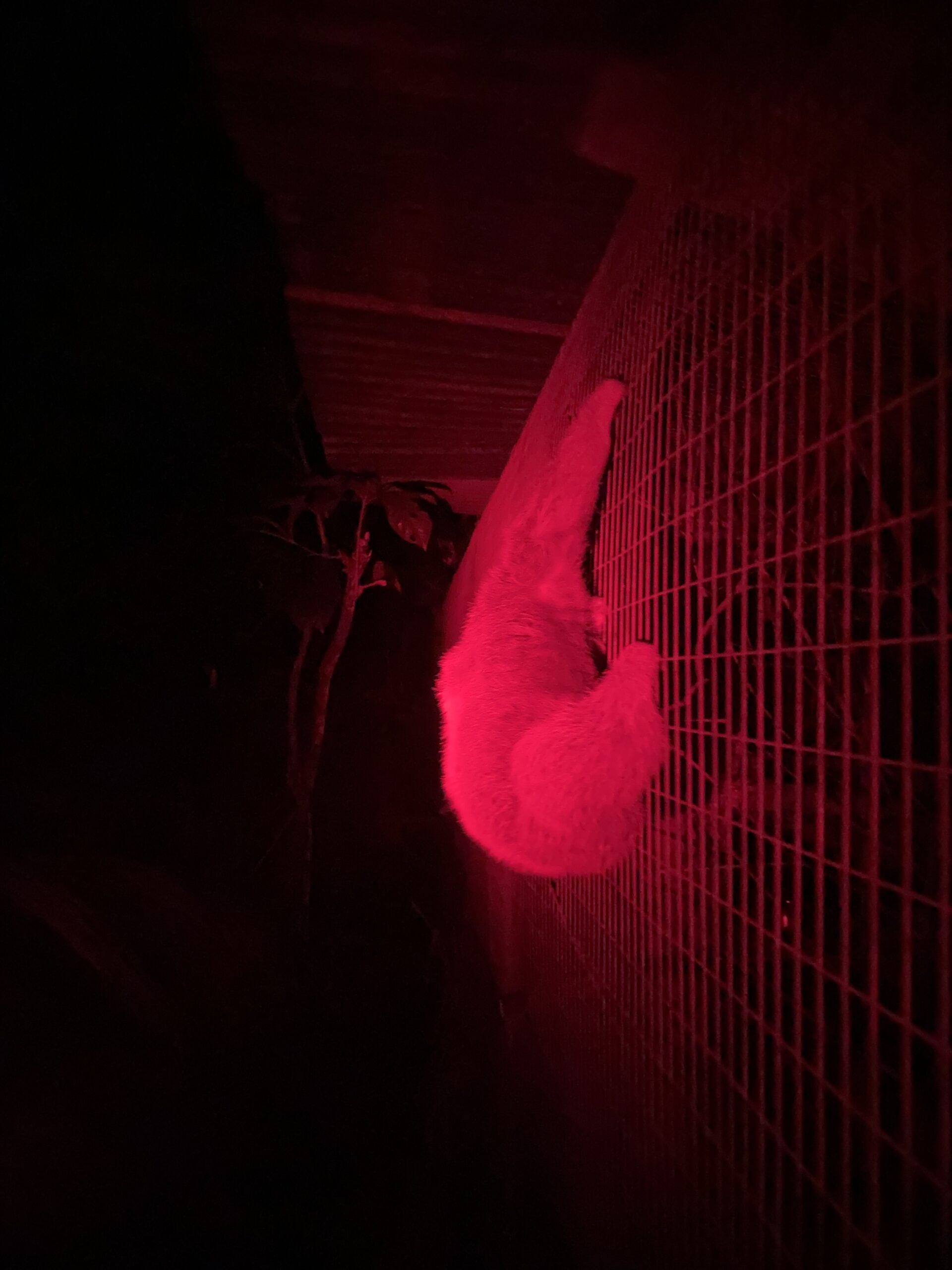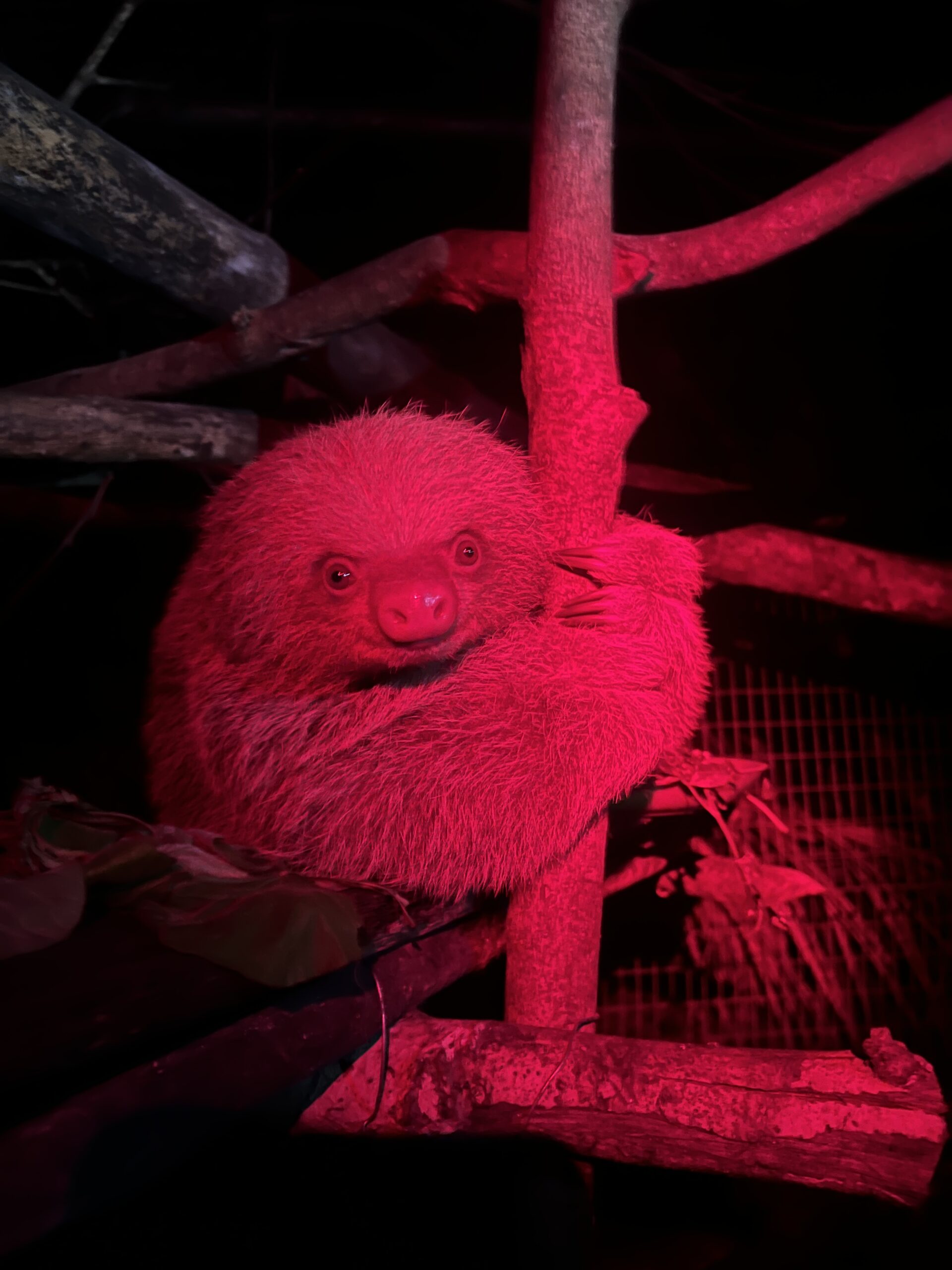 The female two-toed sloth, Saphira, has been going out at night. While we can’t be sure she ventures out every night (she’s always back in the morning), there have been two occasions where she was absent during the day, only to return in the evening. This type of soft release helps her adjust to the wild while still having the security of food and shelter.