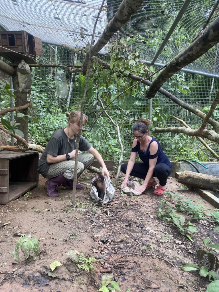 Coya, one of the adult woolly monkeys, had a miscarriage and required intensive medical care at the family’s house. She’s still recovering but has moved to a small outdoor enclosure. She is eager to rejoin the group, but we worry about her falling from trees as she remains slightly unstable. She’ll stay under supervision until she regains full strength. A huge thank you to our international vet team, who are always ready for late-night calls from the jungle, and our team here at EV for their incredible dedication!