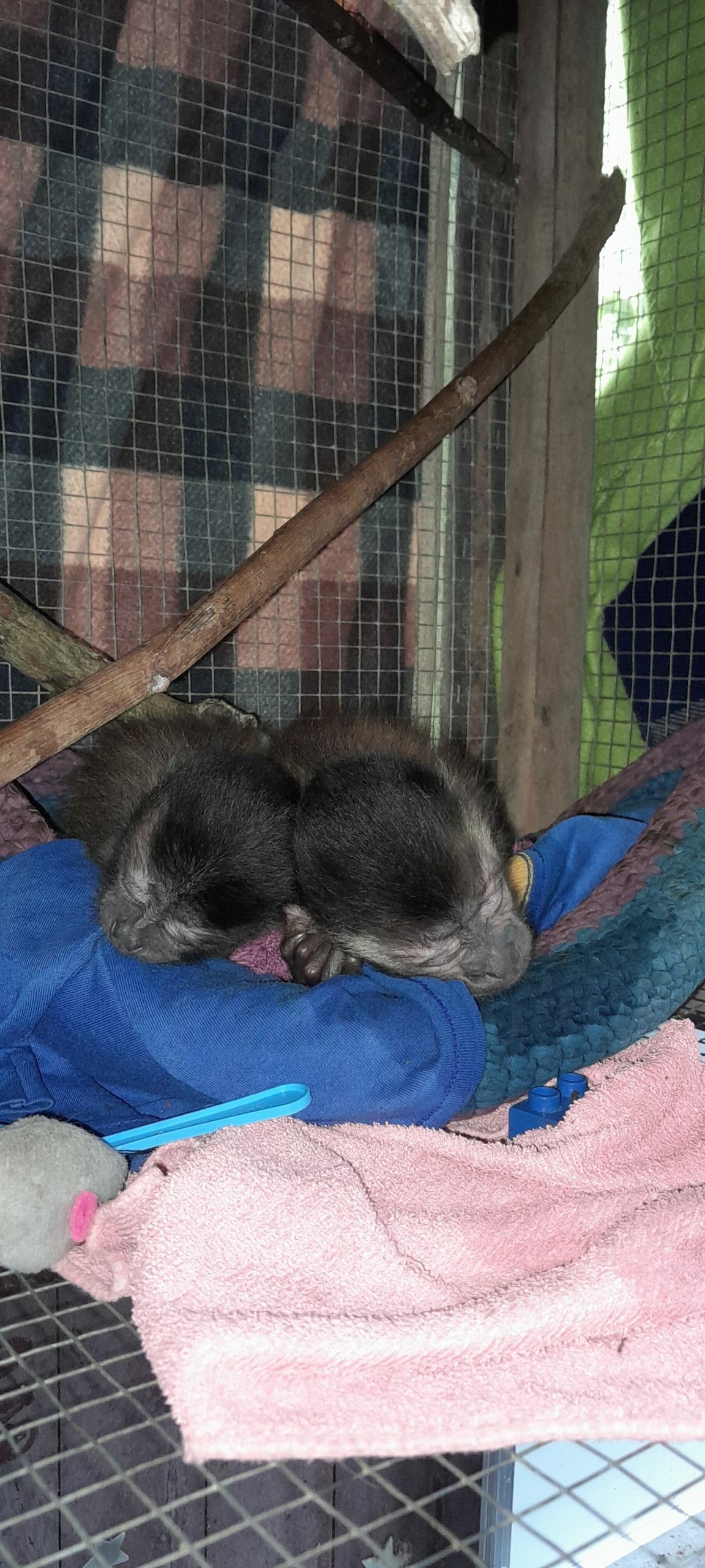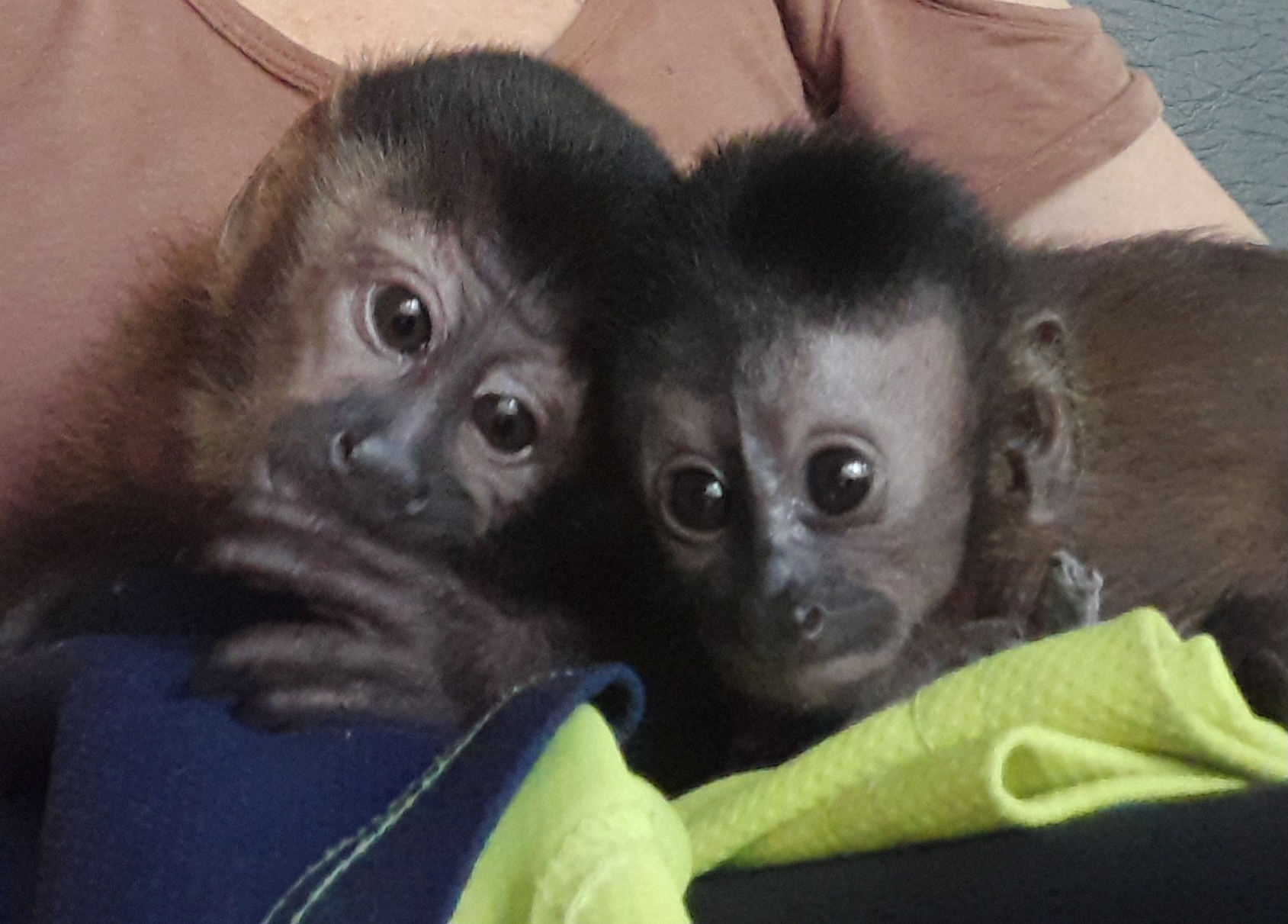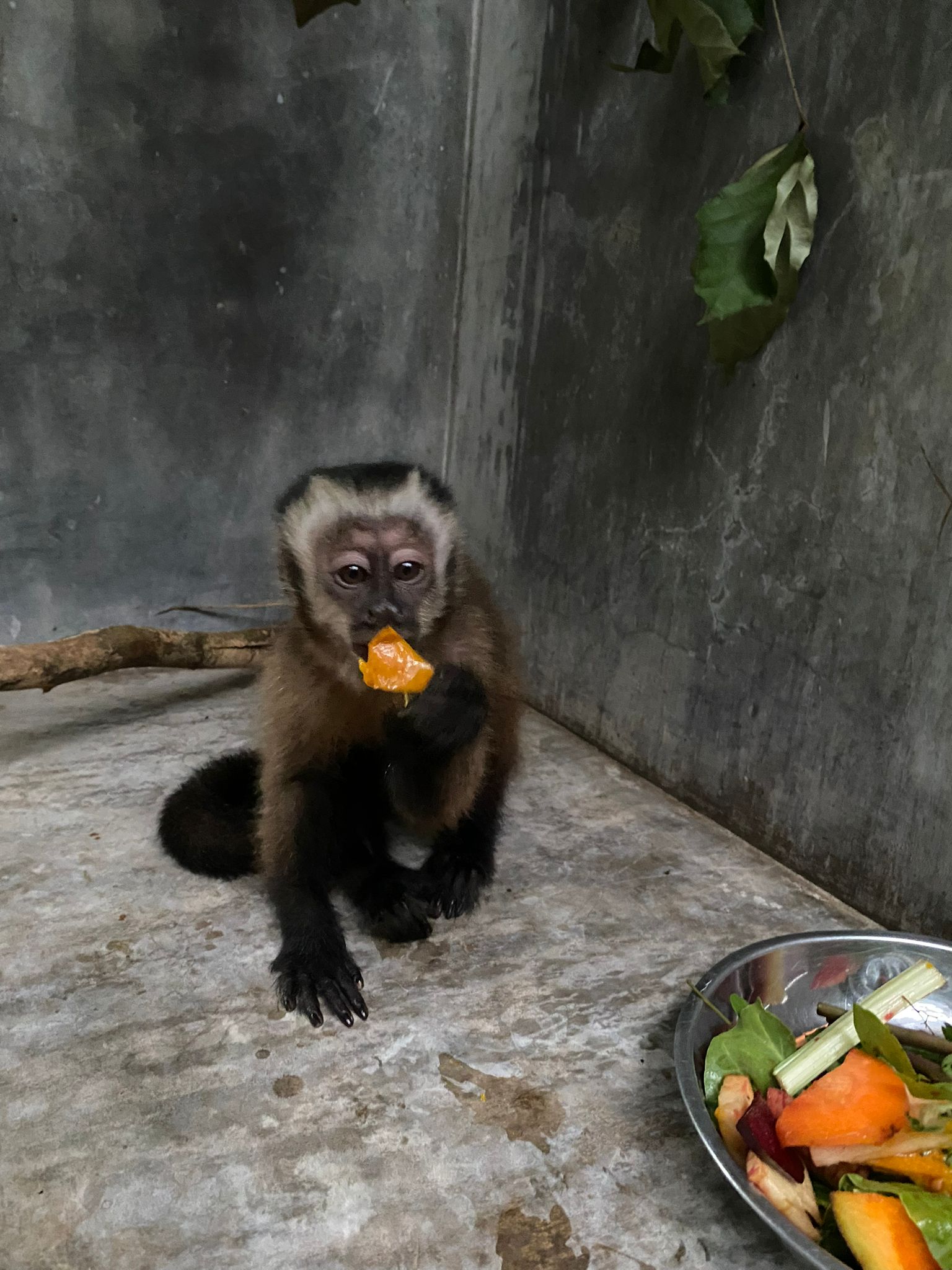 Two very young capuchins also arrived: Kalu, a male around 8 weeks old, and Shana, a small female only 4 weeks old. Kalu was found abandoned on the street, while Shana was handed over to the Ministry. Both their mothers were likely killed. For now, they’re receiving infant care at the family house until they’re old enough to start the rehabilitation process.