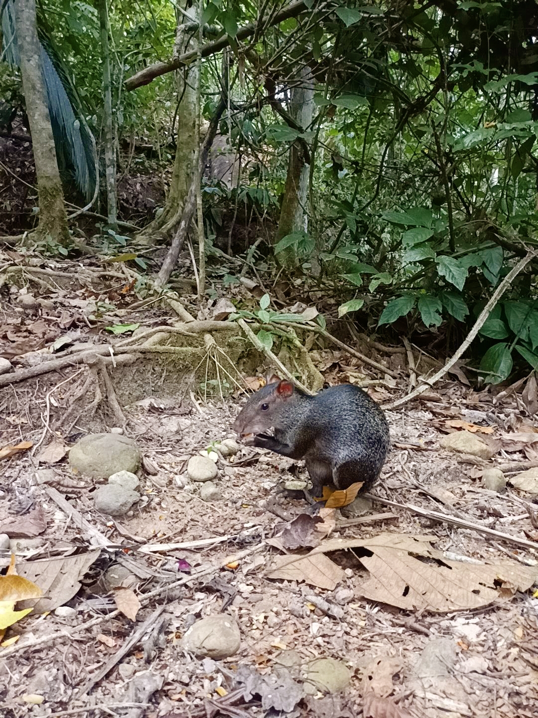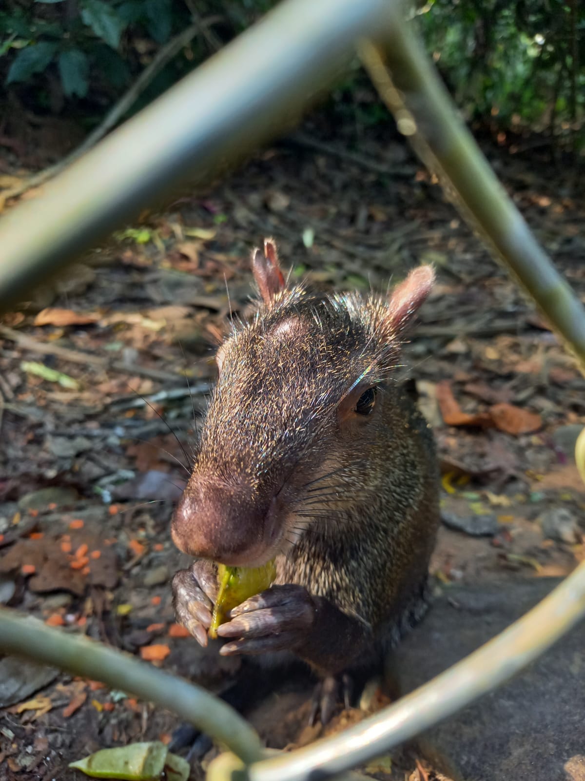 Kampari (young female agouti) successfully moved outside to the “Xena” enclosure. She immediately began to forage for wild food – a great sign. Her neighbours are our four resident agoutis, and once they get to know each other, we hope they’ll get along so Kampari can join their group.