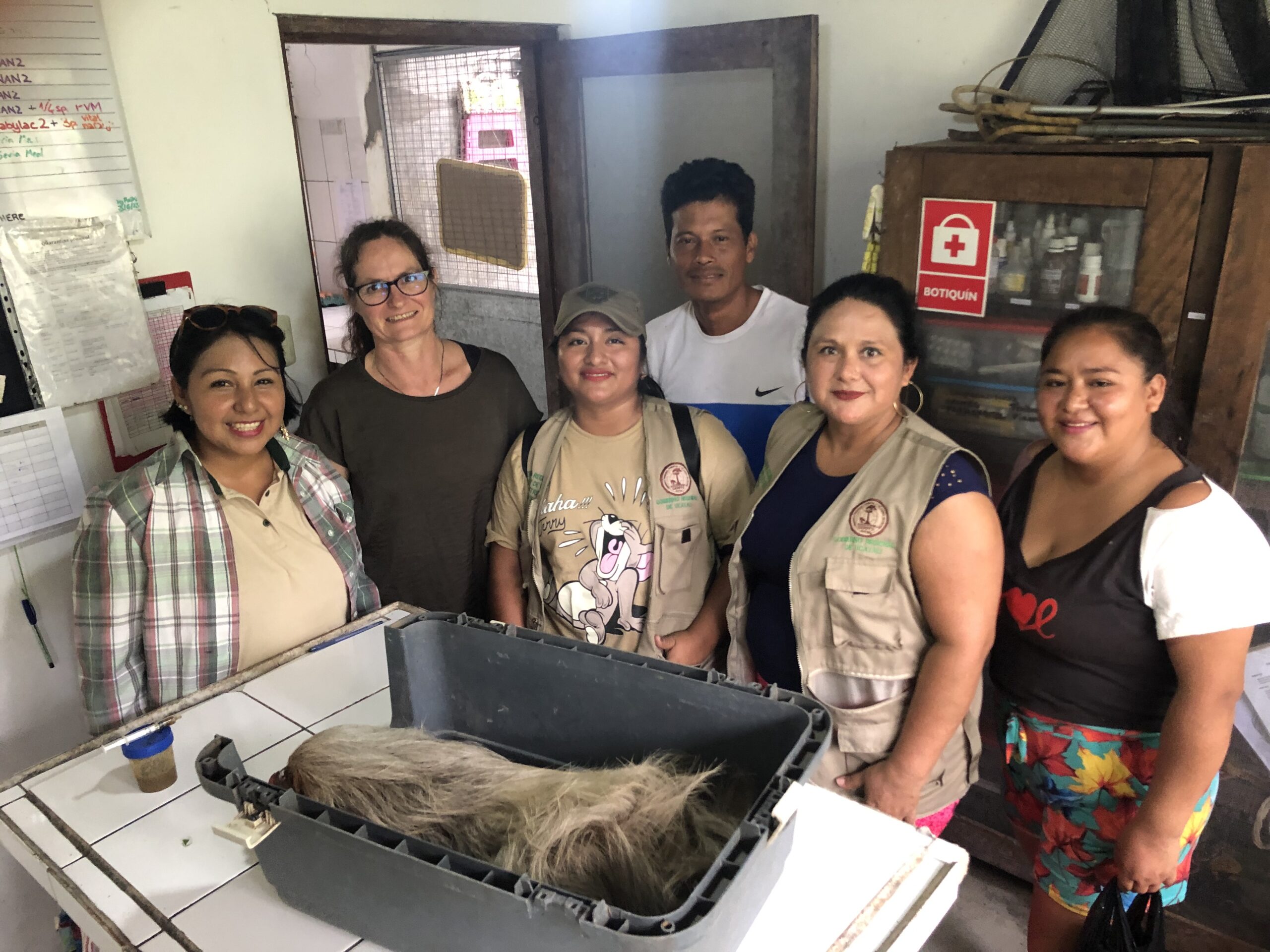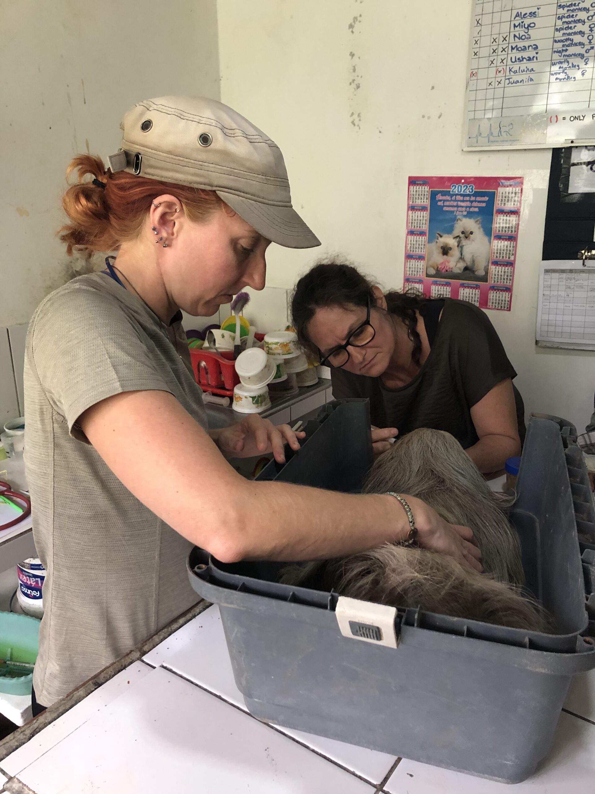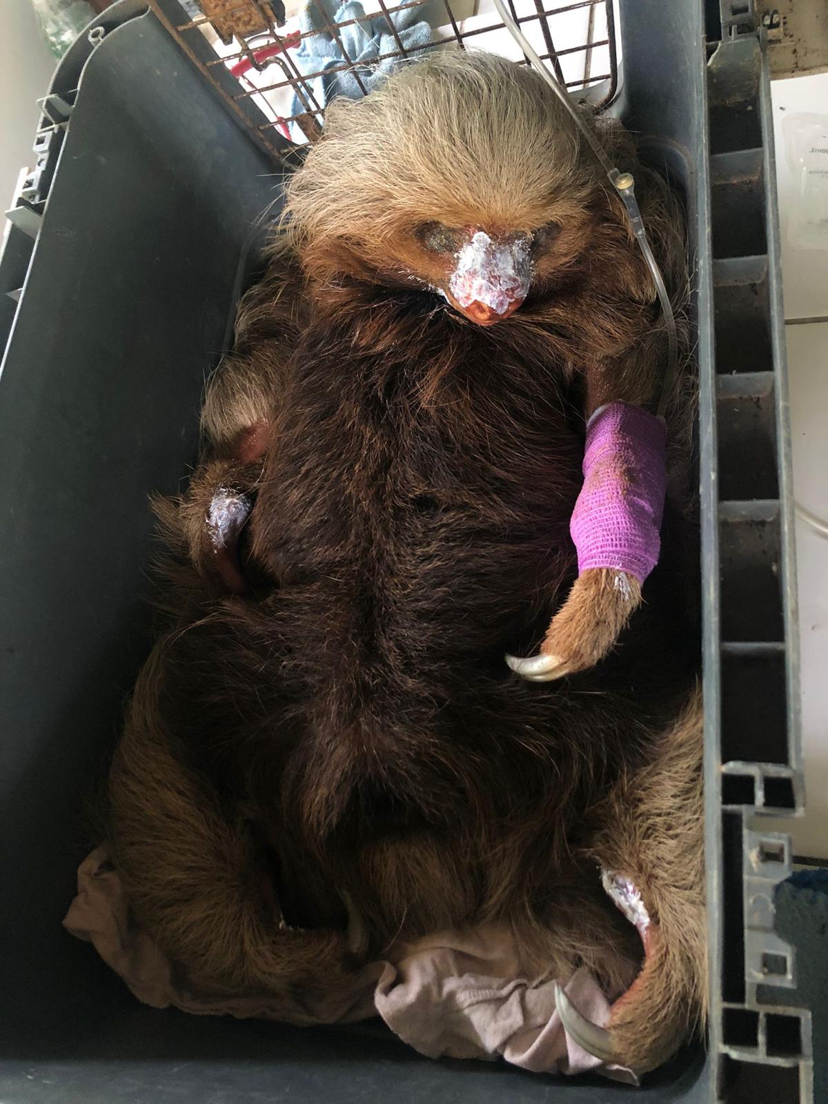 Representatives from the authorities took a 6-hour trip to EV to try and help a severely injured two-toed sloth. She was found on the ground, most likely fallen after touching electrical cables. She had severe burns on all extremities and the face. Our vet team, under the coordination of our new long-term veterinarian Sam, took her into intensive care immediately. Unfortunately, the burns were severe causing intense suffering. Her legs seemed to be paralyzed with no sensation, making a full recovery very hard. After several consultations with specialists, we decided it was time to let her go.