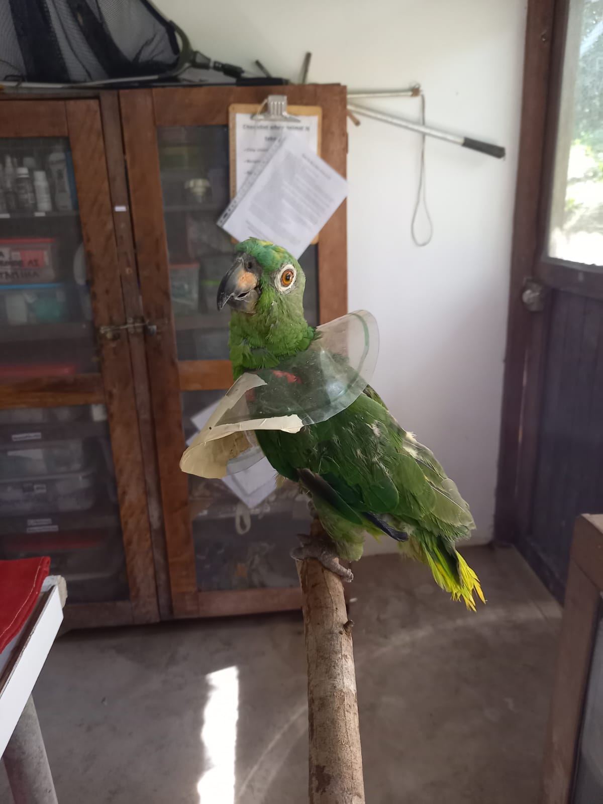 Zuna (yellow-crowned amazon) is still at the clinic. Her breast wound wasn’t healing, as she kept picking at it. To prevent her from harming herself, Douwe and Sam created a jungle-made collar. She didn’t like it at first, but she’s gotten used to it and the wound is looking really nice. Ingenious craftsmanship!