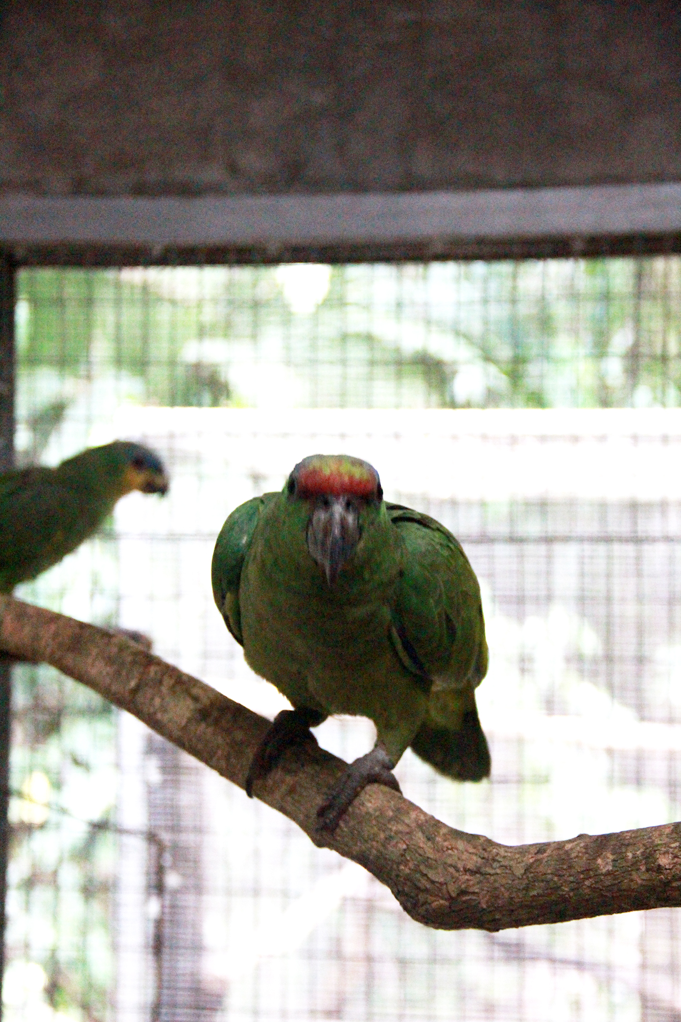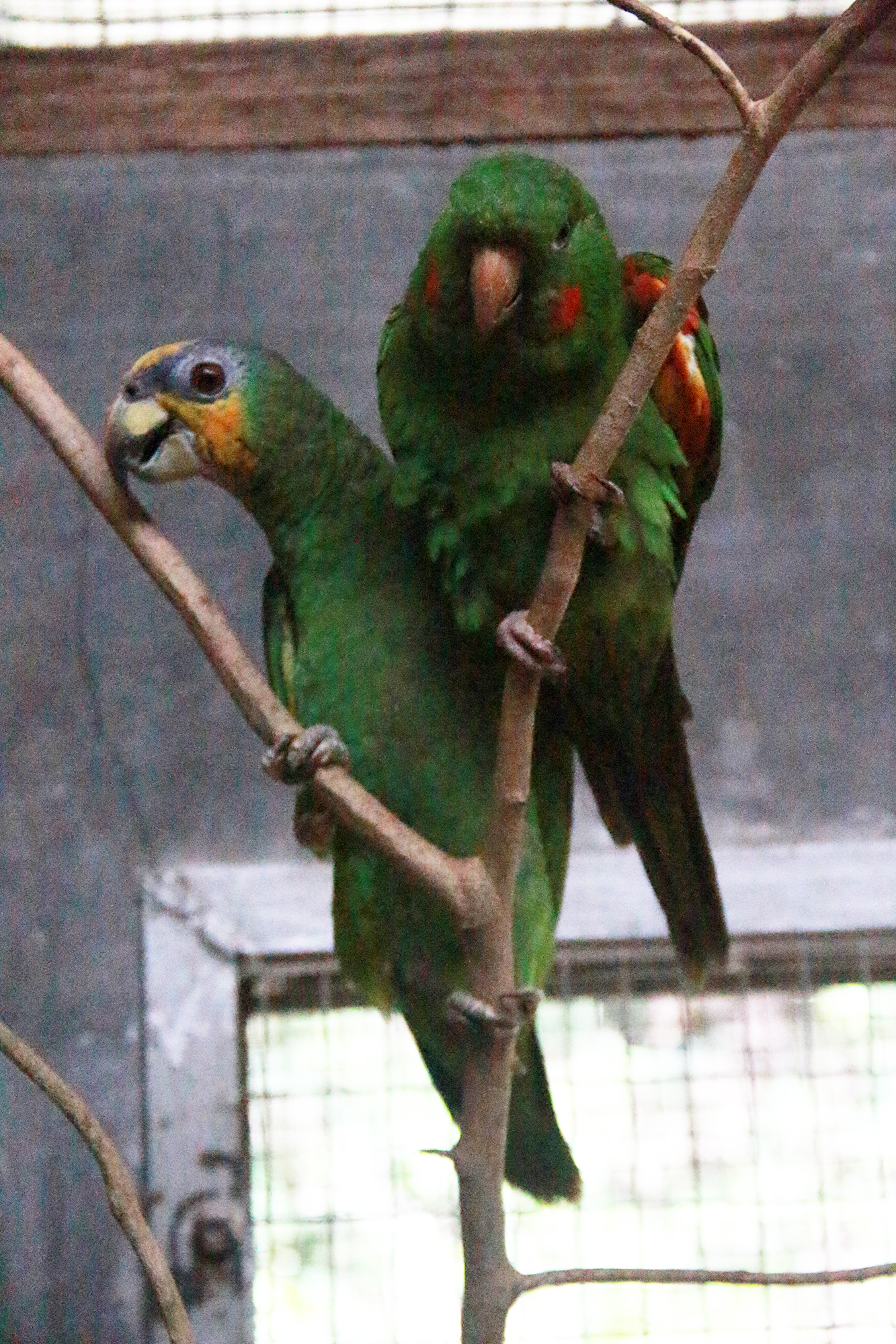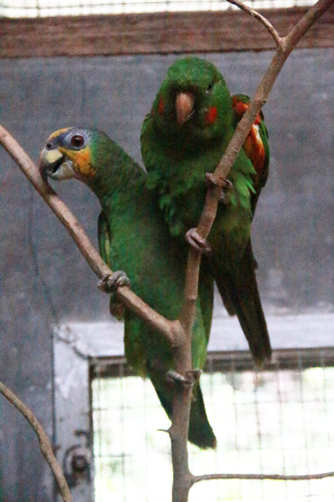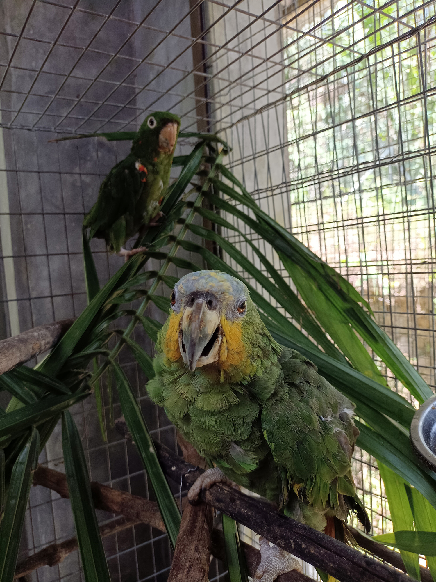 Due to their old injuries, Pichu (white-eyed parakeet) and Delta (orange-winged Amazon parrot) will never be able to fly again. So, until we find a suitable long-term solution, they will be keeping each other company in the clinic.