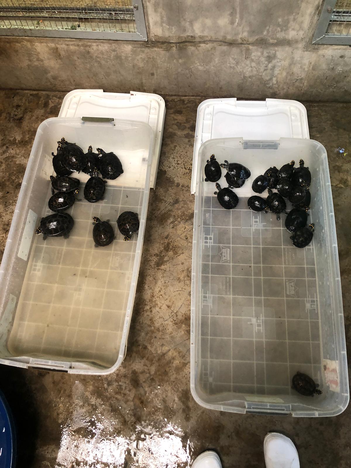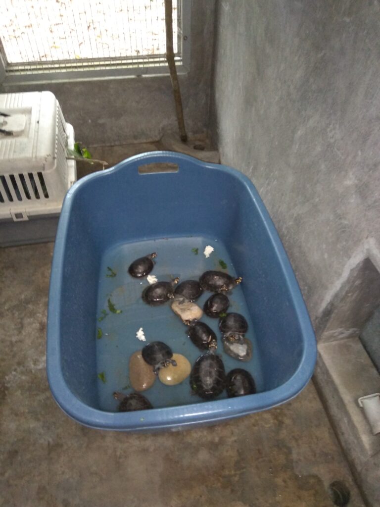 - Four six-tubercled river turtles, forty-two yellow-spotted river turtles and one giant South American freshwater turtle were all confiscated from a meat market, where the cruel seller kept these animals hidden in a bucket of chicken blood