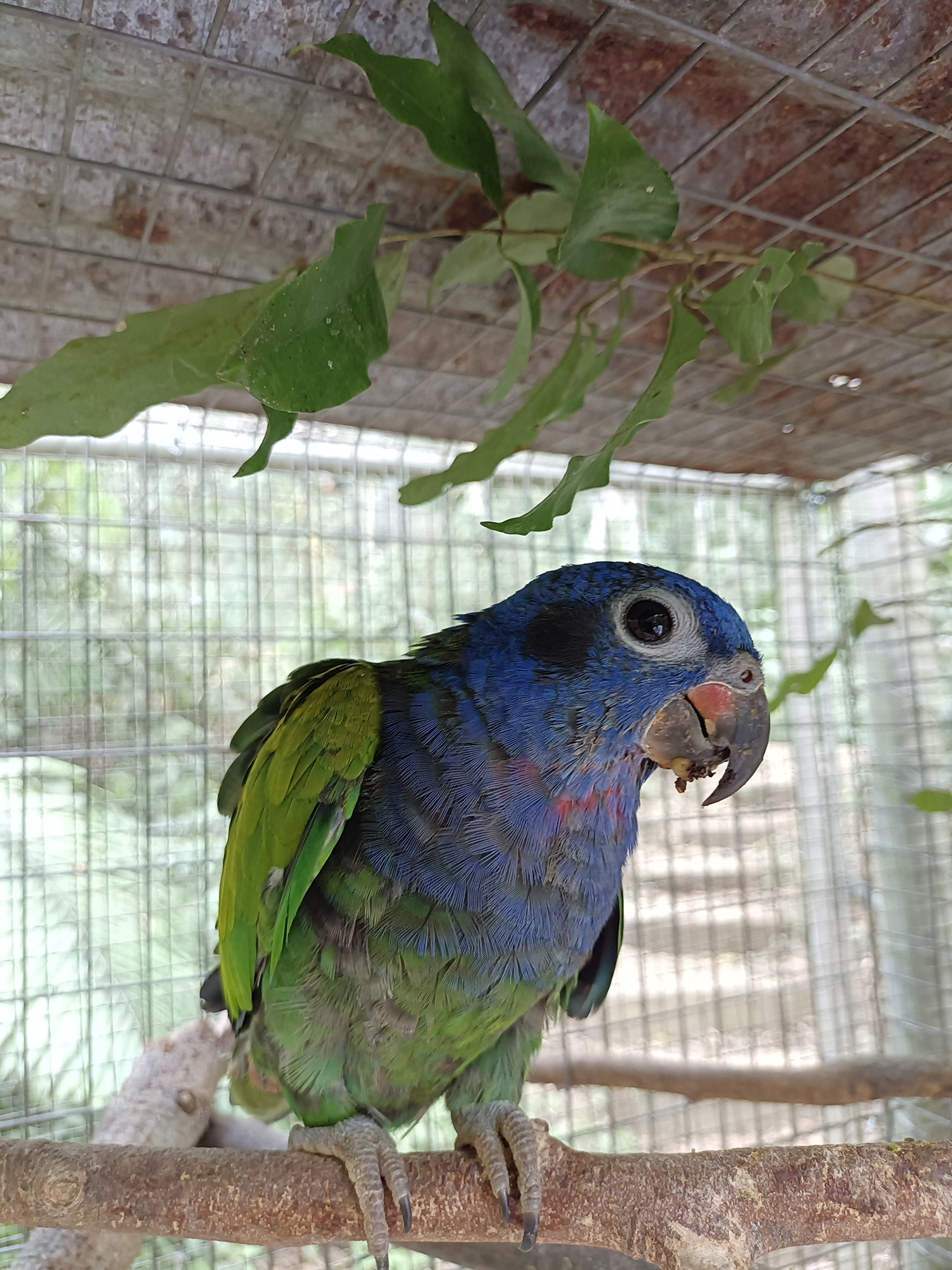 Natzu (blue-headed parrot) has moved to his very own enclosure. Well, it’s a small enclosure attached to a large enclosure where the rest of the blue-headed gang resides. This is so he can observe and get to know the others before being properly introduced.