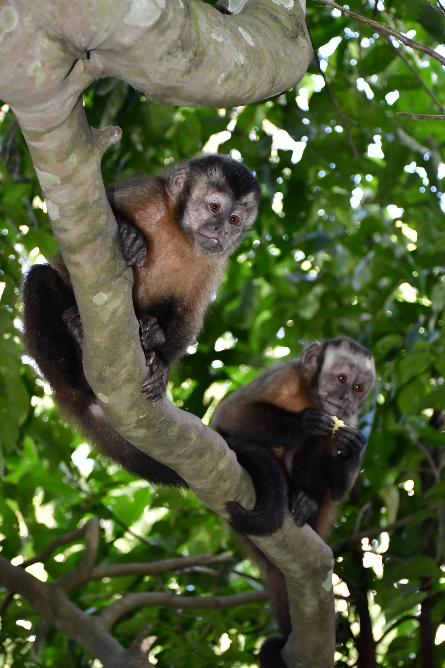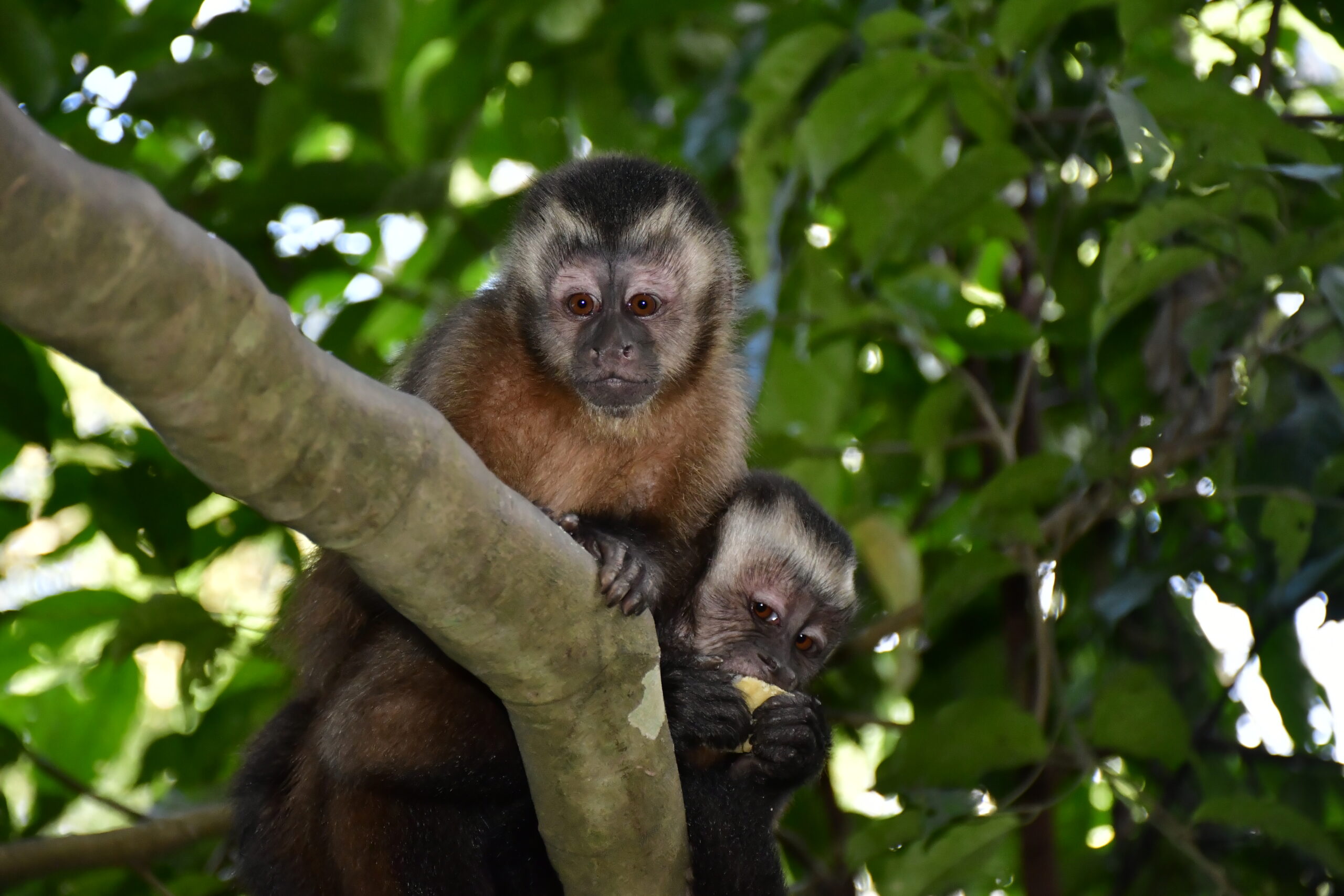 Maiko (juvenile large-headed brown capuchin) was ready for freedom after some adjustment time in an outside enclosure. Young and inexperienced as he is, Daytona and Rayka (female large-headed brown capuchins)took him into their care when he was let out. With two females like that, he is sure to get all the care he needs to find his feet!