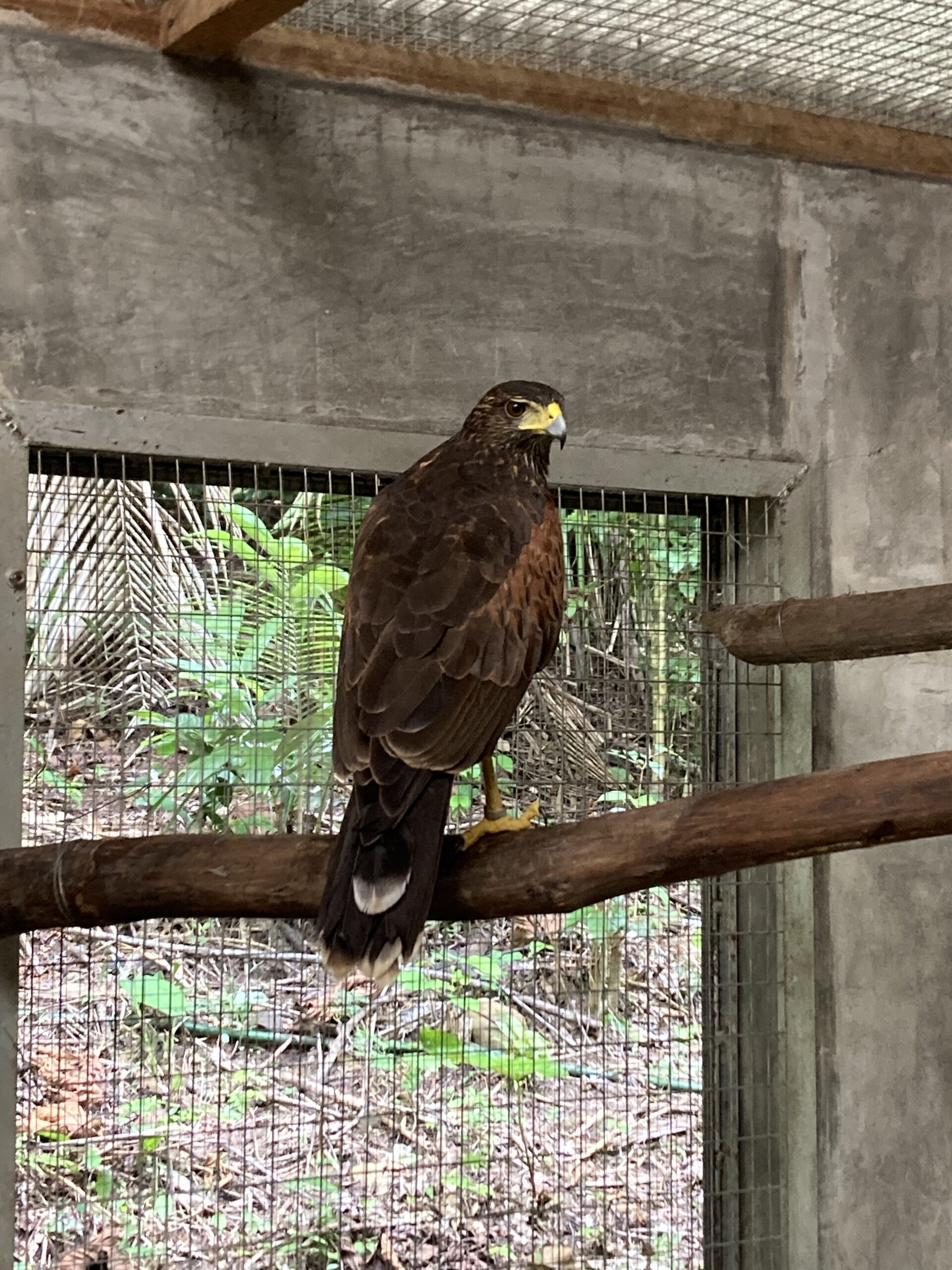The same day the release was initiated a beautiful Harris´s hawk arrived. She (we think female) was caught near Pucallpa while hunting chicken. This is not a local species and the ring around her foot gave us a clue to where her life began. In Peru, this species is legally bred in captivity and trained for flying. So, she must have had or still has an owner somewhere. We are looking into all this while keeping her happy and busy. It is a different kind of thing, working with a trained animal like this. Strange at a rescue centre, but also beautiful in its own way. Never a dull day in the jungle!