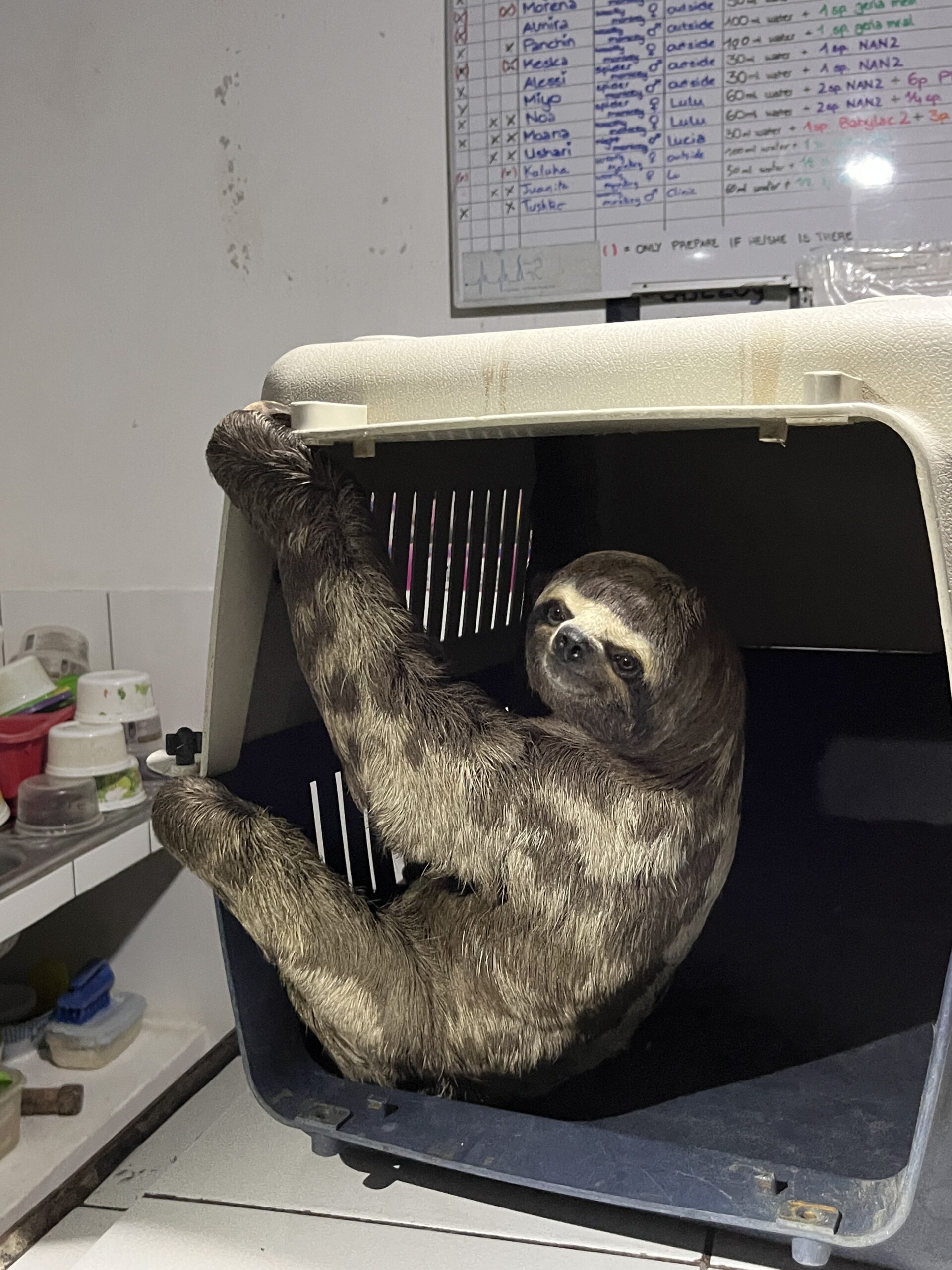 A wild three-toed sloth was climbing his way to safety, from a forest fire, onto a ‘moto-carro’ (also known as a tuk tuk). The owner rescued him and thanks to the convincing powers of Puck (volunteer and part of the big EVI family), the sloth was released again in the forest surrounding EV. Of course, not after we all had a good peek! All smiles here.