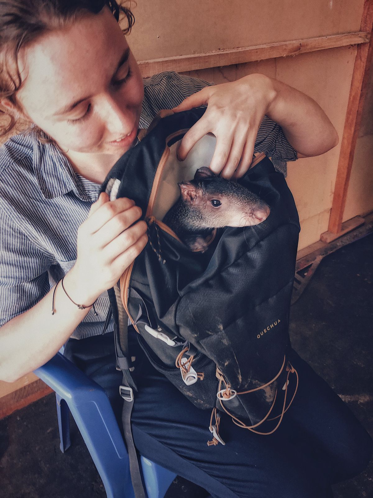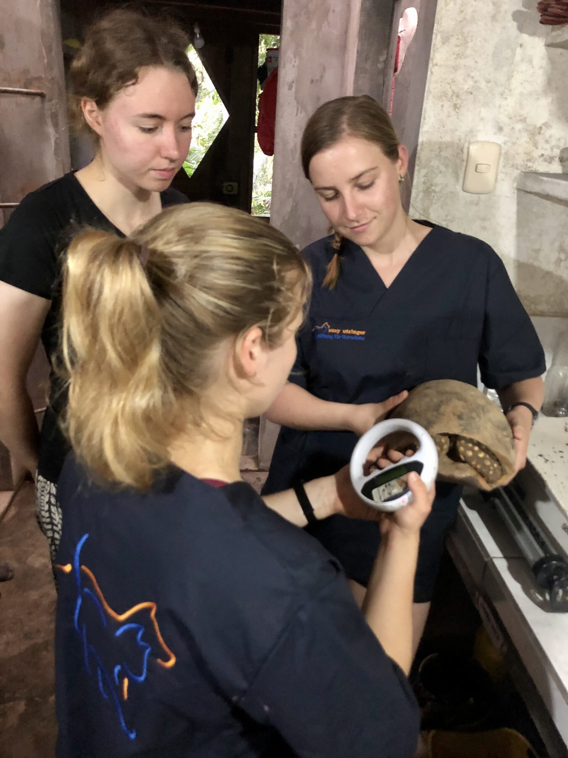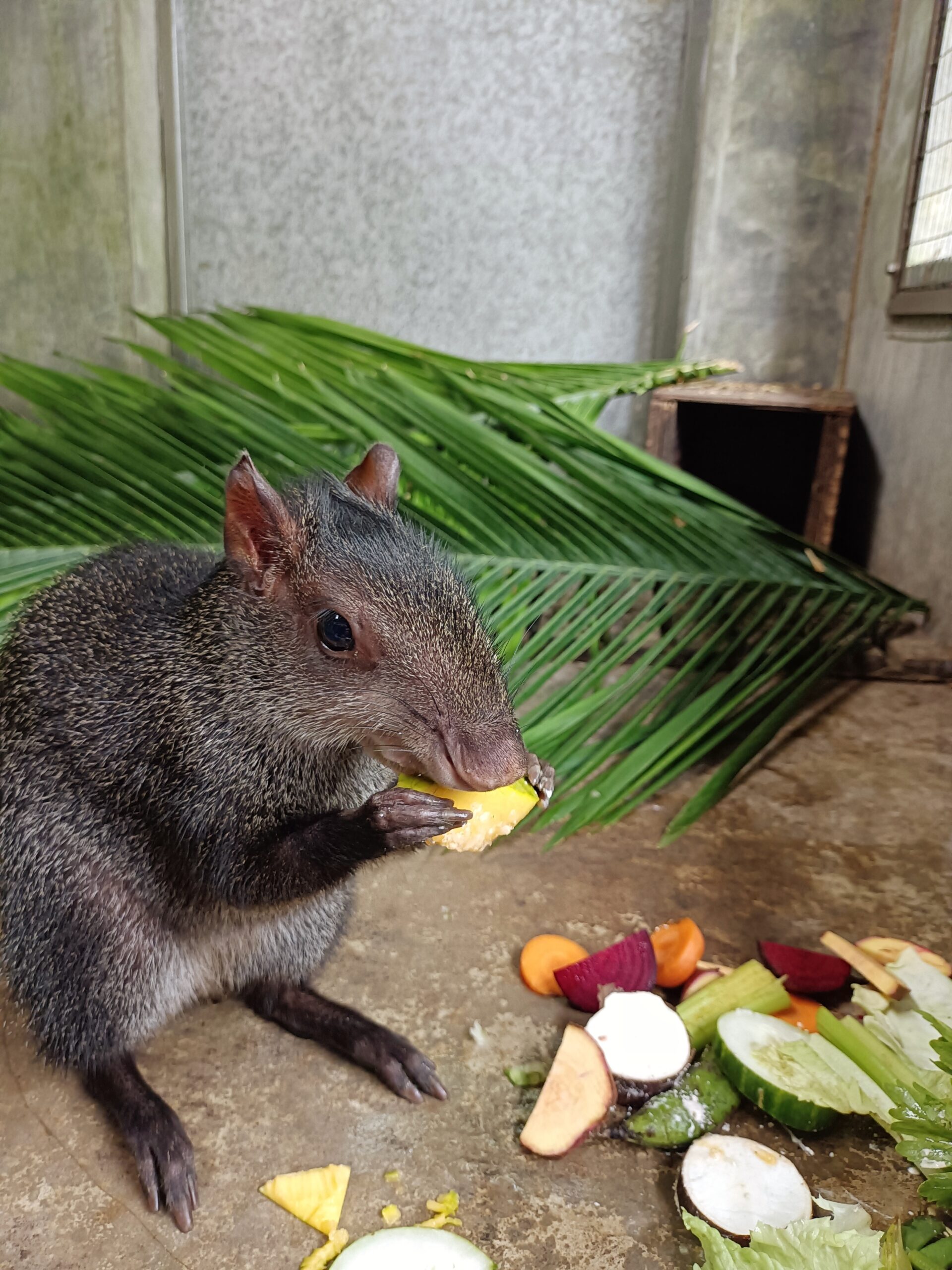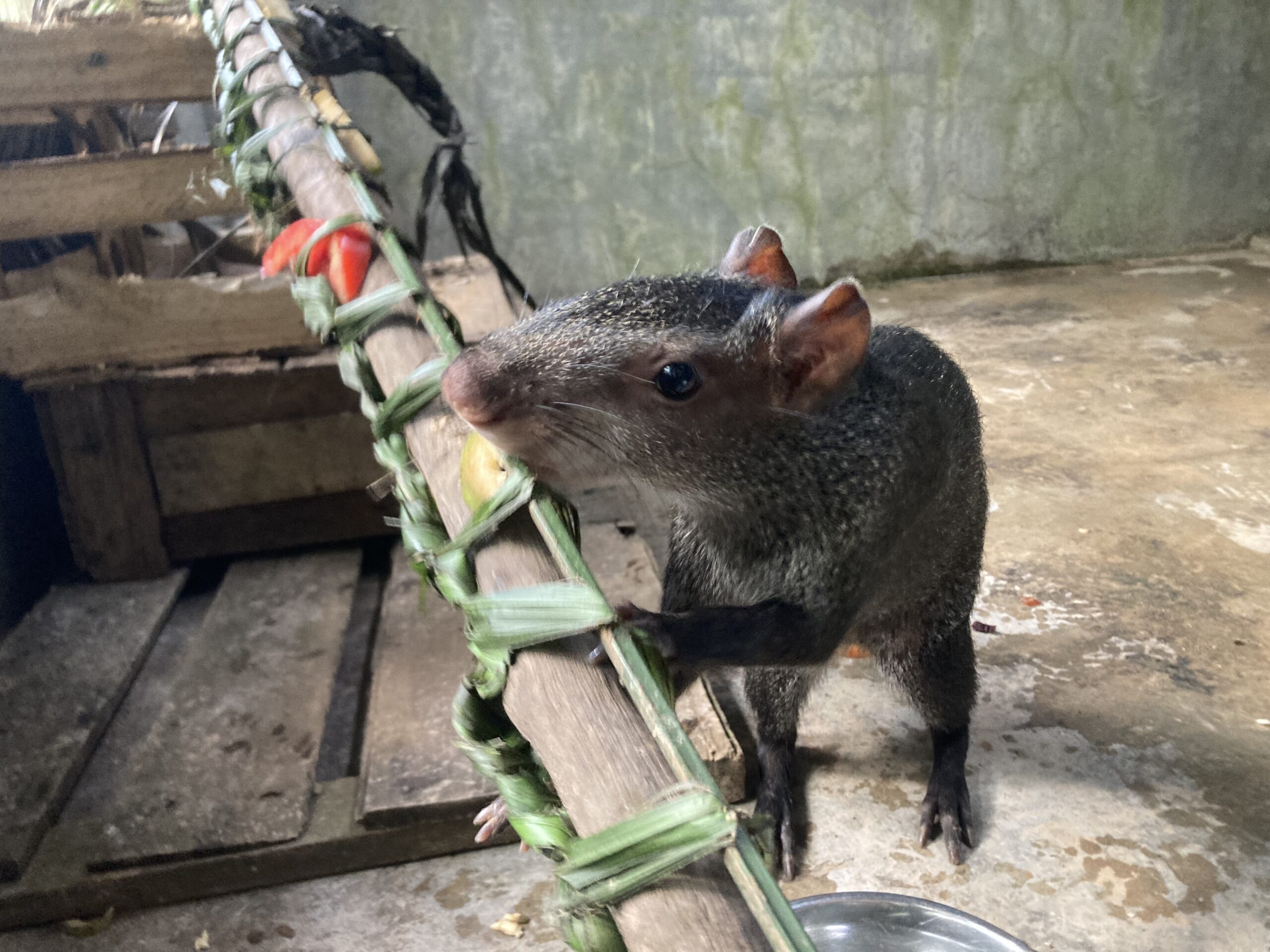 A group of volunteers were walking around Curimana, enjoying their day off, not a speck of animal poo in sight. Sweet relief, they thought. Well, that didn’t last long as a local found them and entrusted them with a young animal. Thus shopping for sweets had to wait and the small female agouti, Kampari, was safely put in one of their rucksacks! Time for this agouti to go back to her natural habitat. With so many tortoises in quarantine, Kampari is staying in the clinic. Tame as she is, being raised in a household, she enjoys all the enrichment and attention we can give her.