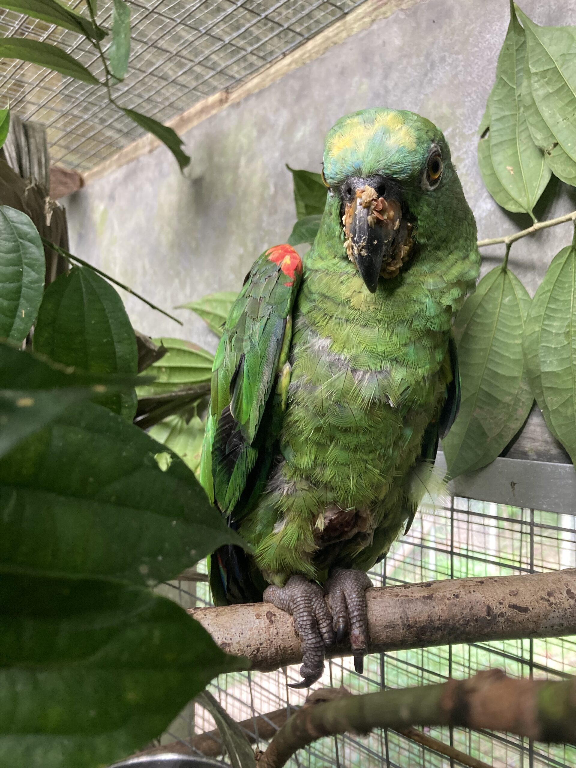Zuna (yellow crowned Amazon), was only shortly back in the big aviary Elmo, as she had to be admitted to the clinic again with a nasty breast wound. Healing will take some time, but luckily, she doesn’t mind the extra attention, making sweet sounds when we bring her food or enrichments.